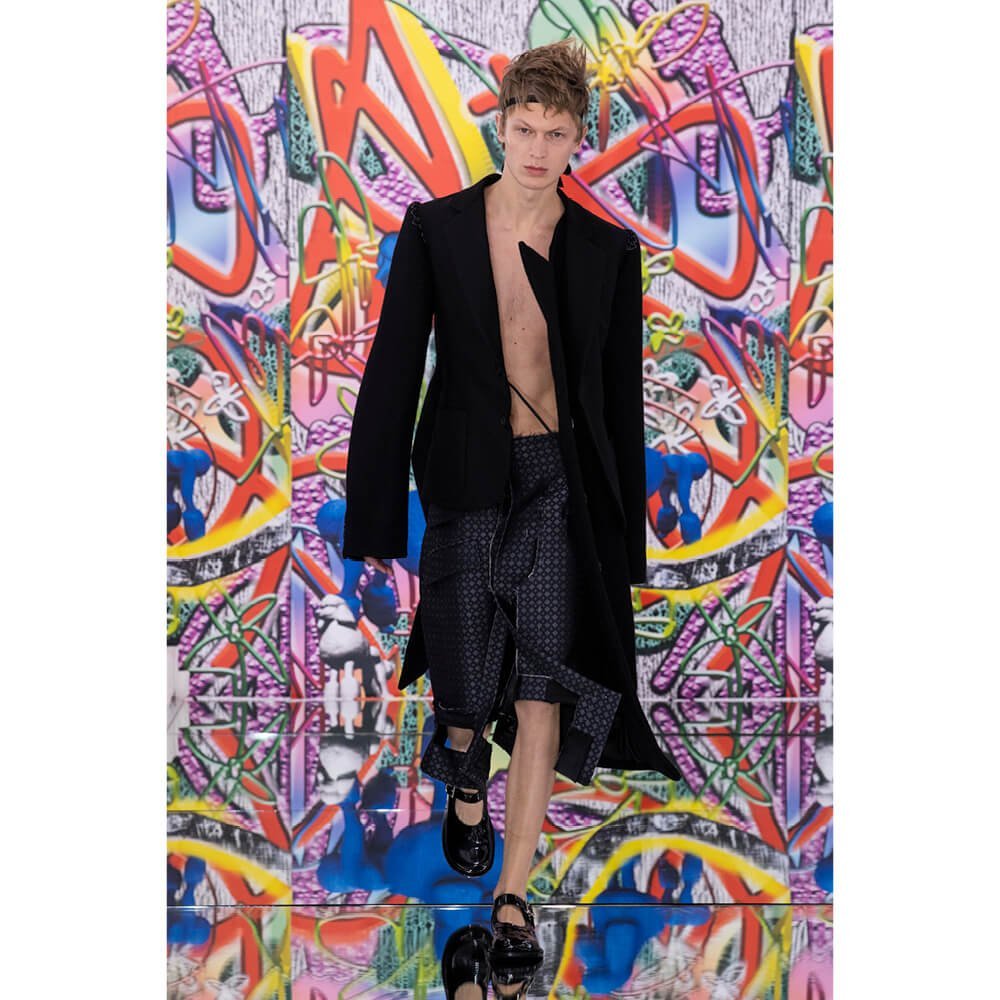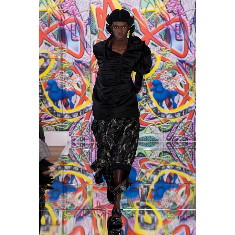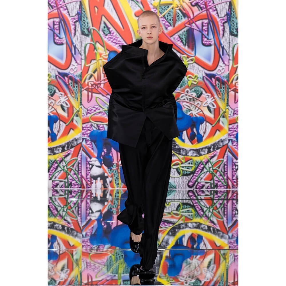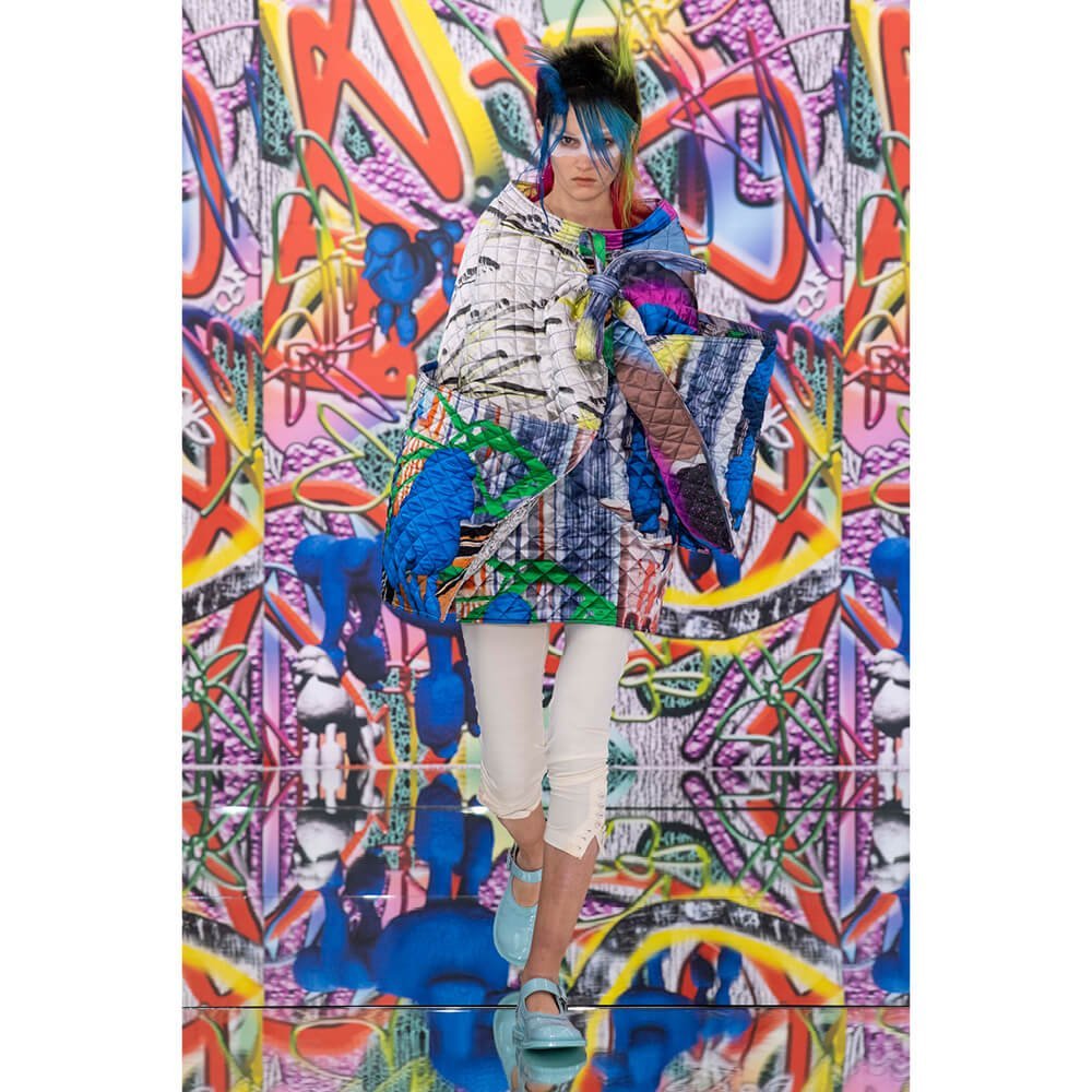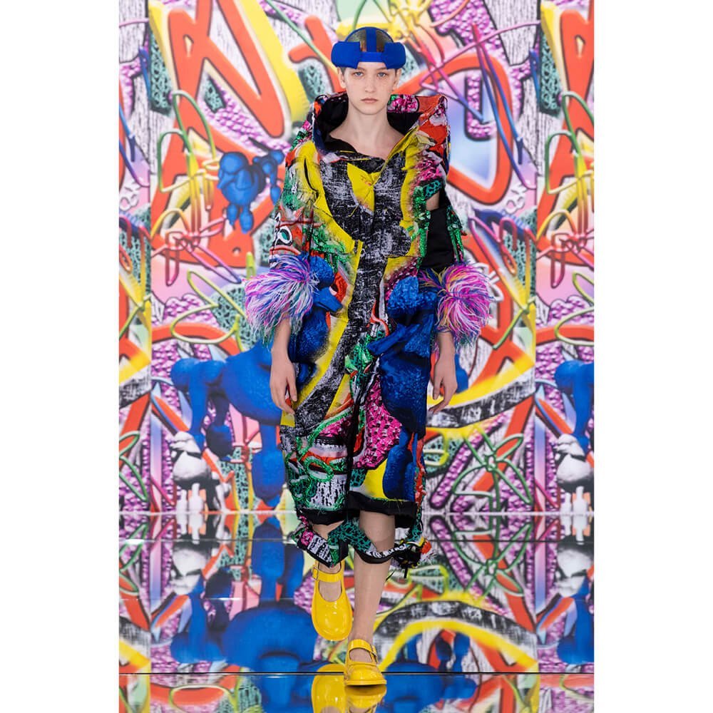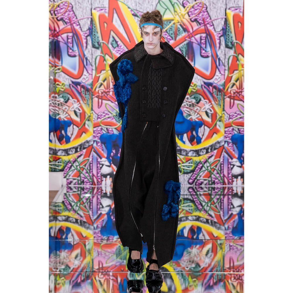 But first he had to create chaos. A mirrored floor reflected the ceiling daubed with digital graffiti and a strange blue poodle motif. The first outfit was made of an exploded jacquard of the ceiling graffiti, it’s colourful strands unpicked to create a lavish fringe. Tailored coats and culottes had windows spliced out of them to reveal the layer beneath and trousers migrated up the body to form a dress, worn by a boy. This co-ed show was gender fluid, epitomised by the many onesies, often worn with the arms inside the garment so they looked like strange bags, (or straight jackets). There was method in the madness. The idea was to mirror the digital culture overload and overwhelm the senses. It worked. Charles Jeffrey, front row and seeing his first ever Galliano show, (and surely an heir to Galliano’s unbridled fashion creativity), talked of the goosebumps moments he had during the show. “It’s so inspiring,” he said. That it is.