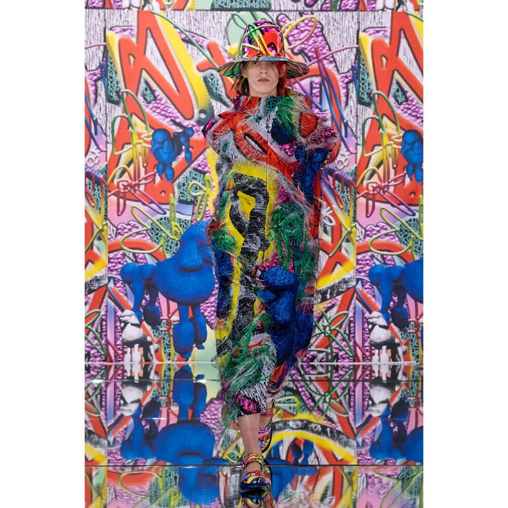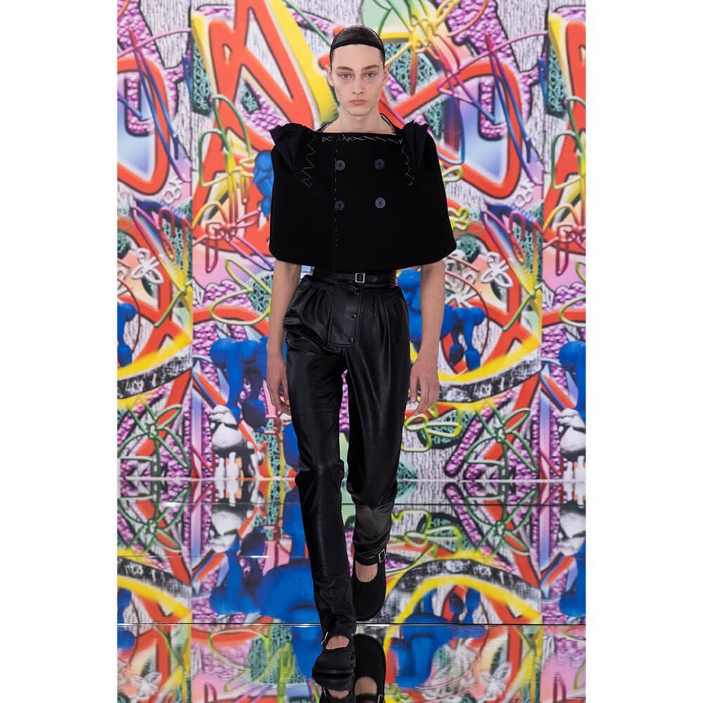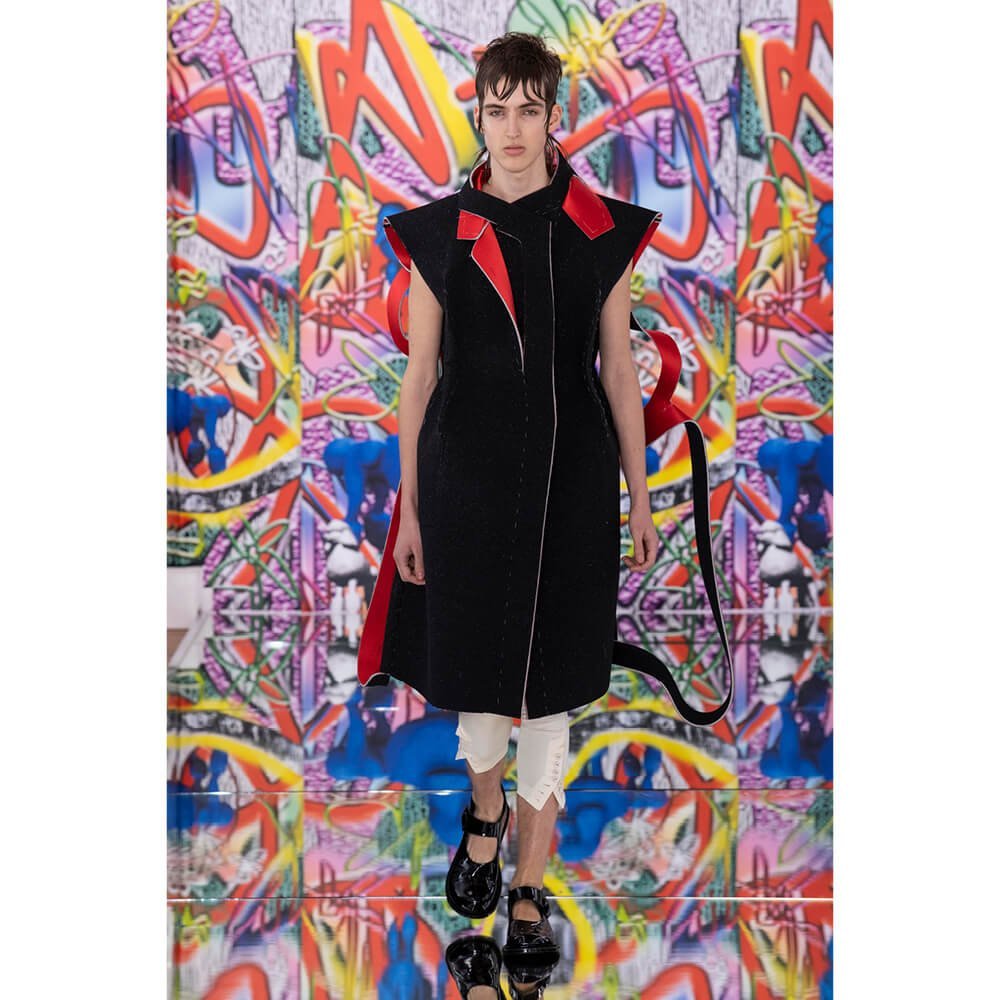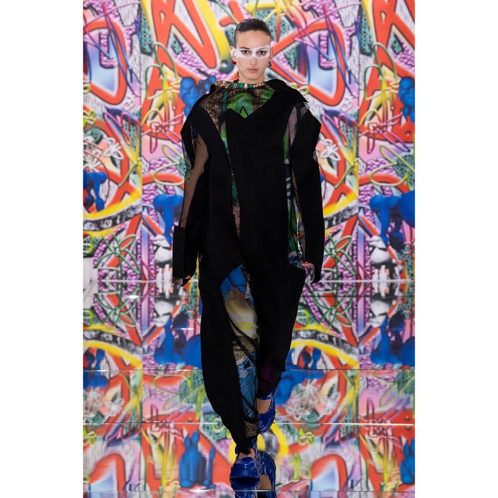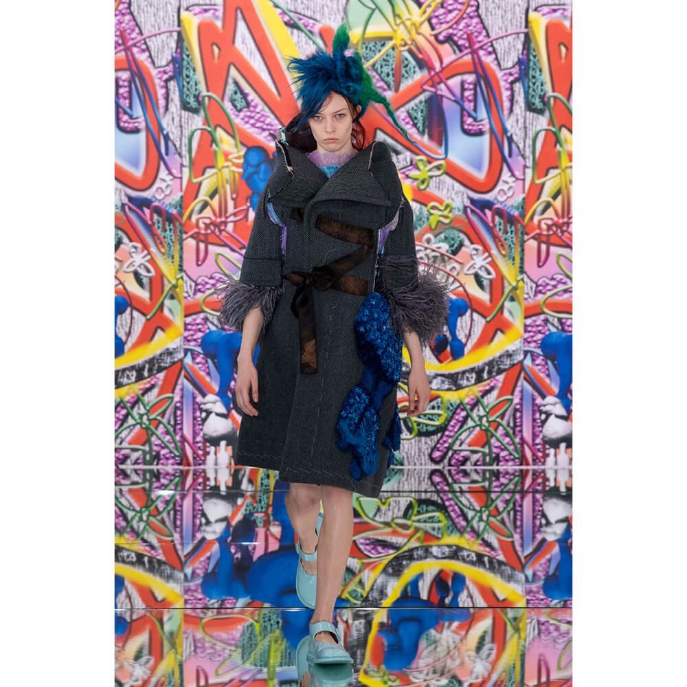 But first he had to create chaos. A mirrored floor reflected the ceiling daubed with digital graffiti and a strange blue poodle motif. The first outfit was made of an exploded jacquard of the ceiling graffiti, it’s colourful strands unpicked to create a lavish fringe. Tailored coats and culottes had windows spliced out of them to reveal the layer beneath and trousers migrated up the body to form a dress, worn by a boy. This co-ed show was gender fluid, epitomised by the many onesies, often worn with the arms inside the garment so they looked like strange bags, (or straight jackets). There was method in the madness. The idea was to mirror the digital culture overload and overwhelm the senses. It worked. Charles Jeffrey, front row and seeing his first ever Galliano show, (and surely an heir to Galliano’s unbridled fashion creativity), talked of the goosebumps moments he had during the show. “It’s so inspiring,” he said. That it is.