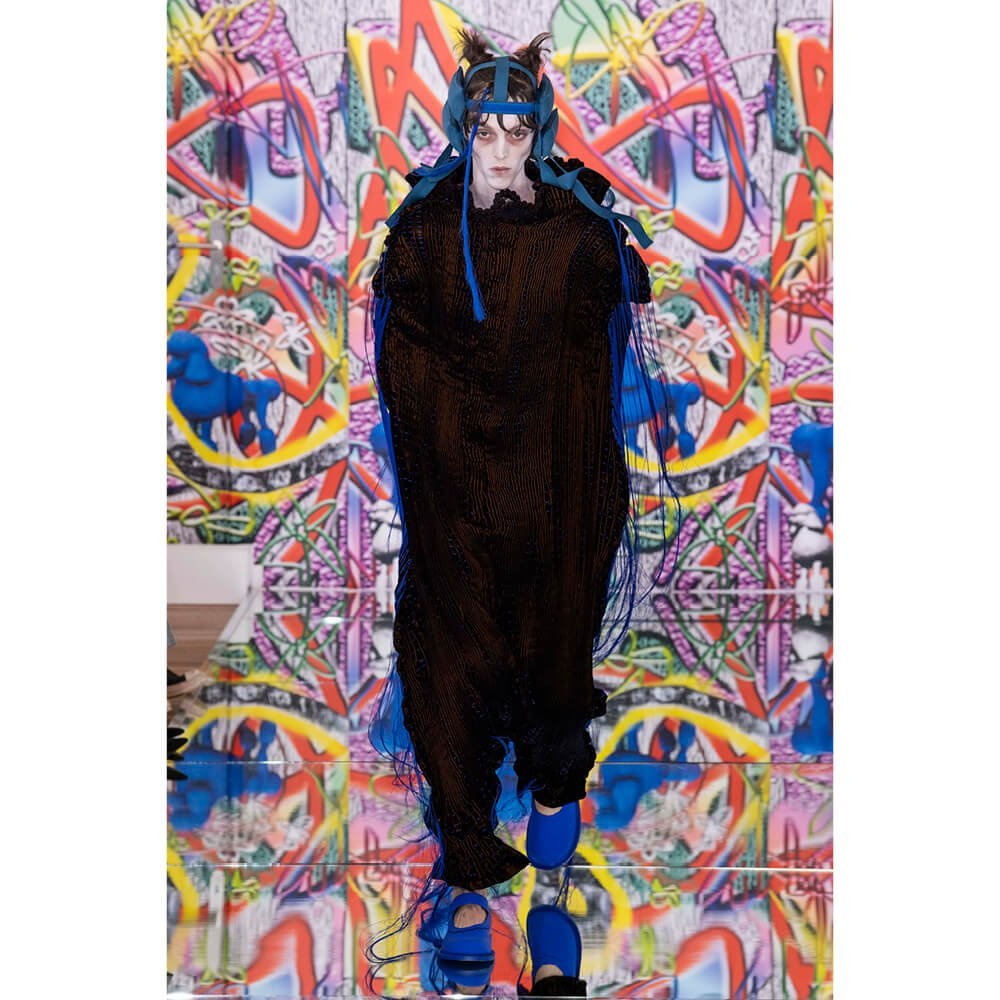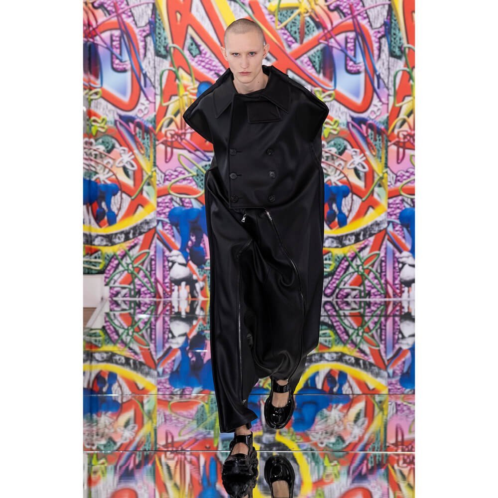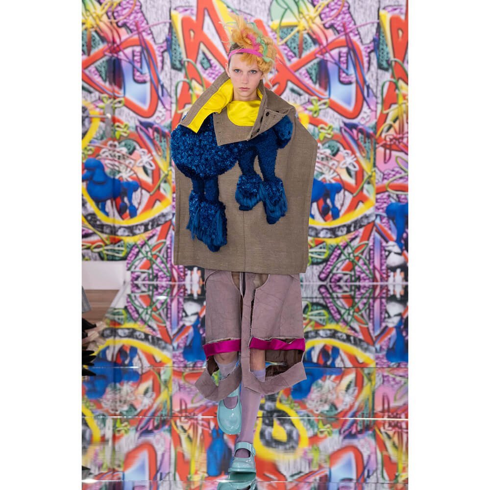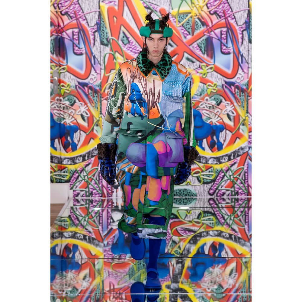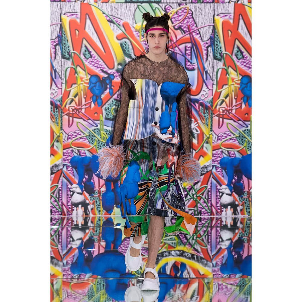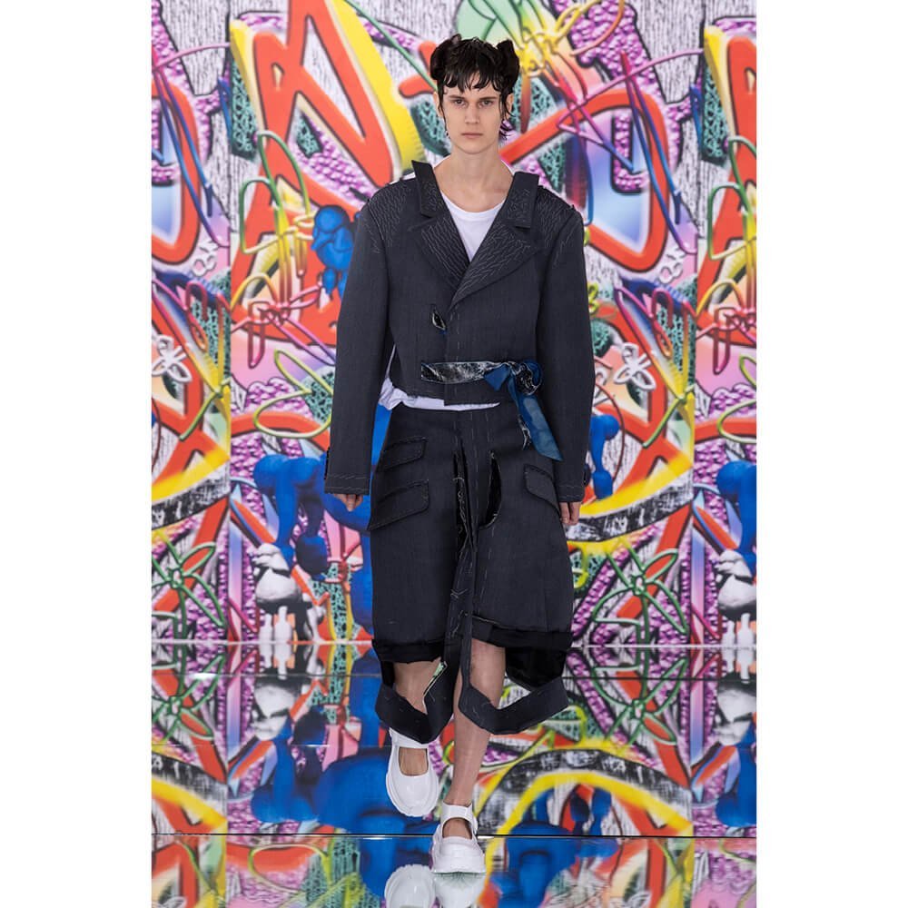 But first he had to create chaos. A mirrored floor reflected the ceiling daubed with digital graffiti and a strange blue poodle motif. The first outfit was made of an exploded jacquard of the ceiling graffiti, it’s colourful strands unpicked to create a lavish fringe. Tailored coats and culottes had windows spliced out of them to reveal the layer beneath and trousers migrated up the body to form a dress, worn by a boy. This co-ed show was gender fluid, epitomised by the many onesies, often worn with the arms inside the garment so they looked like strange bags, (or straight jackets). There was method in the madness. The idea was to mirror the digital culture overload and overwhelm the senses. It worked. Charles Jeffrey, front row and seeing his first ever Galliano show, (and surely an heir to Galliano’s unbridled fashion creativity), talked of the goosebumps moments he had during the show. “It’s so inspiring,” he said. That it is.