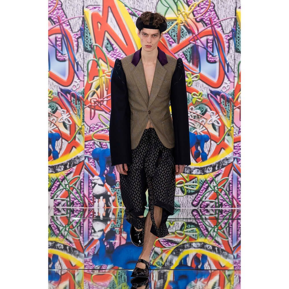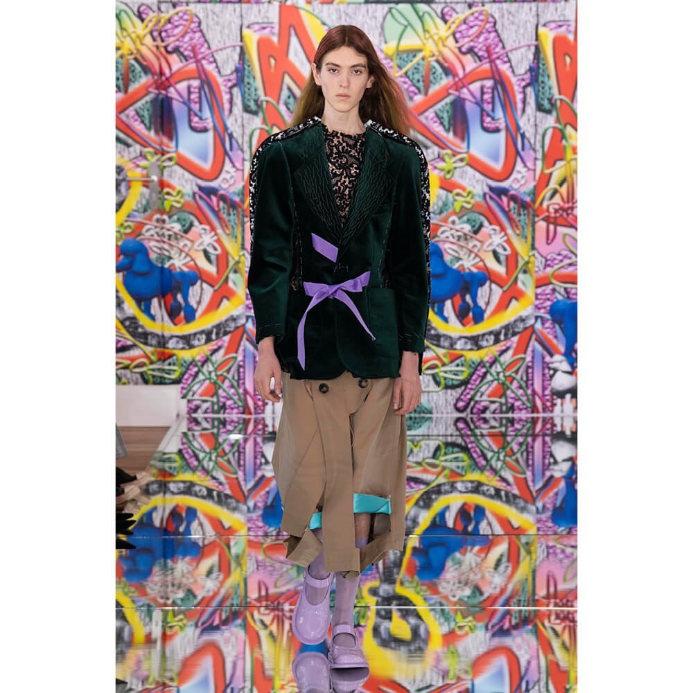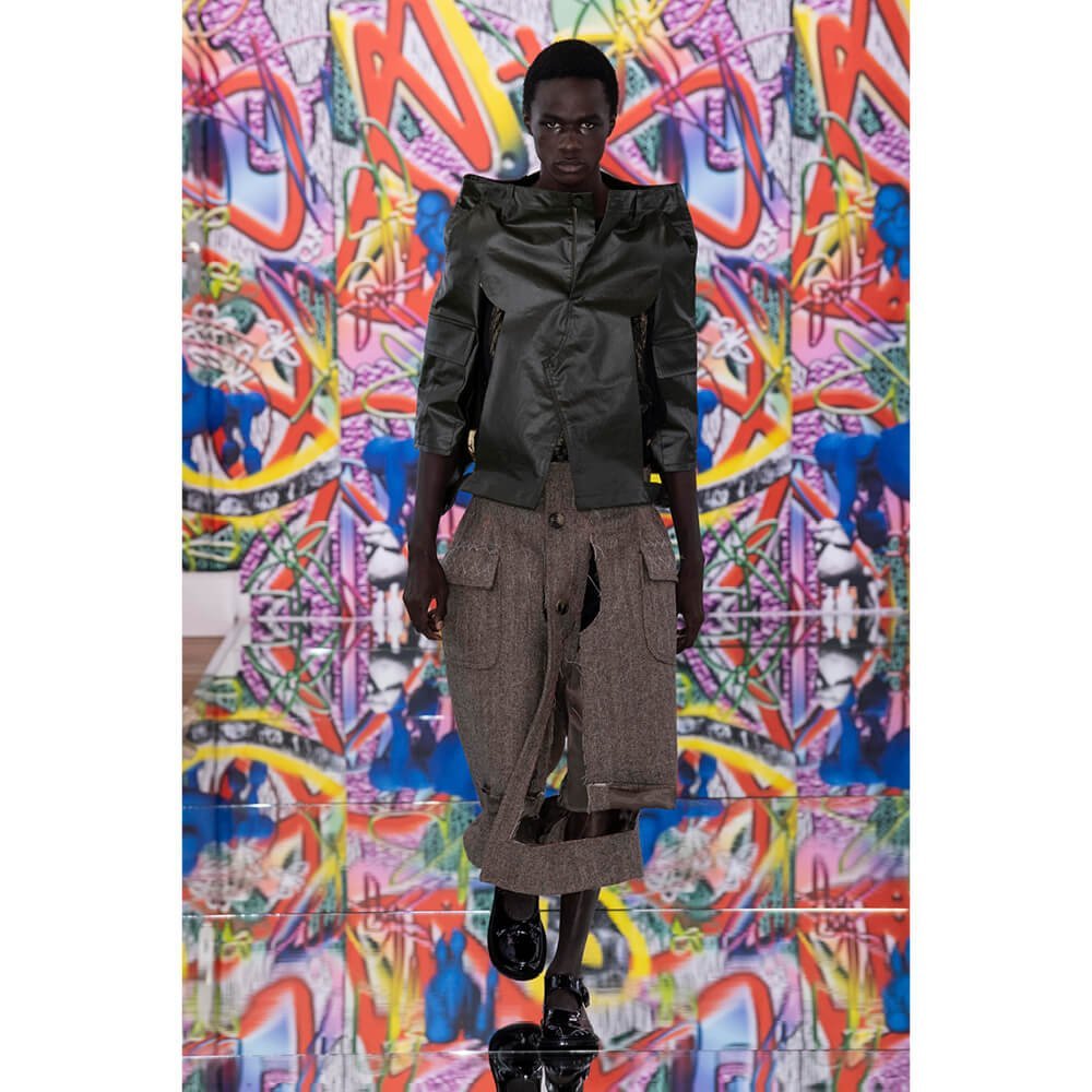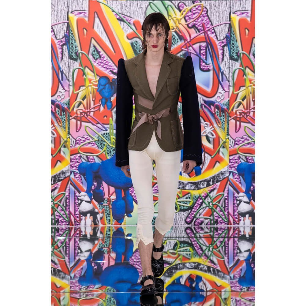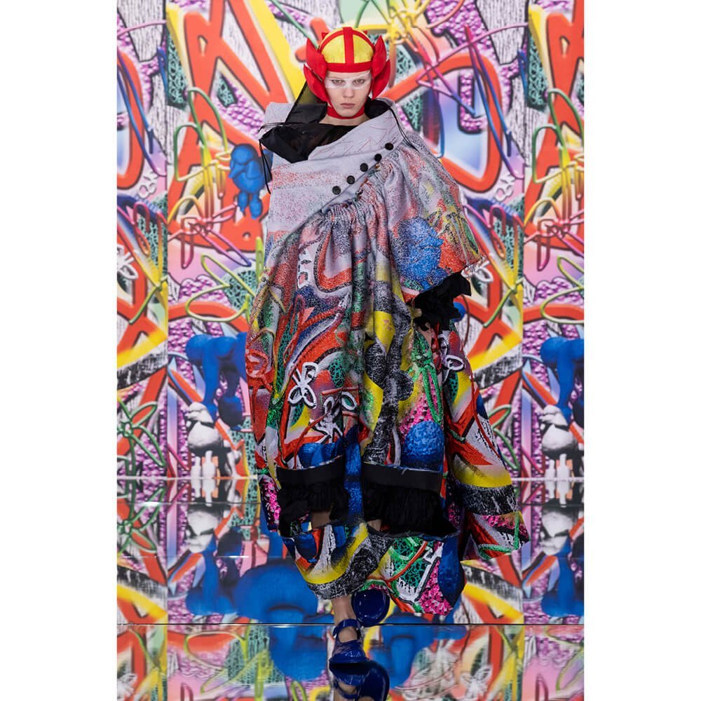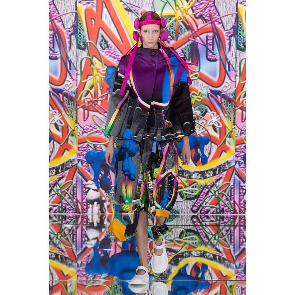 But first he had to create chaos. A mirrored floor reflected the ceiling daubed with digital graffiti and a strange blue poodle motif. The first outfit was made of an exploded jacquard of the ceiling graffiti, it’s colourful strands unpicked to create a lavish fringe. Tailored coats and culottes had windows spliced out of them to reveal the layer beneath and trousers migrated up the body to form a dress, worn by a boy. This co-ed show was gender fluid, epitomised by the many onesies, often worn with the arms inside the garment so they looked like strange bags, (or straight jackets). There was method in the madness. The idea was to mirror the digital culture overload and overwhelm the senses. It worked. Charles Jeffrey, front row and seeing his first ever Galliano show, (and surely an heir to Galliano’s unbridled fashion creativity), talked of the goosebumps moments he had during the show. “It’s so inspiring,” he said. That it is.