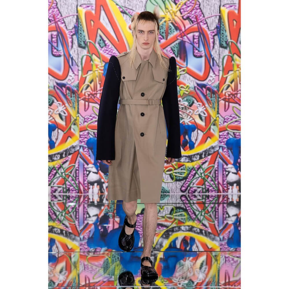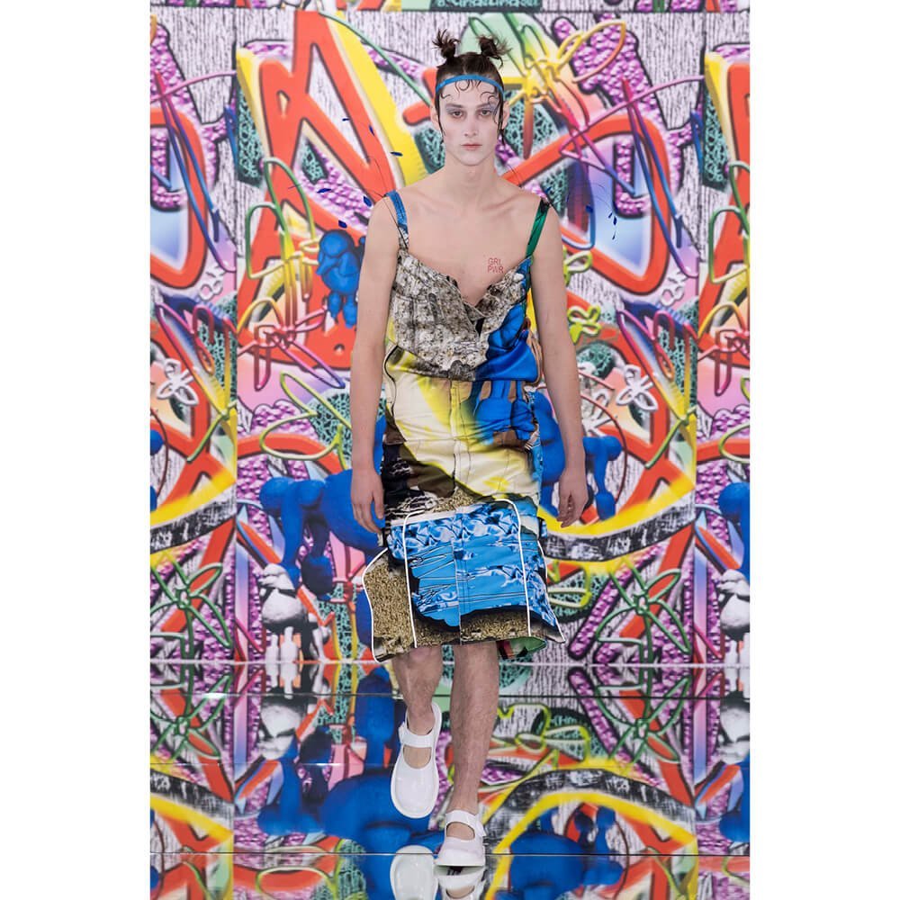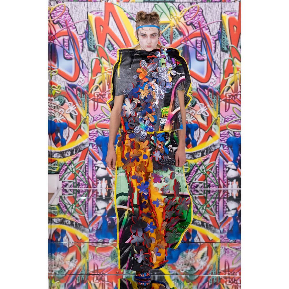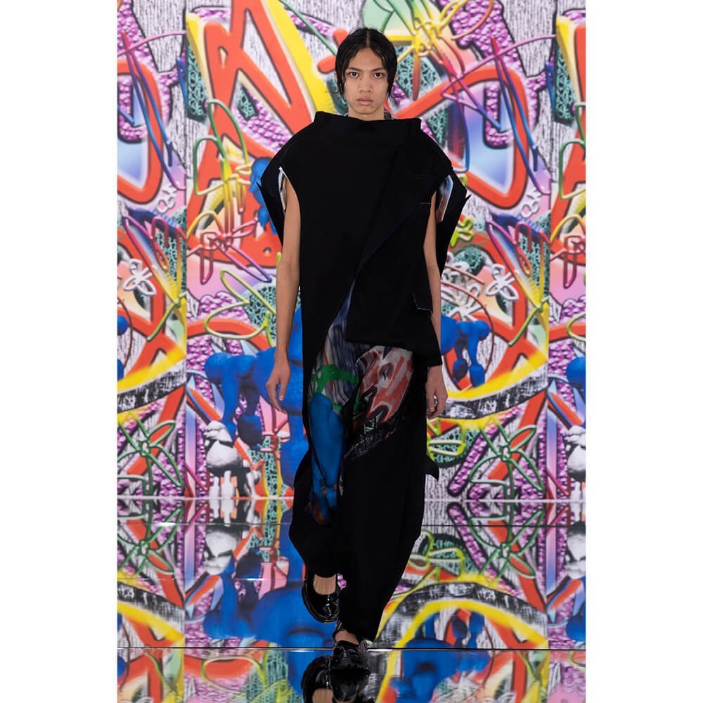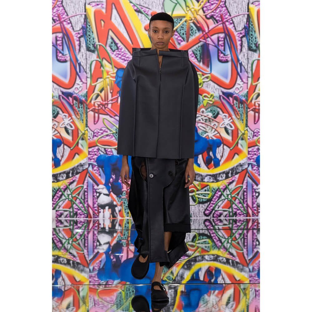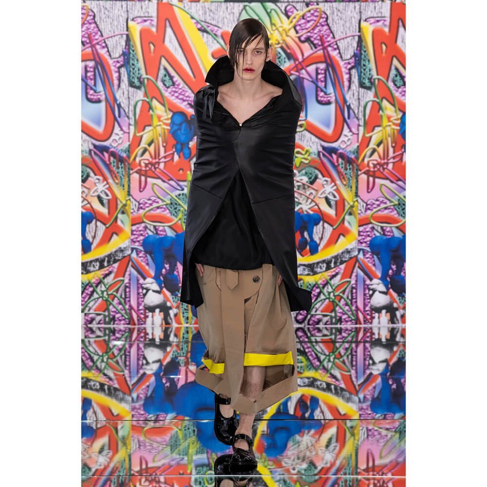 But first he had to create chaos. A mirrored floor reflected the ceiling daubed with digital graffiti and a strange blue poodle motif. The first outfit was made of an exploded jacquard of the ceiling graffiti, it’s colourful strands unpicked to create a lavish fringe. Tailored coats and culottes had windows spliced out of them to reveal the layer beneath and trousers migrated up the body to form a dress, worn by a boy. This co-ed show was gender fluid, epitomised by the many onesies, often worn with the arms inside the garment so they looked like strange bags, (or straight jackets). There was method in the madness. The idea was to mirror the digital culture overload and overwhelm the senses. It worked. Charles Jeffrey, front row and seeing his first ever Galliano show, (and surely an heir to Galliano’s unbridled fashion creativity), talked of the goosebumps moments he had during the show. “It’s so inspiring,” he said. That it is.