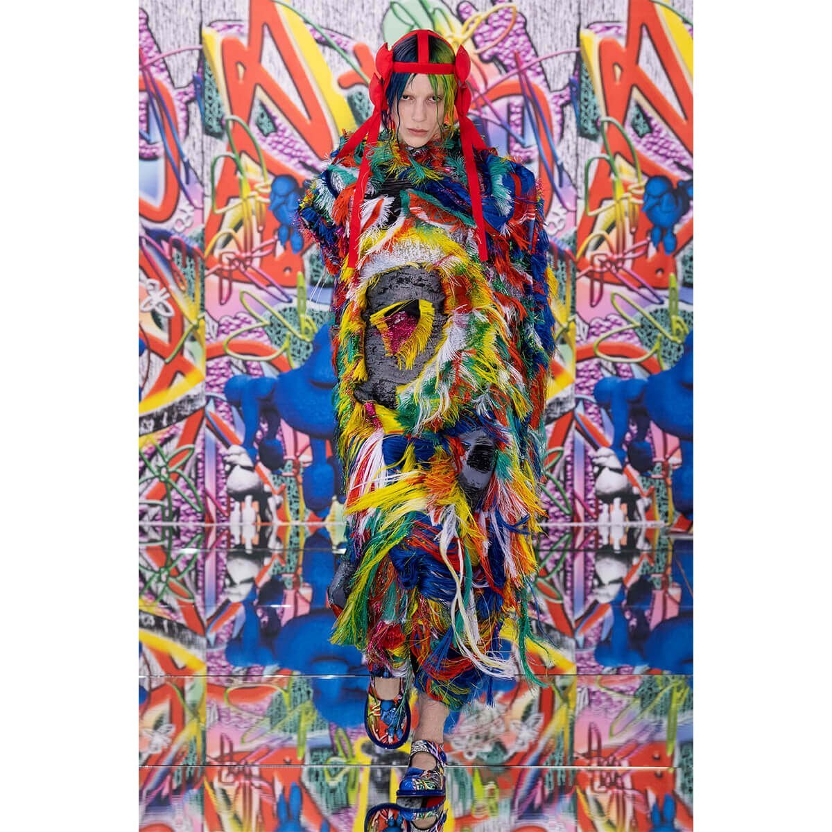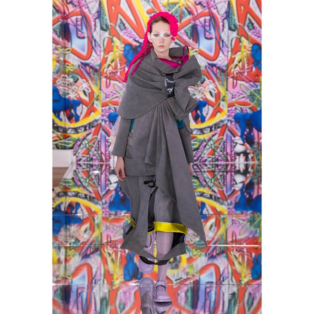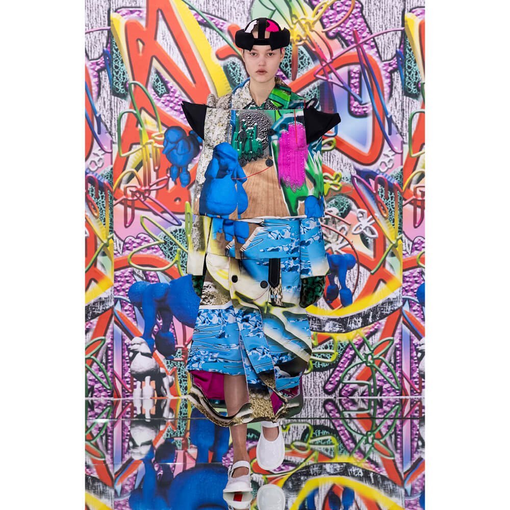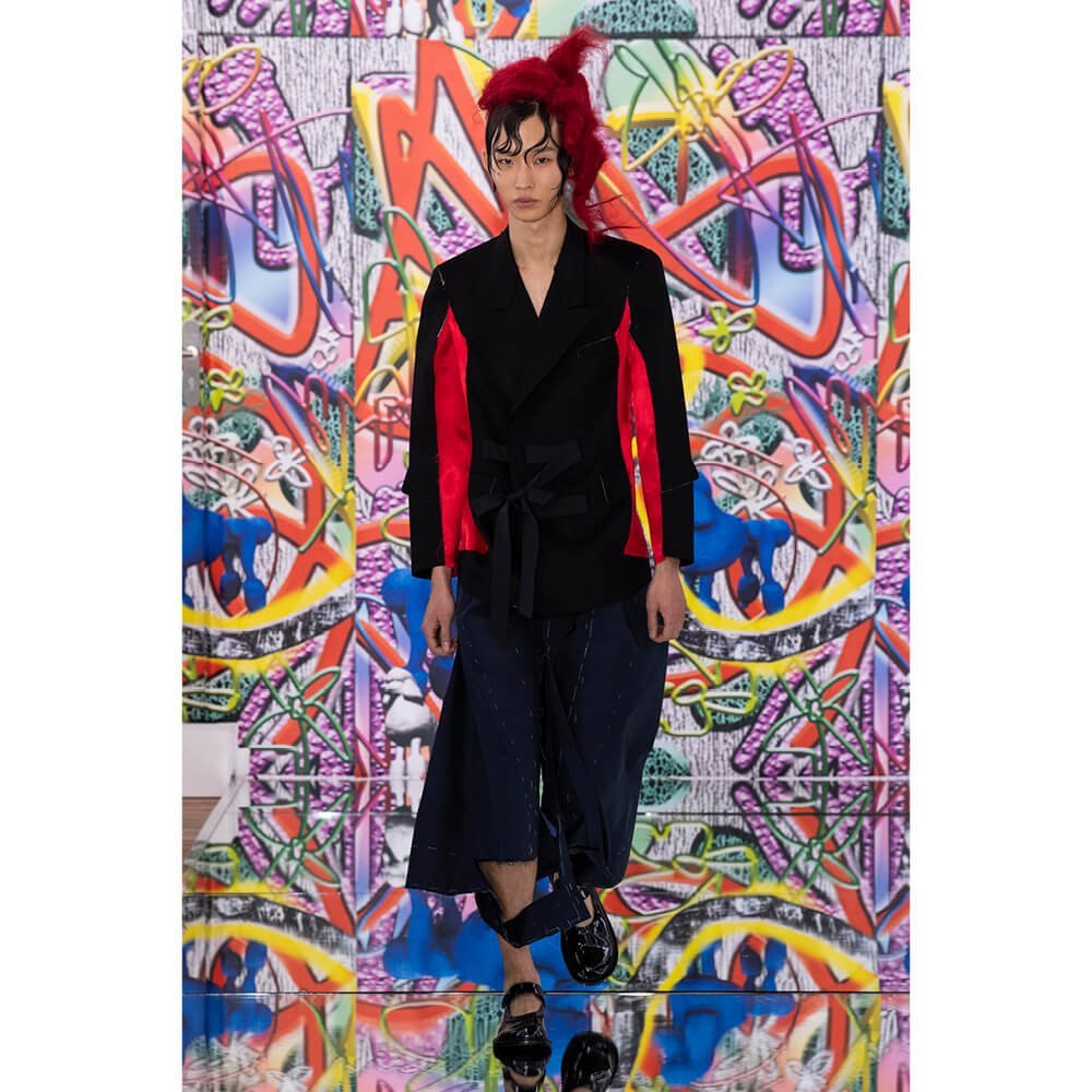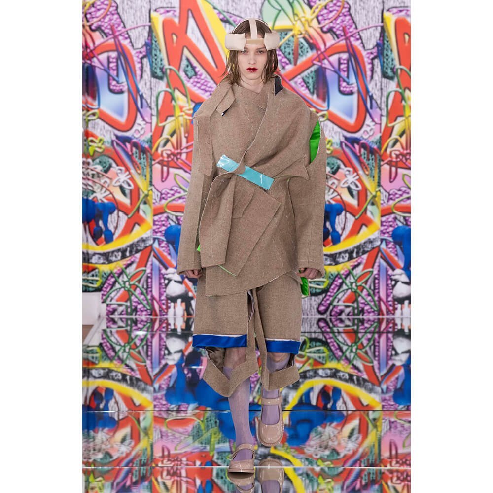 But first he had to create chaos. A mirrored floor reflected the ceiling daubed with digital graffiti and a strange blue poodle motif. The first outfit was made of an exploded jacquard of the ceiling graffiti, it’s colourful strands unpicked to create a lavish fringe. Tailored coats and culottes had windows spliced out of them to reveal the layer beneath and trousers migrated up the body to form a dress, worn by a boy. This co-ed show was gender fluid, epitomised by the many onesies, often worn with the arms inside the garment so they looked like strange bags, (or straight jackets). There was method in the madness. The idea was to mirror the digital culture overload and overwhelm the senses. It worked. Charles Jeffrey, front row and seeing his first ever Galliano show, (and surely an heir to Galliano’s unbridled fashion creativity), talked of the goosebumps moments he had during the show. “It’s so inspiring,” he said. That it is.