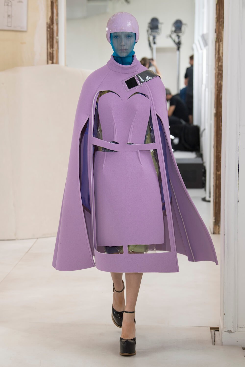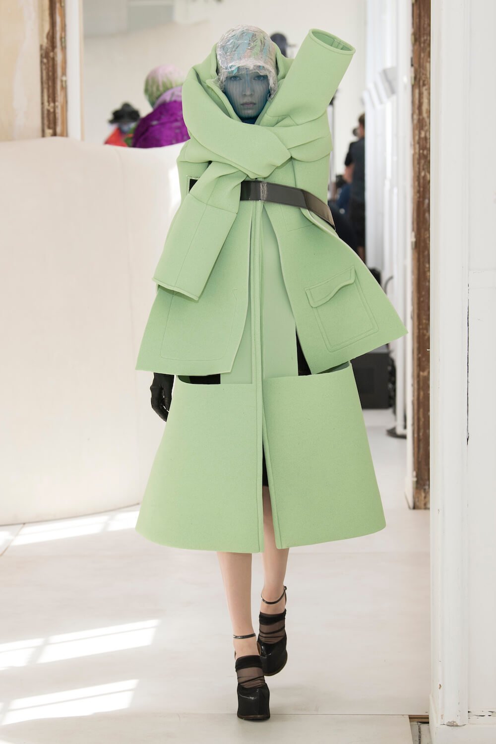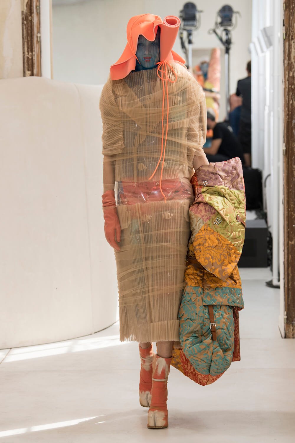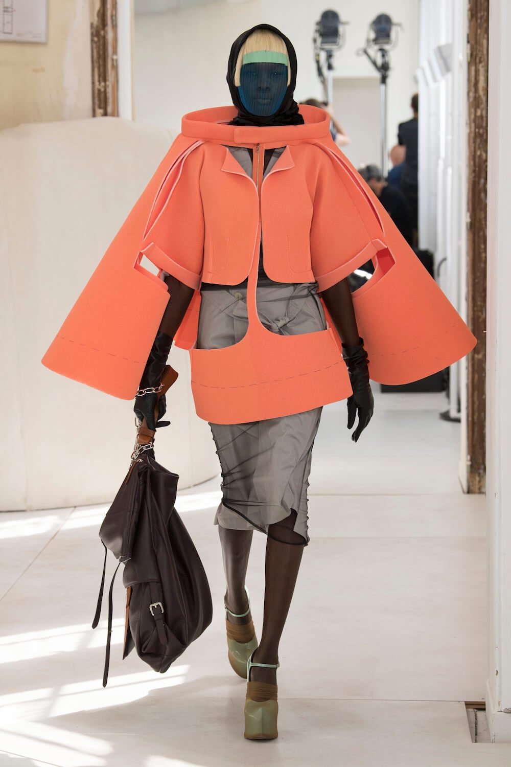 “Nomadic glamour,” intoned John Galliano on his Maison Margiela artisanal pre-show podcast (a brilliant innovation – the designer explains his motivations and techniques in his distinctive, dramatic drawl). “We’re all nomads now,” he said and created layered-up looks as if the models were wearing their most precious possessions (including iPhones strapped to their legs and TV screens embedded into bags). He’s been exploring the idea of “a new glamour” for three seasons now, unpicking traditional codes and remaking them in a unique, highly crafted ways. “We gave ourselves a real work out in the atelier,” he said of the intense experimentation that goes into his artisanal collections. The first look was a fifties dirndl skirt in a delicious MaxFactor coral lipstick colour (the glamour element). Galliano spliced into it then put it on the shoulders instead of the waist and it suddenly became a jacket. The designer dubbed this migratory concept “reverse dressing.” He created experimental volumes, layering looks into bundles on the body, as if the wearer had dressed in haste, grabbed the nearest thing and adapted them to their needs – a patchwork quilt for a coat and a silken versions of Jiffy bags ingeniously doubling as pockets. “Volumes. That’s what makes fashion move forward. It’s the volumes that make the difference,” said the designer who will adapt these silhouettes for his ready-wear. Some pieces were made with recycled off-cuts from other luxury houses, others were sheer so that their inner workings (and Galliano’s cutting skills) were on display. Galliano gets to the artistic essence of couture. It’s not about the expensive trapping of ladies who lunch or matching your jewellery to your dress. For him it’s a crucible of ideas and that’s the greatest luxury of all.