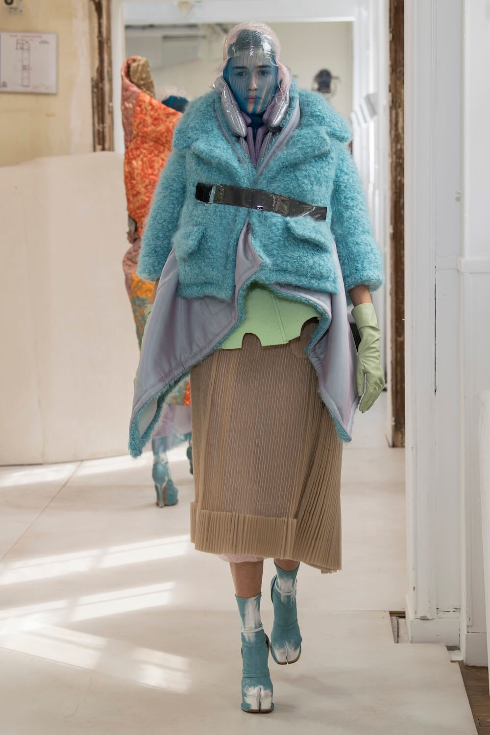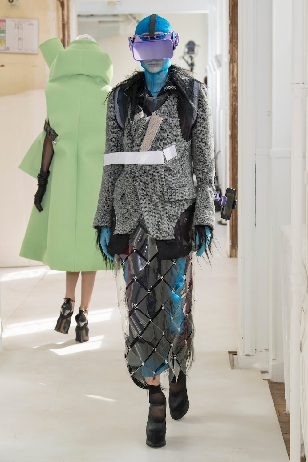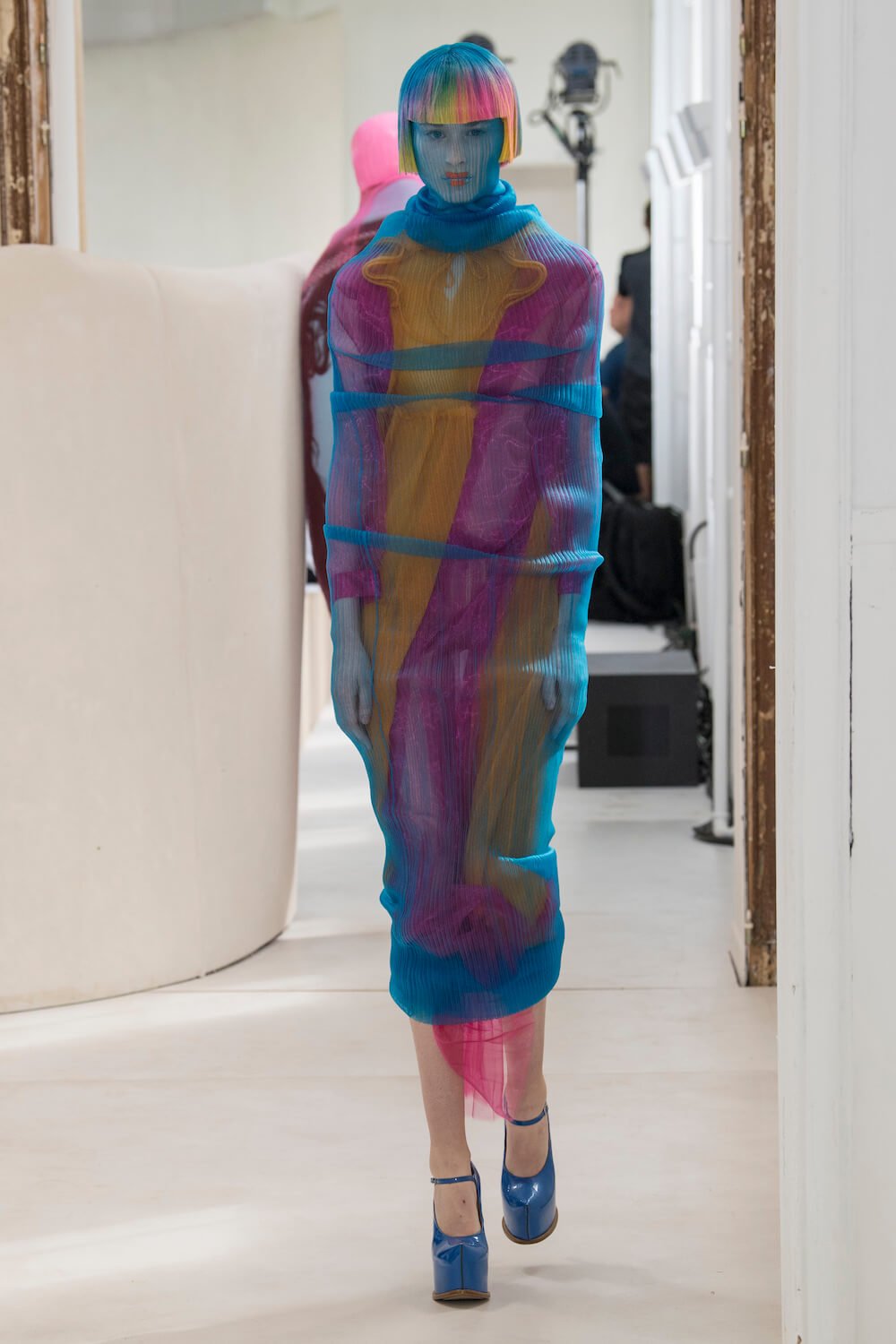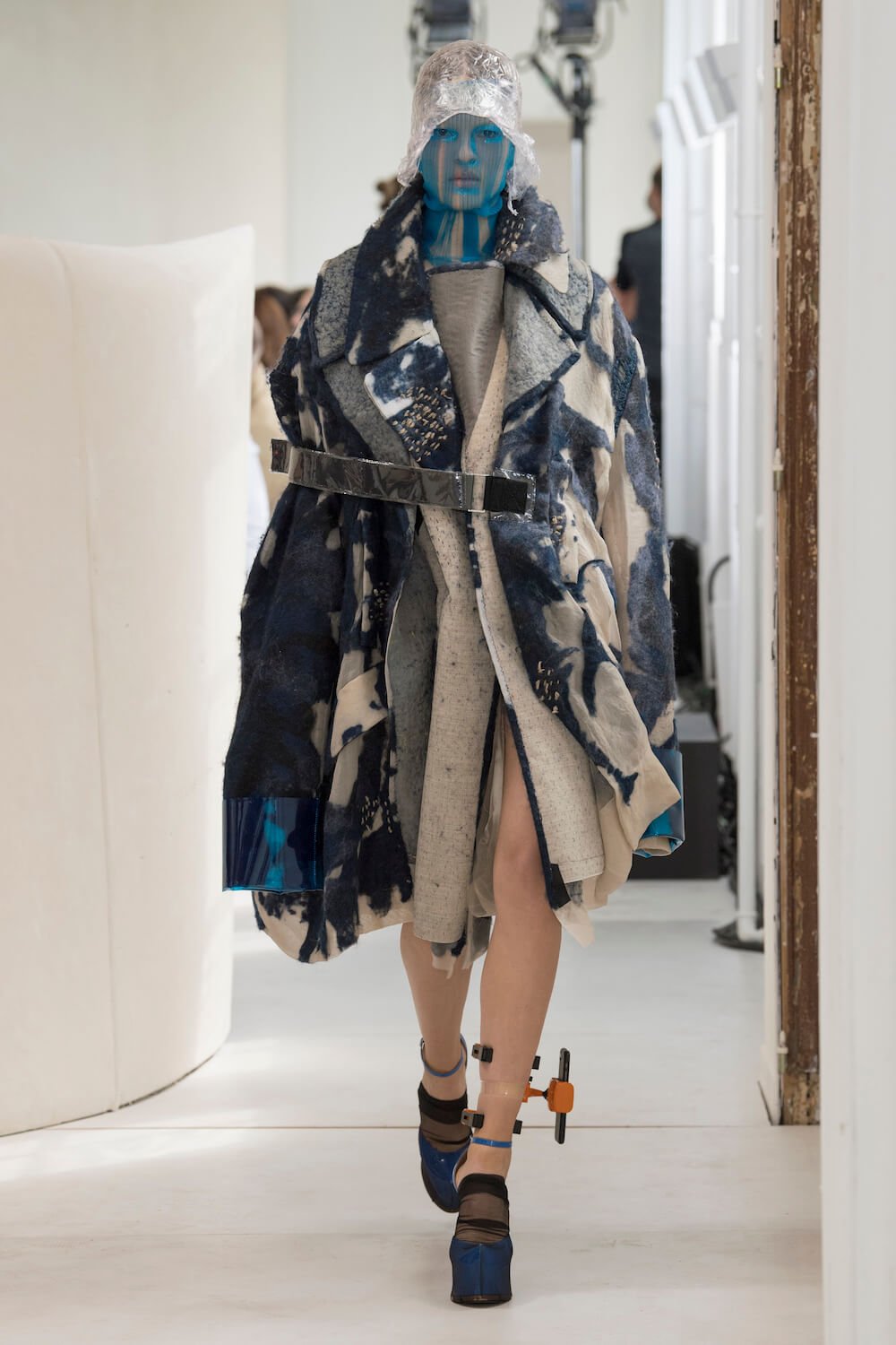 “Nomadic glamour,” intoned John Galliano on his Maison Margiela artisanal pre-show podcast (a brilliant innovation – the designer explains his motivations and techniques in his distinctive, dramatic drawl). “We’re all nomads now,” he said and created layered-up looks as if the models were wearing their most precious possessions (including iPhones strapped to their legs and TV screens embedded into bags). He’s been exploring the idea of “a new glamour” for three seasons now, unpicking traditional codes and remaking them in a unique, highly crafted ways. “We gave ourselves a real work out in the atelier,” he said of the intense experimentation that goes into his artisanal collections. The first look was a fifties dirndl skirt in a delicious MaxFactor coral lipstick colour (the glamour element). Galliano spliced into it then put it on the shoulders instead of the waist and it suddenly became a jacket. The designer dubbed this migratory concept “reverse dressing.” He created experimental volumes, layering looks into bundles on the body, as if the wearer had dressed in haste, grabbed the nearest thing and adapted them to their needs – a patchwork quilt for a coat and a silken versions of Jiffy bags ingeniously doubling as pockets. “Volumes. That’s what makes fashion move forward. It’s the volumes that make the difference,” said the designer who will adapt these silhouettes for his ready-wear. Some pieces were made with recycled off-cuts from other luxury houses, others were sheer so that their inner workings (and Galliano’s cutting skills) were on display. Galliano gets to the artistic essence of couture. It’s not about the expensive trapping of ladies who lunch or matching your jewellery to your dress. For him it’s a crucible of ideas and that’s the greatest luxury of all.