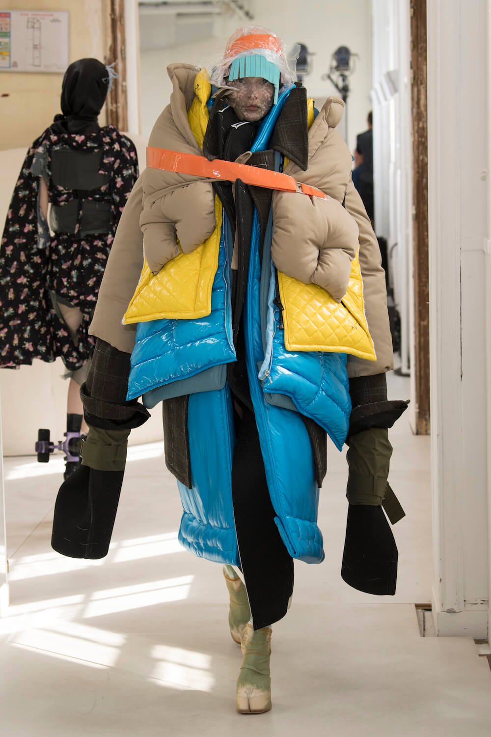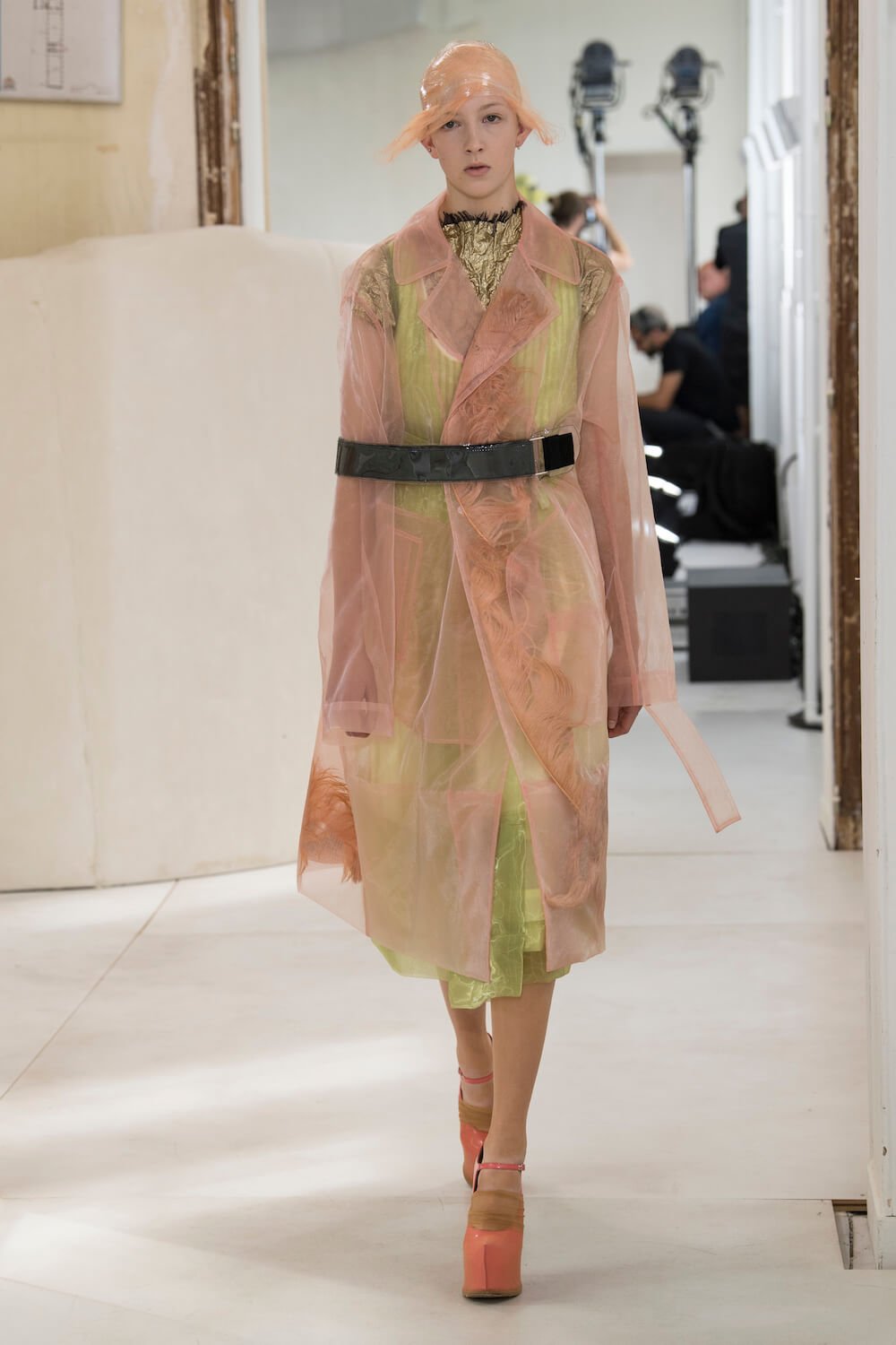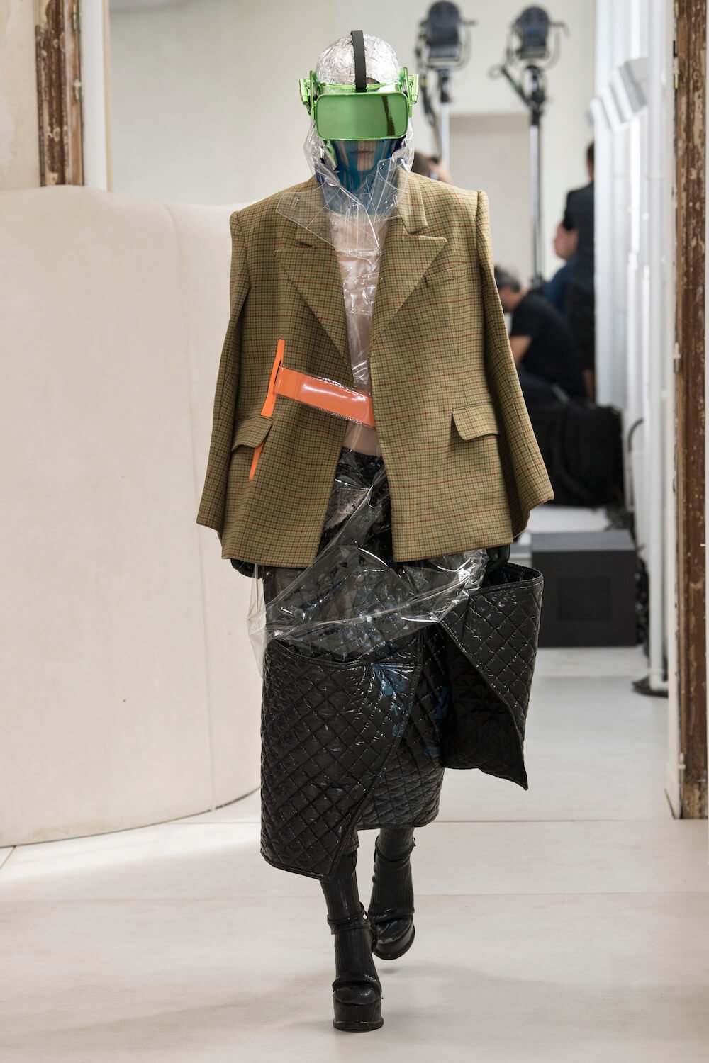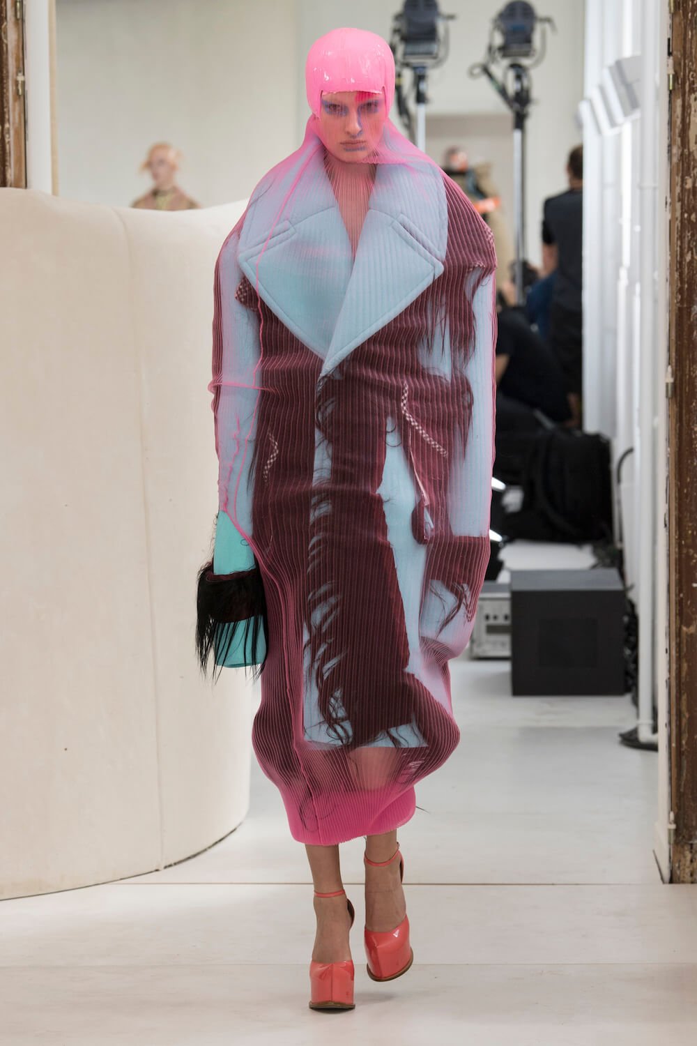 “Nomadic glamour,” intoned John Galliano on his Maison Margiela artisanal pre-show podcast (a brilliant innovation – the designer explains his motivations and techniques in his distinctive, dramatic drawl). “We’re all nomads now,” he said and created layered-up looks as if the models were wearing their most precious possessions (including iPhones strapped to their legs and TV screens embedded into bags). He’s been exploring the idea of “a new glamour” for three seasons now, unpicking traditional codes and remaking them in a unique, highly crafted ways. “We gave ourselves a real work out in the atelier,” he said of the intense experimentation that goes into his artisanal collections. The first look was a fifties dirndl skirt in a delicious MaxFactor coral lipstick colour (the glamour element). Galliano spliced into it then put it on the shoulders instead of the waist and it suddenly became a jacket. The designer dubbed this migratory concept “reverse dressing.” He created experimental volumes, layering looks into bundles on the body, as if the wearer had dressed in haste, grabbed the nearest thing and adapted them to their needs – a patchwork quilt for a coat and a silken versions of Jiffy bags ingeniously doubling as pockets. “Volumes. That’s what makes fashion move forward. It’s the volumes that make the difference,” said the designer who will adapt these silhouettes for his ready-wear. Some pieces were made with recycled off-cuts from other luxury houses, others were sheer so that their inner workings (and Galliano’s cutting skills) were on display. Galliano gets to the artistic essence of couture. It’s not about the expensive trapping of ladies who lunch or matching your jewellery to your dress. For him it’s a crucible of ideas and that’s the greatest luxury of all.