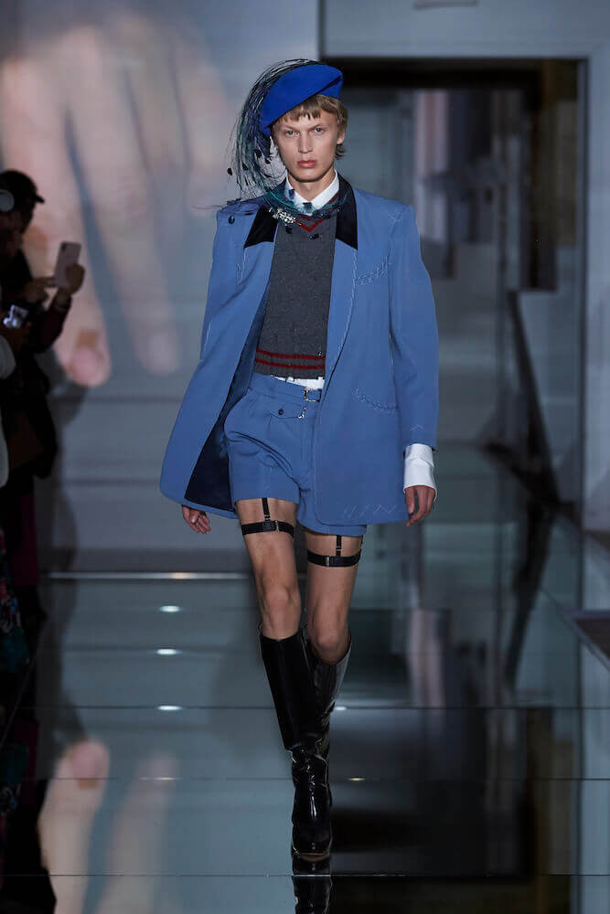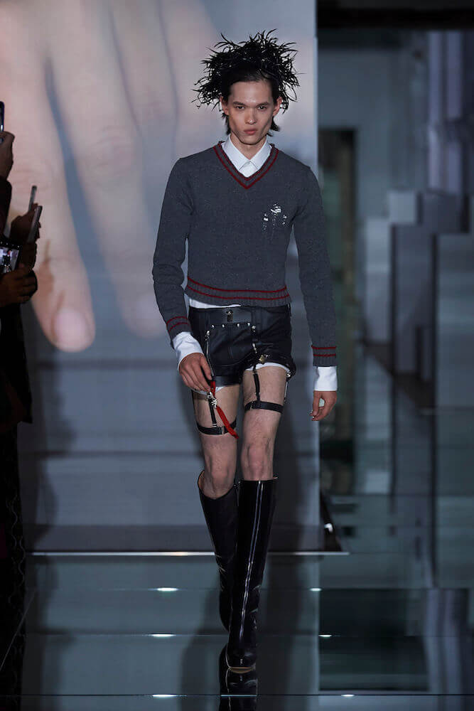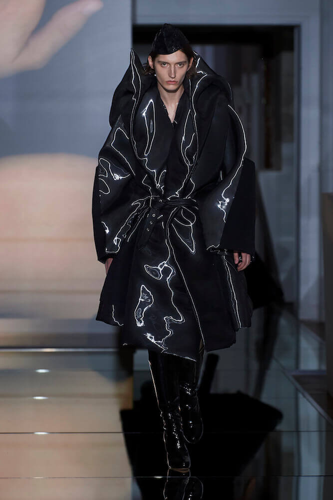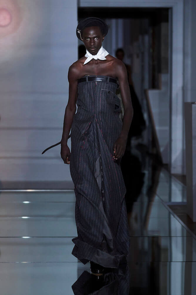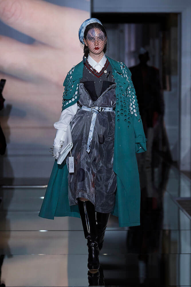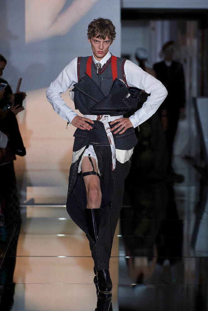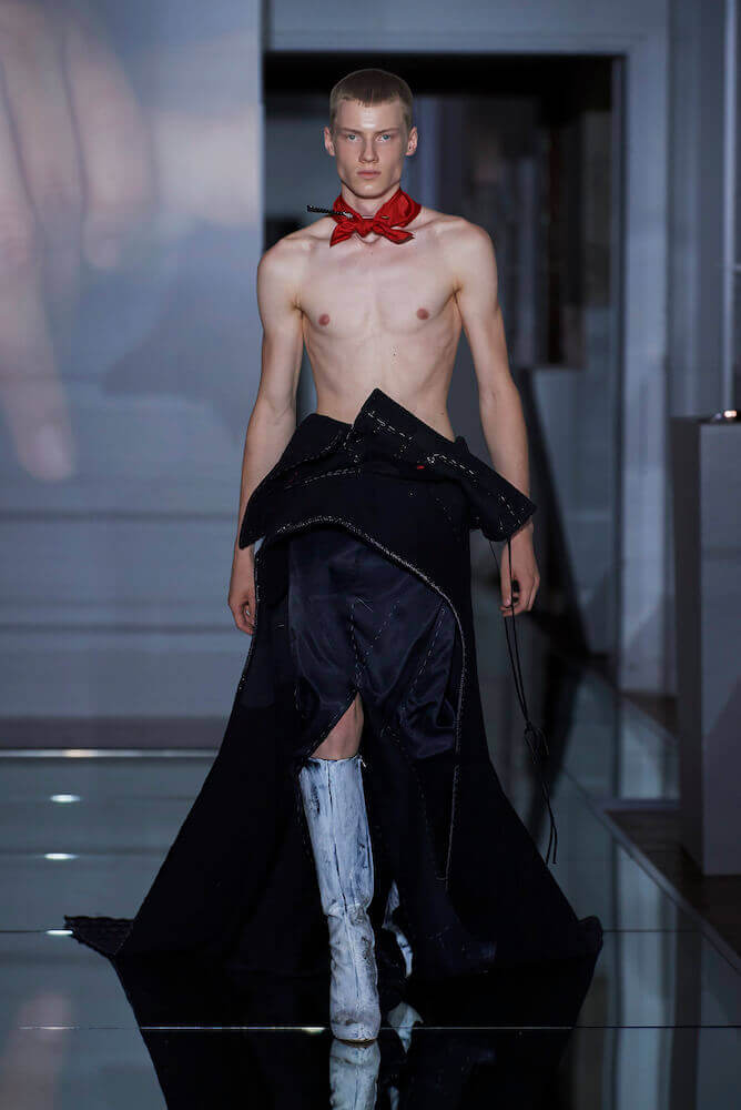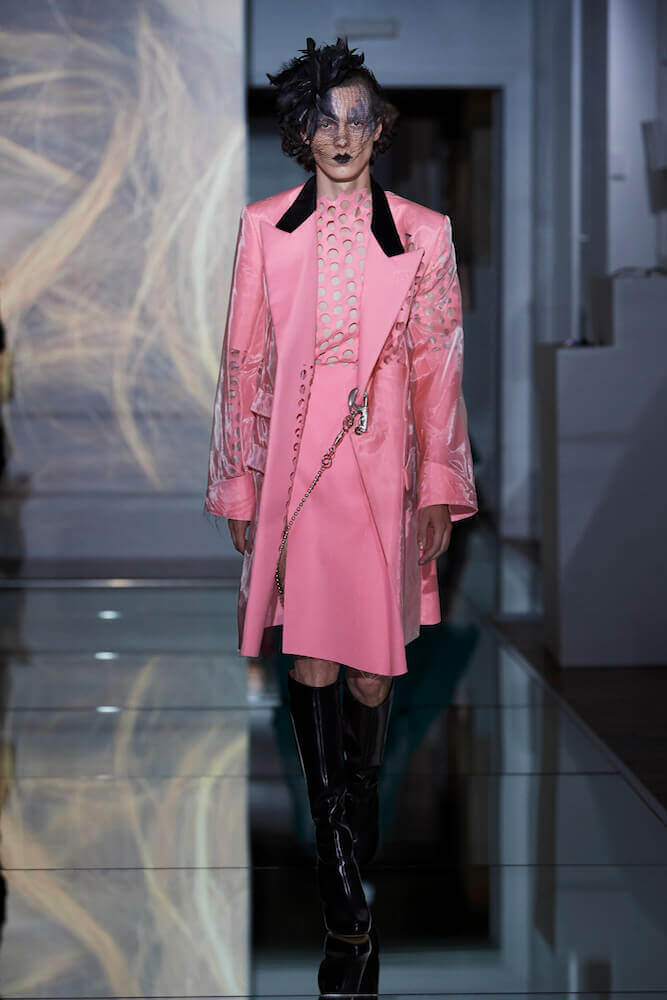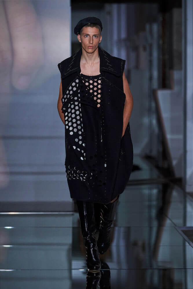 For his Co-Ed artisanal collection, Galliano continued to explore themes of decadence and an end days. The show notes talked of “desire without reason,” “fetishised consumption” and a “carte Blanche for new impulse”. Where do you go when anything goes? For Galliano it manifested as fetish inspired leather shorts worn over suspenders, vests that had migrated down the body to become shorts, their straps dangling down by the calves. Boys, girls and non-binary others wore traditional tailored jackets that sat not on the shoulders but the waist and morphed into trailing bustled ball skirts. Overcoats came in multi-layers of organza punched with portholes. Everything was familiar – you recognised the component parts of a look but they were made strange. That’s Galliano’s genius. Let your eyes adjust. Maison Margiela magical decadence and end of days.