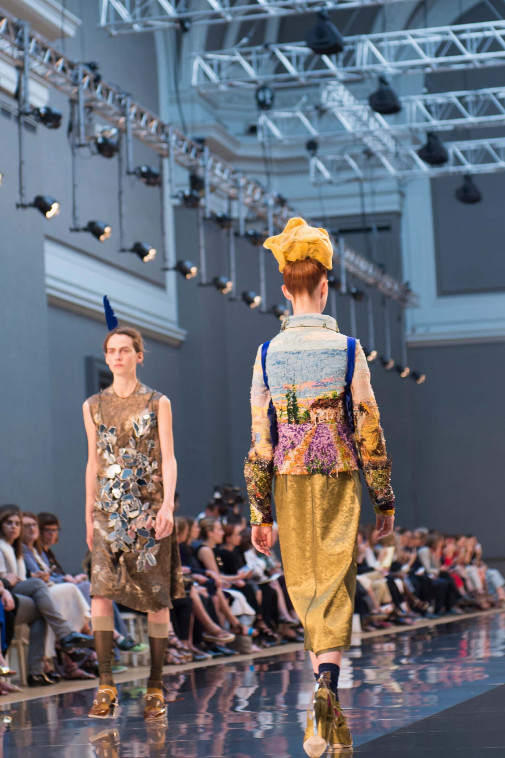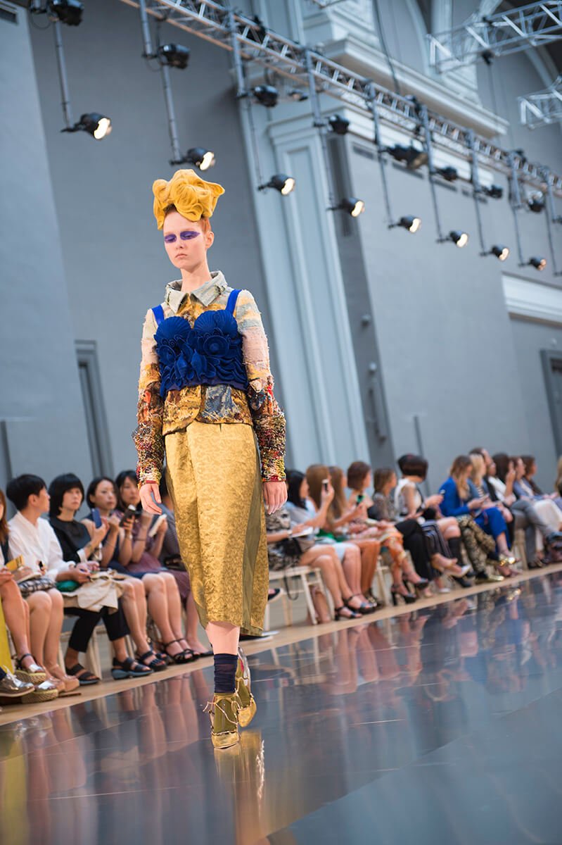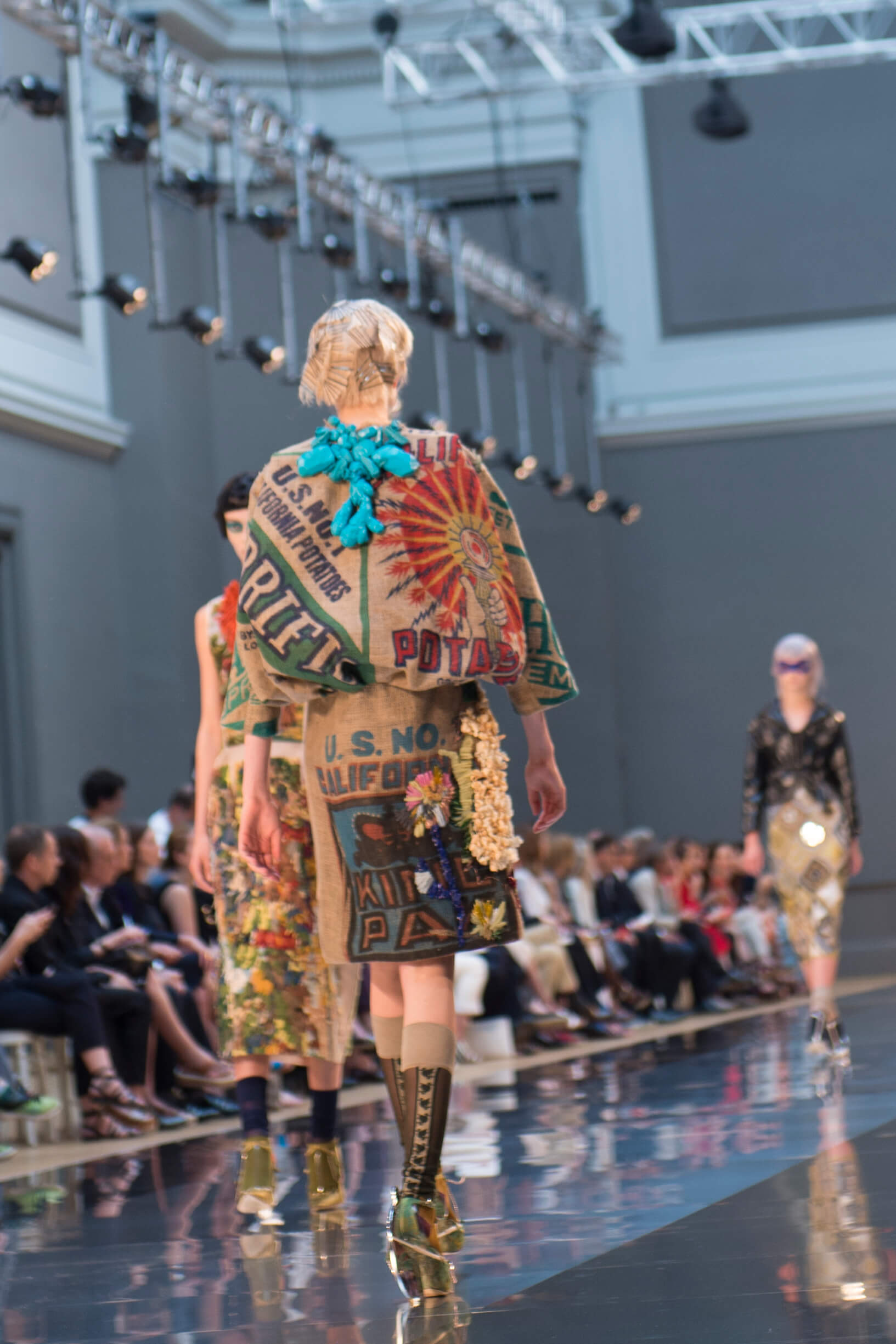 What do a paint-splattered inside-out coat, a roll of spangled AstroTurf, and a potato sack all have in common? They all wrapped mod bods at John Galliano’s stellar sophomore offering for Maison Margiela’s Artisanal line. It shows during couture week but the ethos is very different: more rough and ready, raw rather than refined, like the spazzolato and polished mirror shoes bound to the models’ feet with twine. But rest assured, there was artistry in it all – those sacks were hand-painted, those emulsion splodges painstakingly applied, and that AstroTurf had all the grandeur of a Poiret-clad dowager duchess. How fabulous.