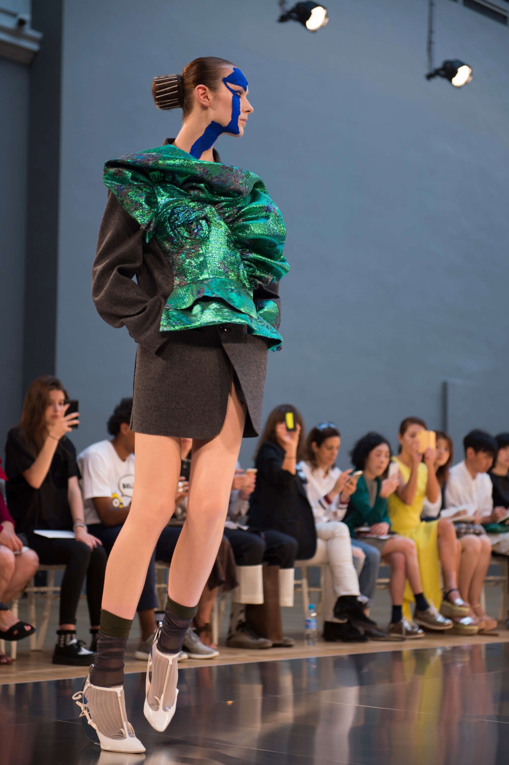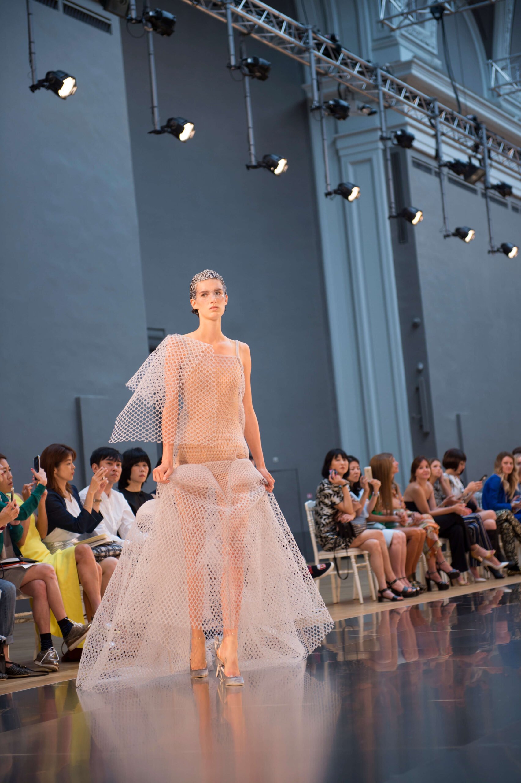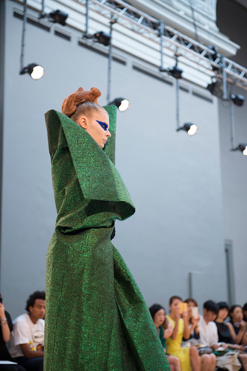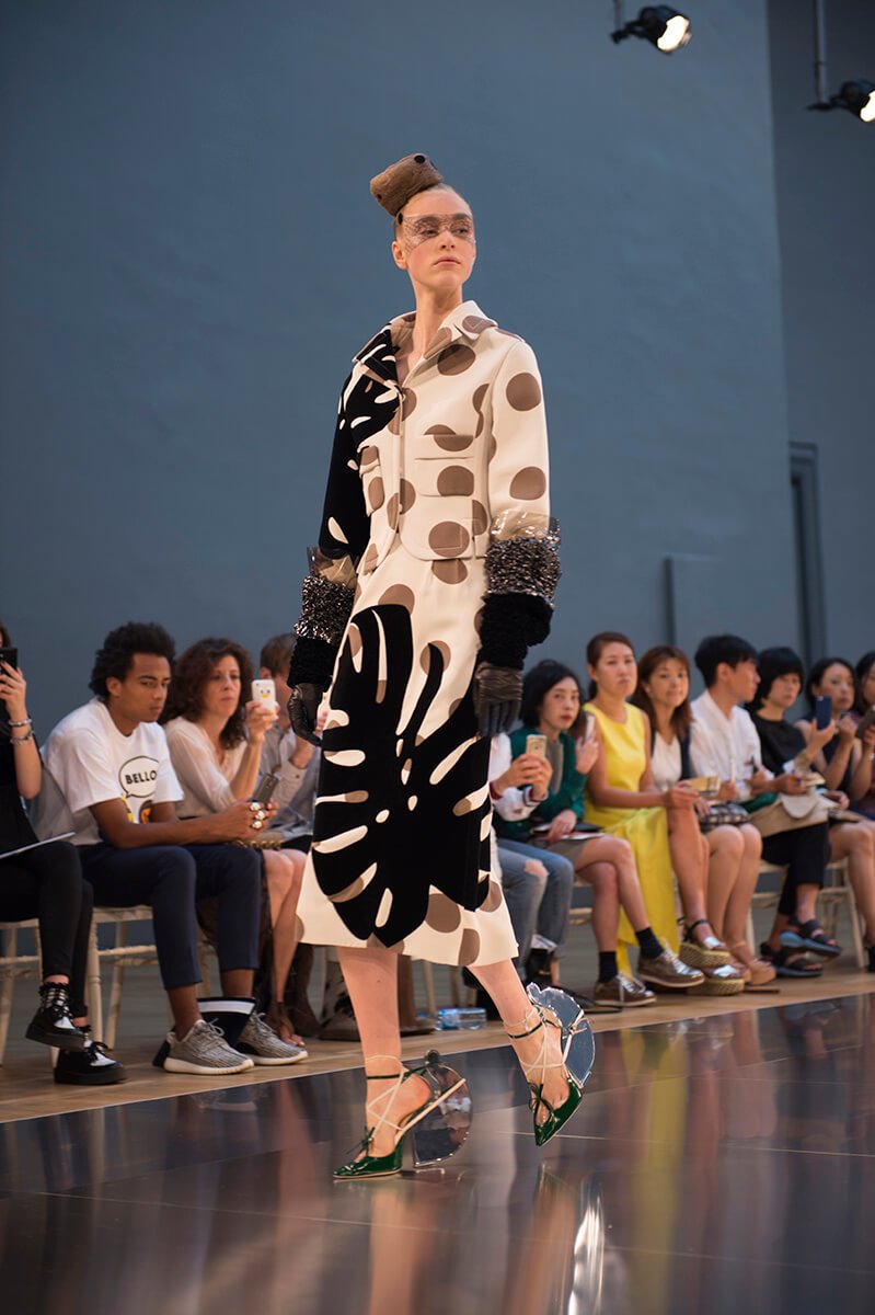 What do a paint-splattered inside-out coat, a roll of spangled AstroTurf, and a potato sack all have in common? They all wrapped mod bods at John Galliano’s stellar sophomore offering for Maison Margiela’s Artisanal line. It shows during couture week but the ethos is very different: more rough and ready, raw rather than refined, like the spazzolato and polished mirror shoes bound to the models’ feet with twine. But rest assured, there was artistry in it all – those sacks were hand-painted, those emulsion splodges painstakingly applied, and that AstroTurf had all the grandeur of a Poiret-clad dowager duchess. How fabulous.