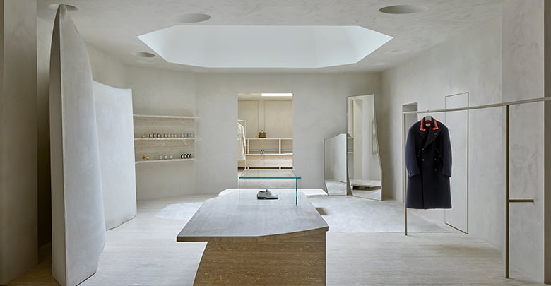 Meanwhile, artisanal furnishings bring comfort through familiarity – distorted by onwards facing mirrors and out-of-place walls, as the store explores abstract notions through banal objects like display shelves.