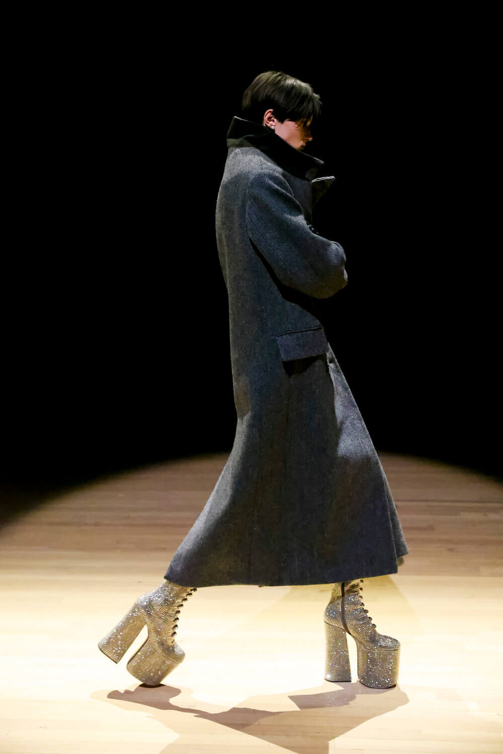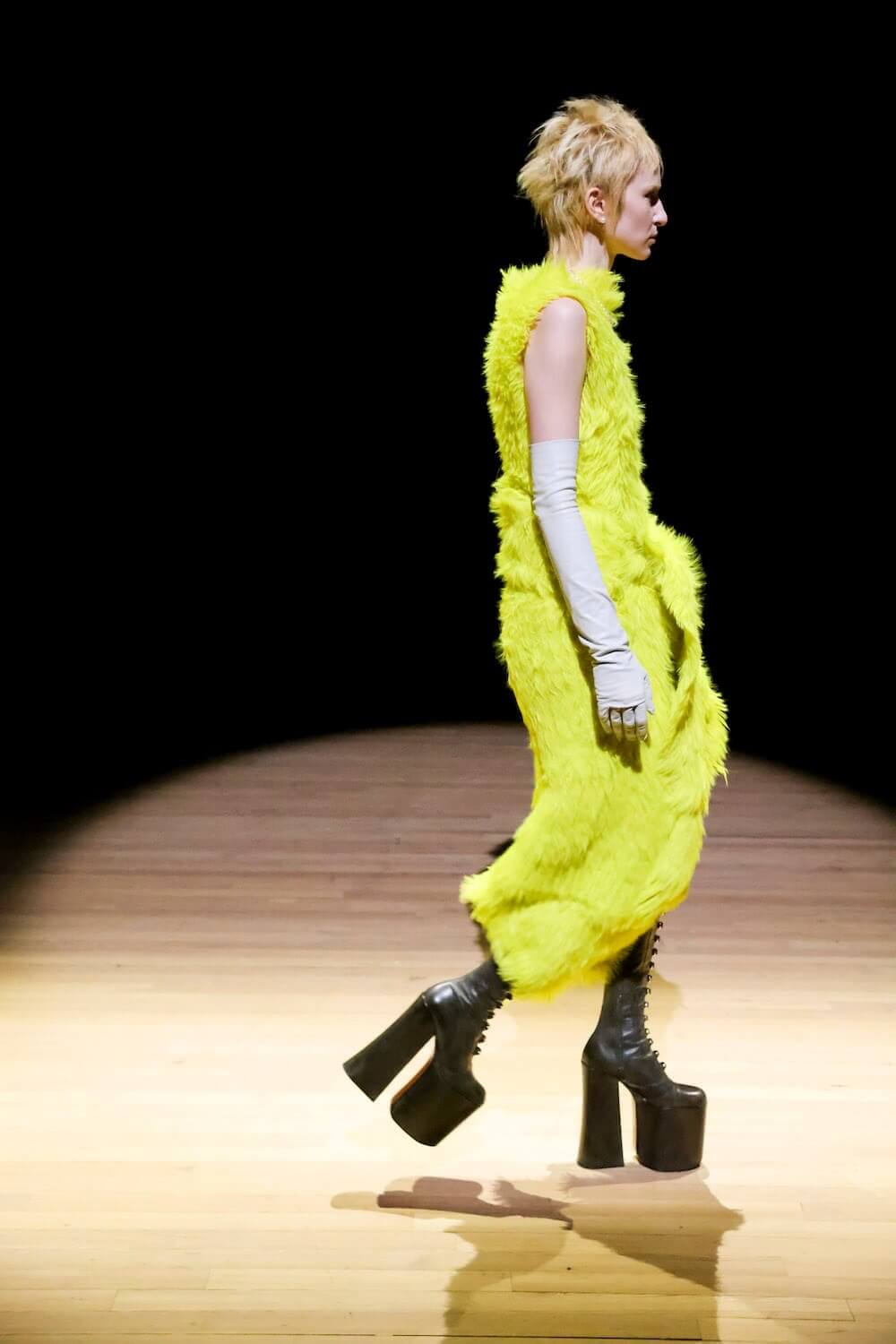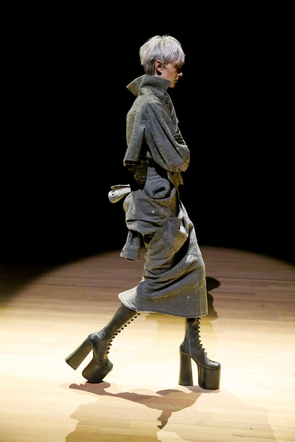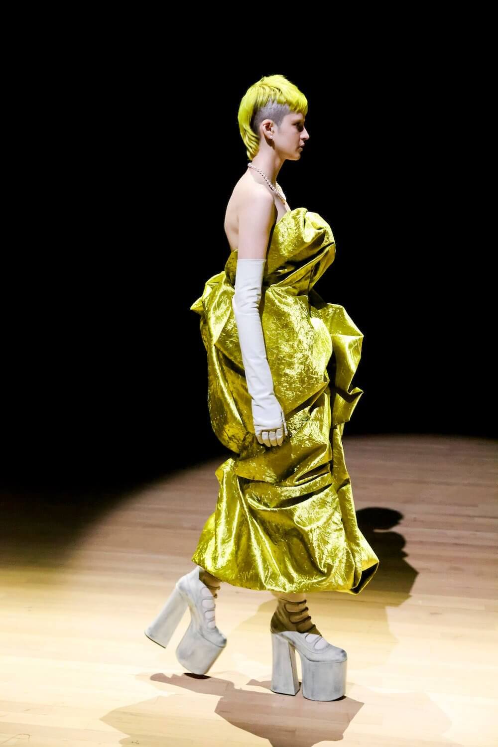 Jacobs credited the collection to “all our heroes past, and, young heroes present”, rounding off his show notes with a quote from Vivienne Westwood. The late designer’s influence could be felt throughout. From the yellow and crimson evening gowns which twisted into elegant, off-kilter formations, to the Mikimoto pearl necklaces and the tufty blonde pixie cuts sported by a slew of the models. It was a fitting tribute from one fashion anarchist to another.