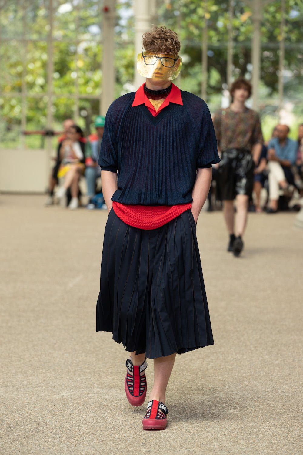 The co-ed catwalk was packed with tech-y looking luxury cloths cut into super-easy jackets and some radically new trousers and shorts shapes. Some were cinched and high and various pairs of selvedge denim jeans – the waist so high it hugged the bottom of the models’ rib cage – were worn with see-through pink blouses. The wide concertina-pleat shorts were great too.