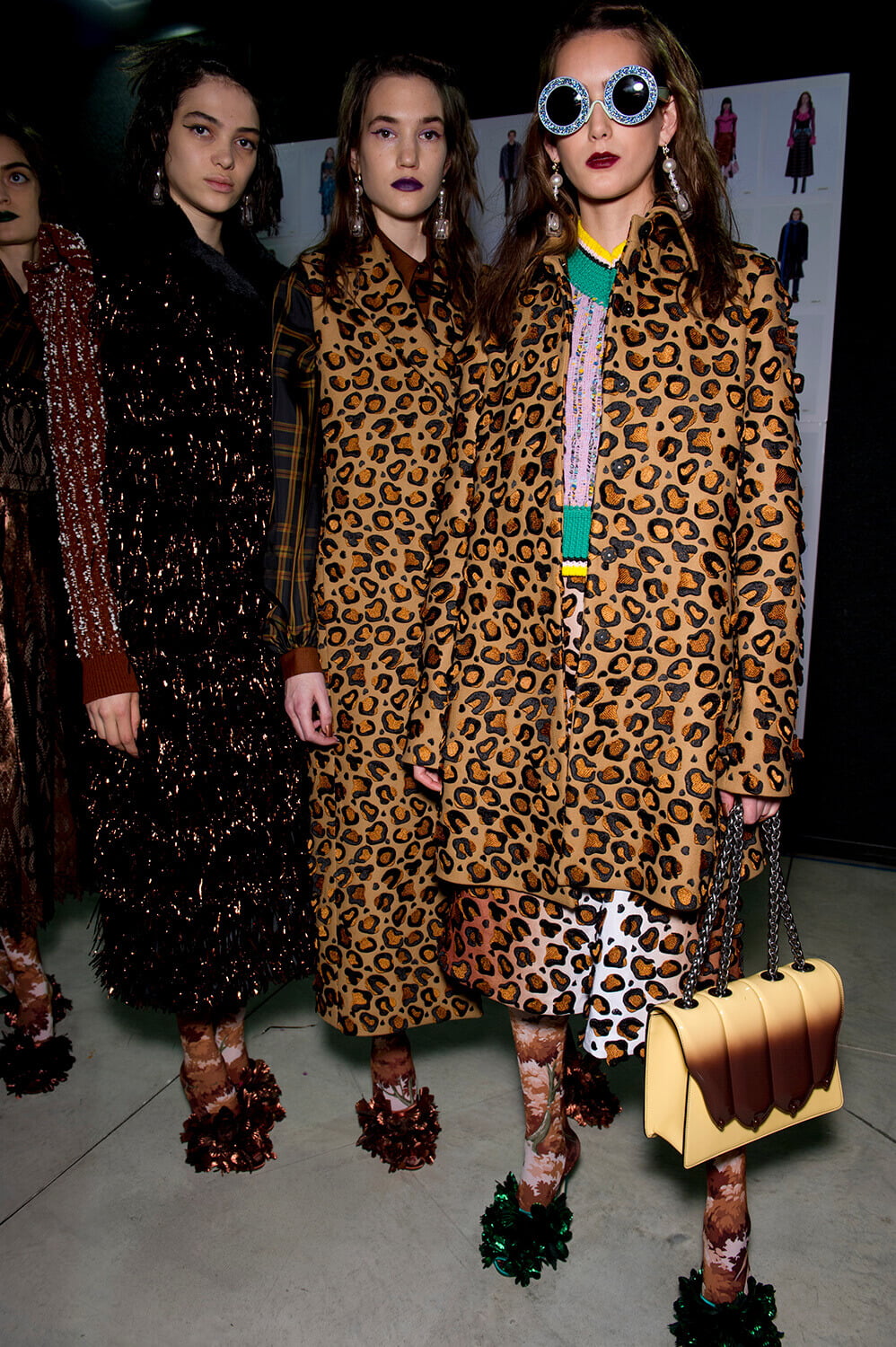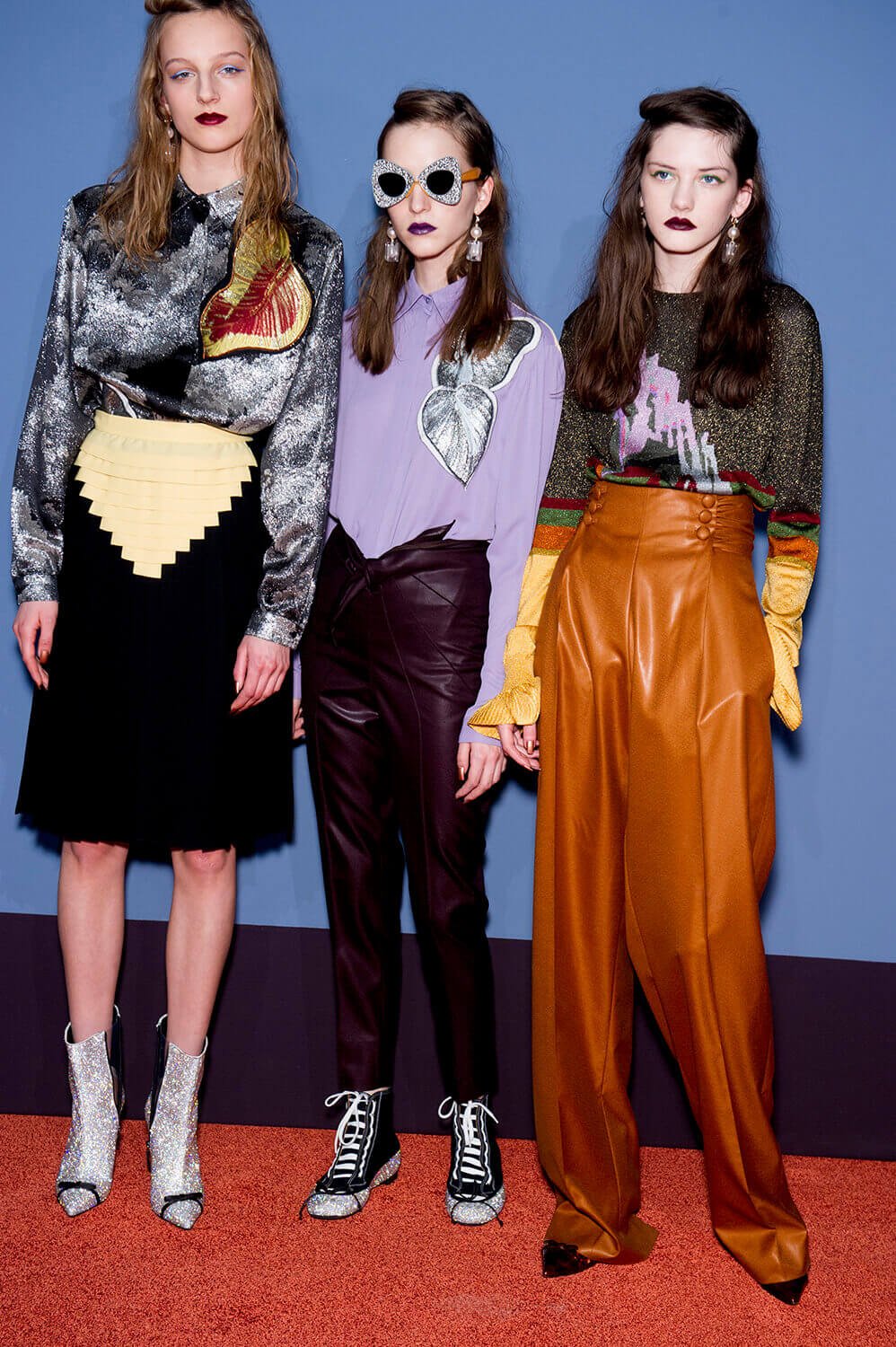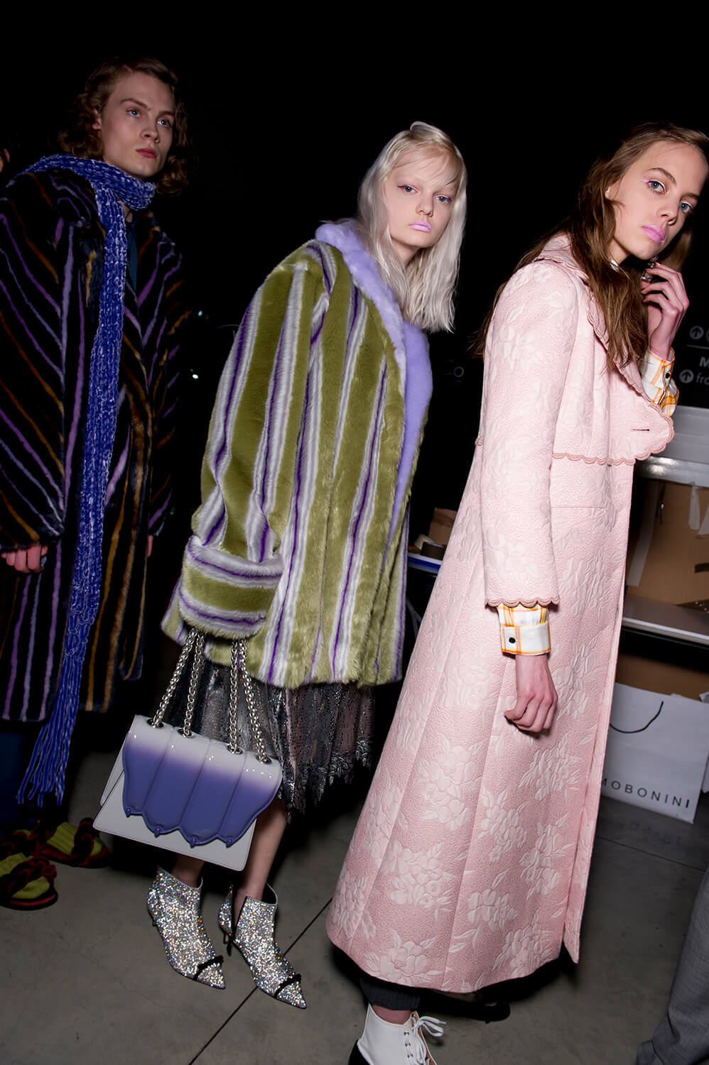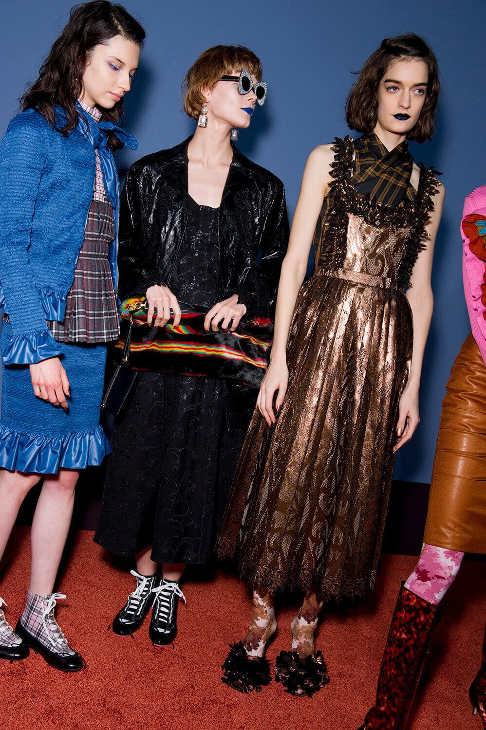More more more. Just how we like it. We’re greedy bitches, you see. Plenty for us piggies to devour at Marco de Vincenzo’s AW17 show yesterday, because this was a collection all about maximalism – pile it high, sell it… well, not so cheap. Not cheap at all, in fact, because this is expensive Milanese fashions, made from those fabrics that Marco is so good at – fantasy fabrics, here brought together in a riot of colour, texture and… tinsel. There were lurex sweaters, of course (they’ve become a bit of a signature) but also faux fur coats printed with pyramids and palm trees, clashing plaids, ruffles, amazing brocades. And the form of the clothes themselves? Well, imagine a cross between cowgirl, Little House on the Prairie and 1920s flapper. Somewhere around there. Loved.