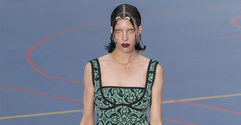 Serre also seemed to have hopped on the Y2K train this summer, but in a way that was anything but kitsch. Sporting mens mini skirts wrapped around straight-leg trousers, recycled cut out swimwear and intricate knit and crochet frocks, it was sexually ambiguous. Spliced together with floral silks, patchwork prints and 1980s skin-tight sporty silhouettes, Marine Serre’s latest offering was beautifully optimistic.