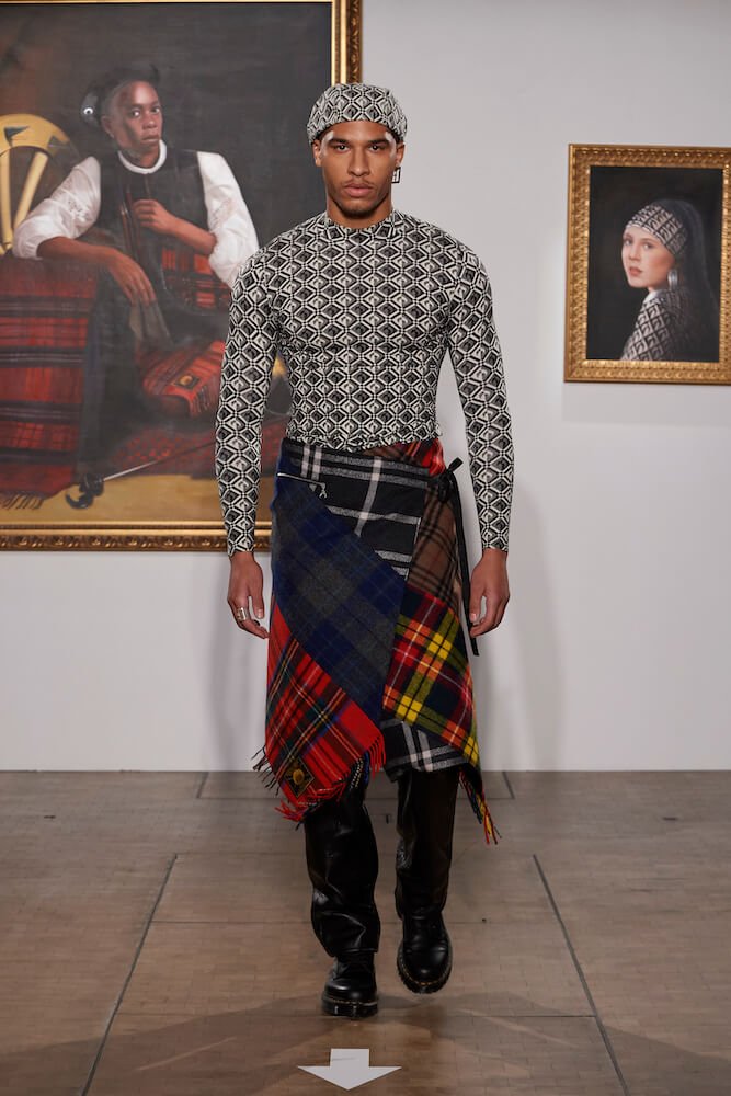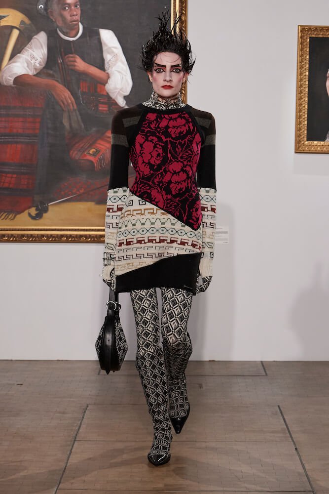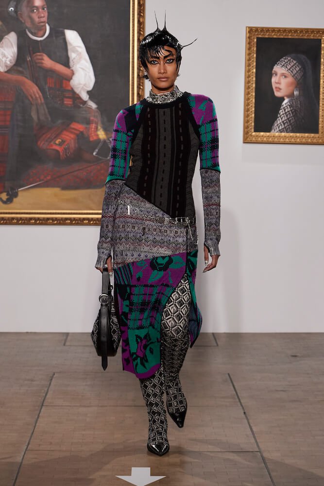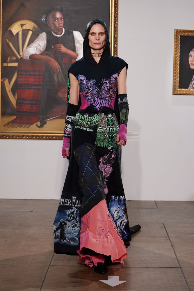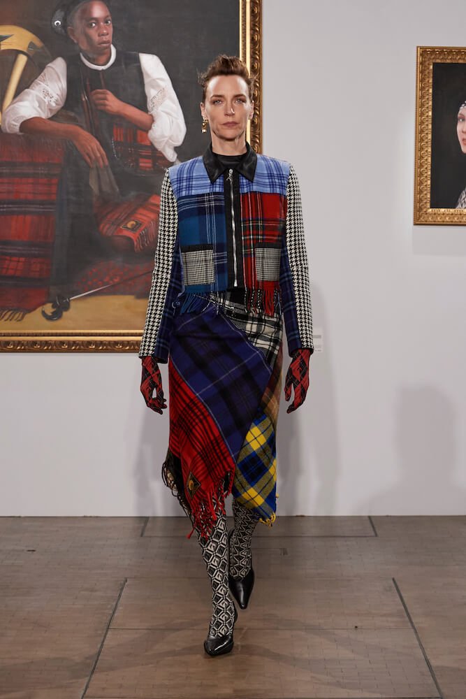 “The challenge is to re-invent the art of living on a damaged planet,” said the designer in her show notes. Less apocalyptic than her previous outings, she spoke of restoring our world’s dignity, channelling its ruins and perils into new meanings and ideals. Like old Scottish tartan scarves, for instance, used to fashion tailored coats, skirts and Harington jackets. Or patchworking frocks from clashing knits. One ball gown was made from 1990s metal band tees, another quilted from repurposed toile de Jouy. It felt punk, all done via beautiful design.