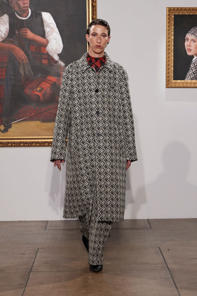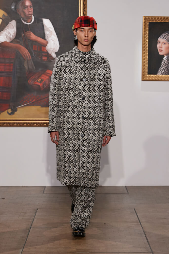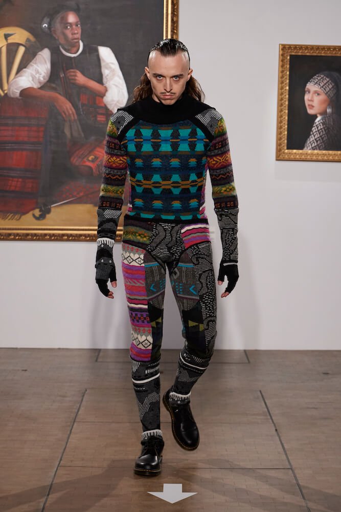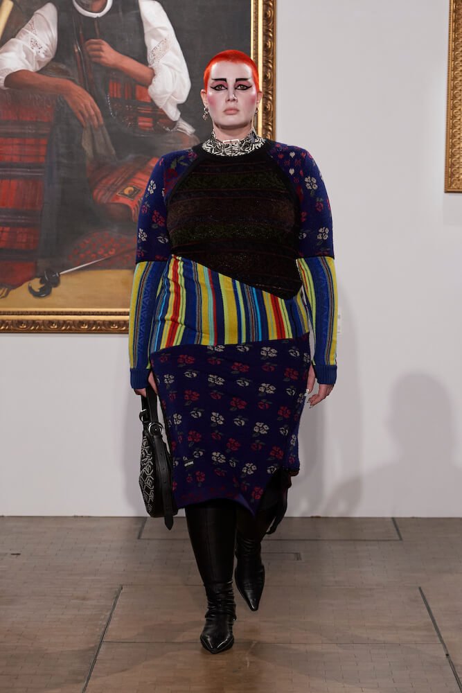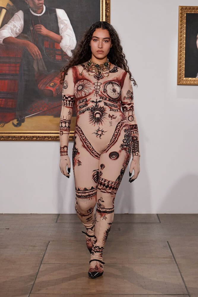 “The challenge is to re-invent the art of living on a damaged planet,” said the designer in her show notes. Less apocalyptic than her previous outings, she spoke of restoring our world’s dignity, channelling its ruins and perils into new meanings and ideals. Like old Scottish tartan scarves, for instance, used to fashion tailored coats, skirts and Harington jackets. Or patchworking frocks from clashing knits. One ball gown was made from 1990s metal band tees, another quilted from repurposed toile de Jouy. It felt punk, all done via beautiful design.