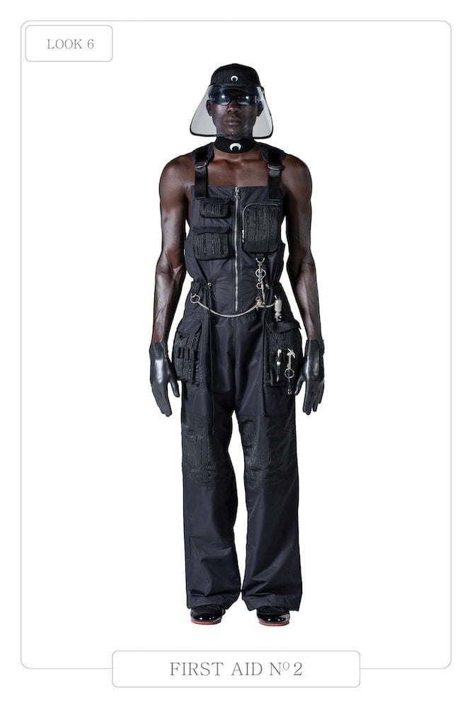 There’s everything from post-apocalyptic utility wear in biodegradable nylon, or upcycled moiré, complete with an abundance of zippy pockets, body harnesses and clear visors. Power Ranger unitards promise freedom of movement. Tailoring is made form repurposed fabrics and even upcycled tapestry fabric. Covid-proof beaded balaclavas add a touch of glamour but otherwise, Serre is creating a hyper-functional modern wardrobe. This isn’t fashion as escapism. It’s wedded to the reality of anxious times.