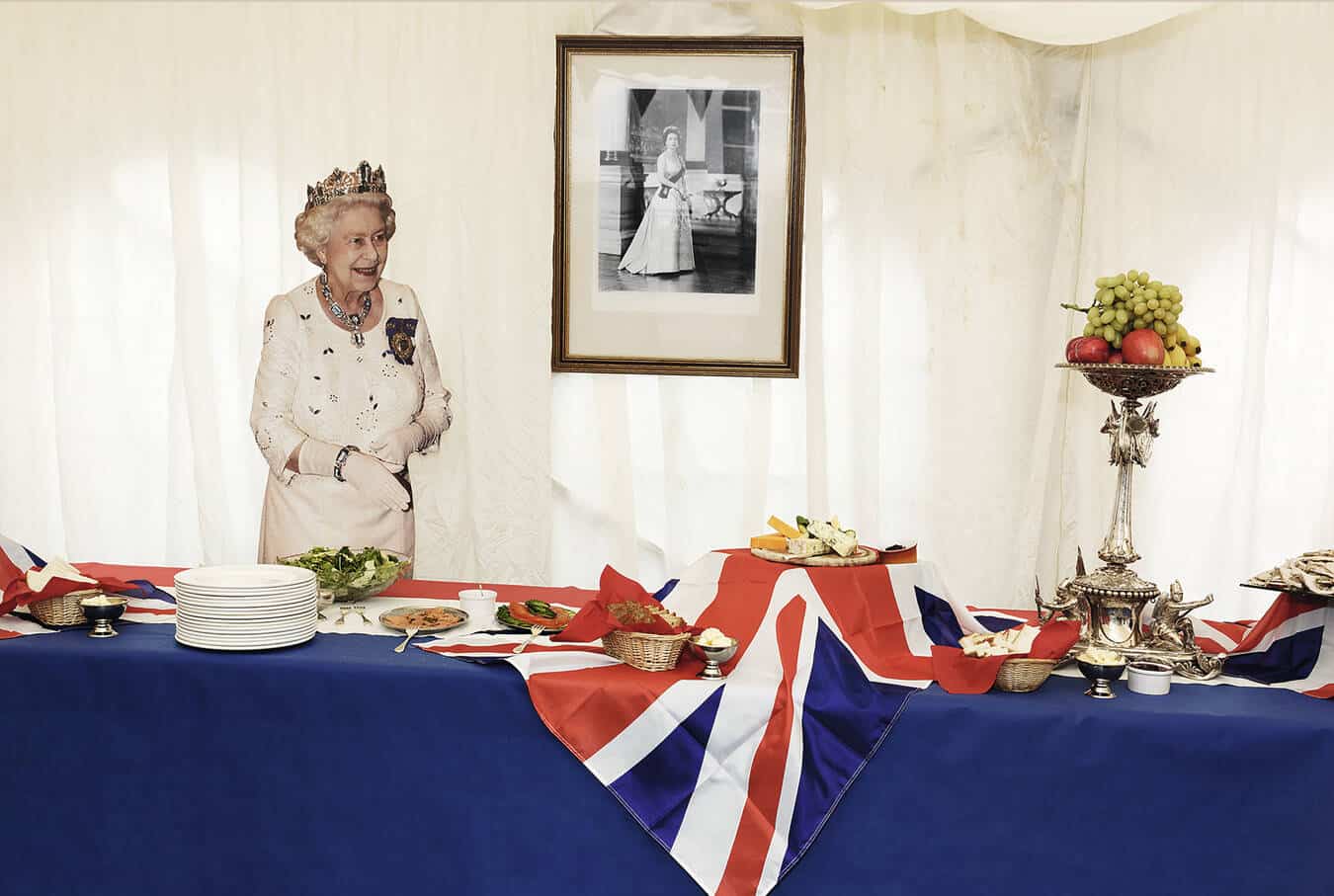 “It was bonkers, of course,” says Parr of his bank holiday spent photographing Union Jack strewn buffet tables, makeshift parade floats propped on the back of lorries and sparsely attended, outdoor viewing parties where royalists watched the main event on big screens, braving the typical English crap weather, shielded by a wave of brollies.