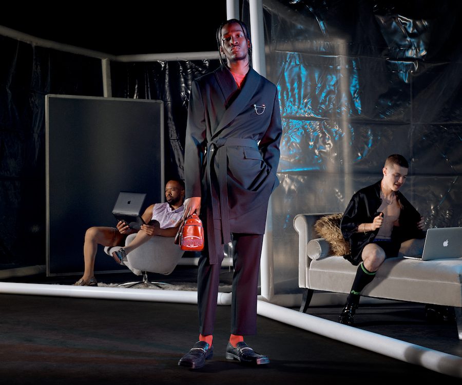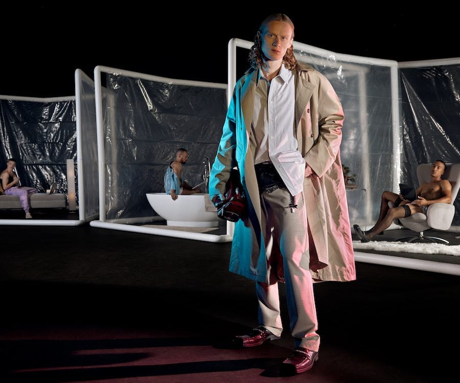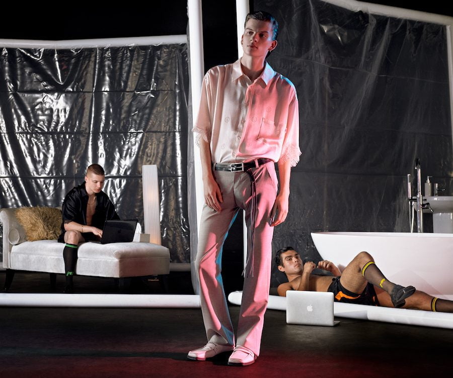 Yet the collection’s ultimate highlights comes via a series of women’s silky lingerie pieces now made for men – either peaking beneath business suits or transformed into shirts; trimmed with lace at the sleeve and dotted with the designer’s R monogram. It doesn’t matter what gets you off, or what kind of kinks you’re into – these are cracking pieces that will look just as good on as they would on the bedroom floor.