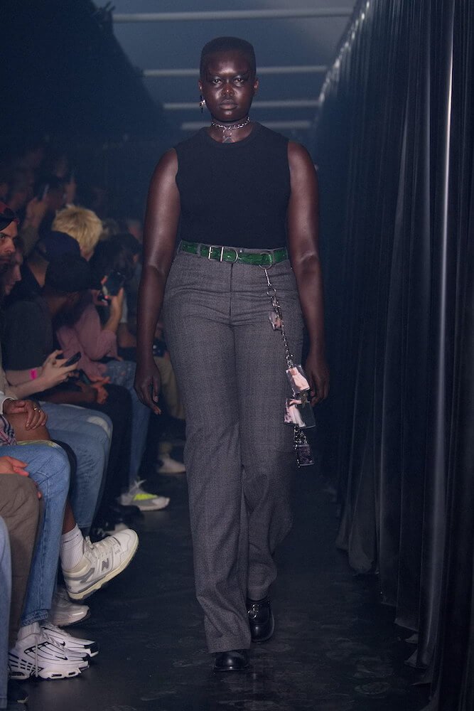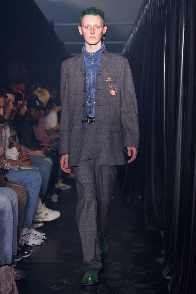 What ensued was a hot-under-the-collar ode to the history of London’s gay scene, and the allure of urgent sexual encounters. “My focus has become really detailed. I’ve become so micro-focused,” said Rose, whose ingenious toying of proportion led to super shrunken silhouettes. Think sleazy trench coats pulled tight to the body, jeans hoicked high above the waist to purposefully expose the fly, and shirting clung to the torso, as if borrowed from last night’s hook-up.
