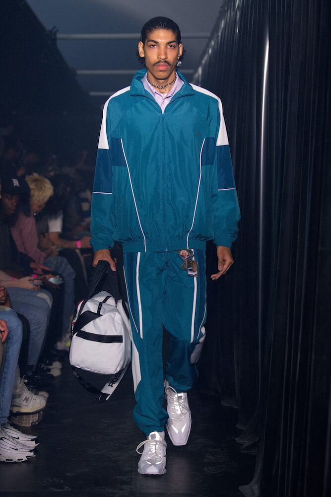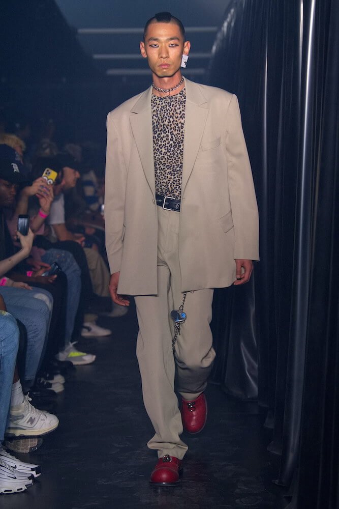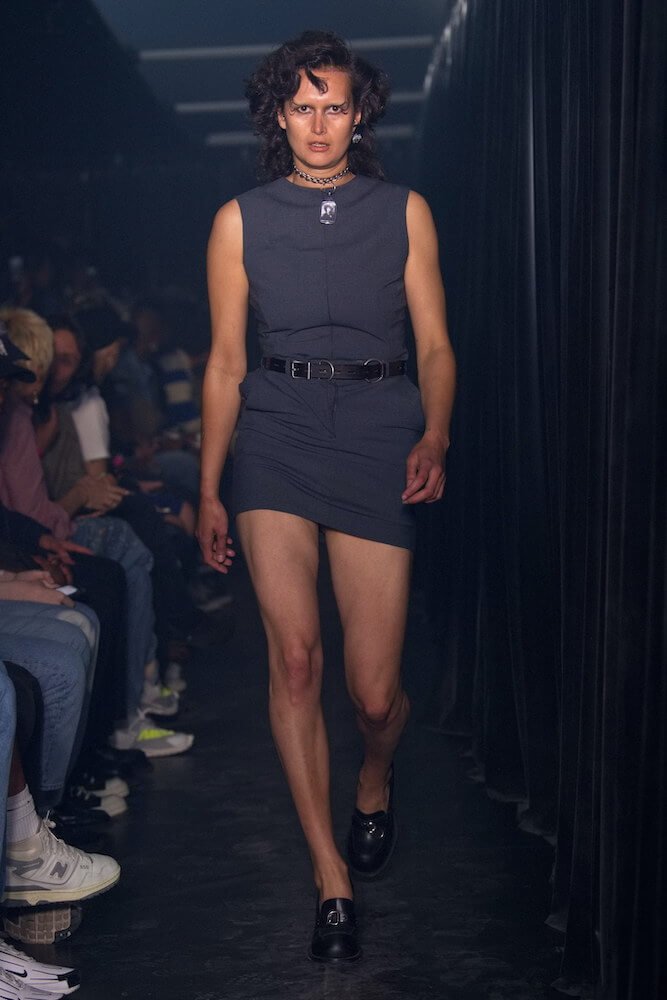 An overriding sense of pressure and tension came translated via narrow MA-1 bombers, as well as suiting cut askew and mini-dresses purposefully twisted and exposed at the back – hurriedly chucked on after getting up to all sorts. The looks came accented by key rings which clung to belt loops and trouser flies; ideal for easy access. These were made with on-going collaborator Roxy Lee, and featured bulge shots, chiseled torsos, as well as portraits of Martine boys of season’s past. Also on the accessories front were gym holdalls big enough to stuff your office garb in before venturing onto seedy dancefloors, as well as a new Nike team-up that playfully fused the sportswear giant’s Shox with the silhouette of a dress shoe.