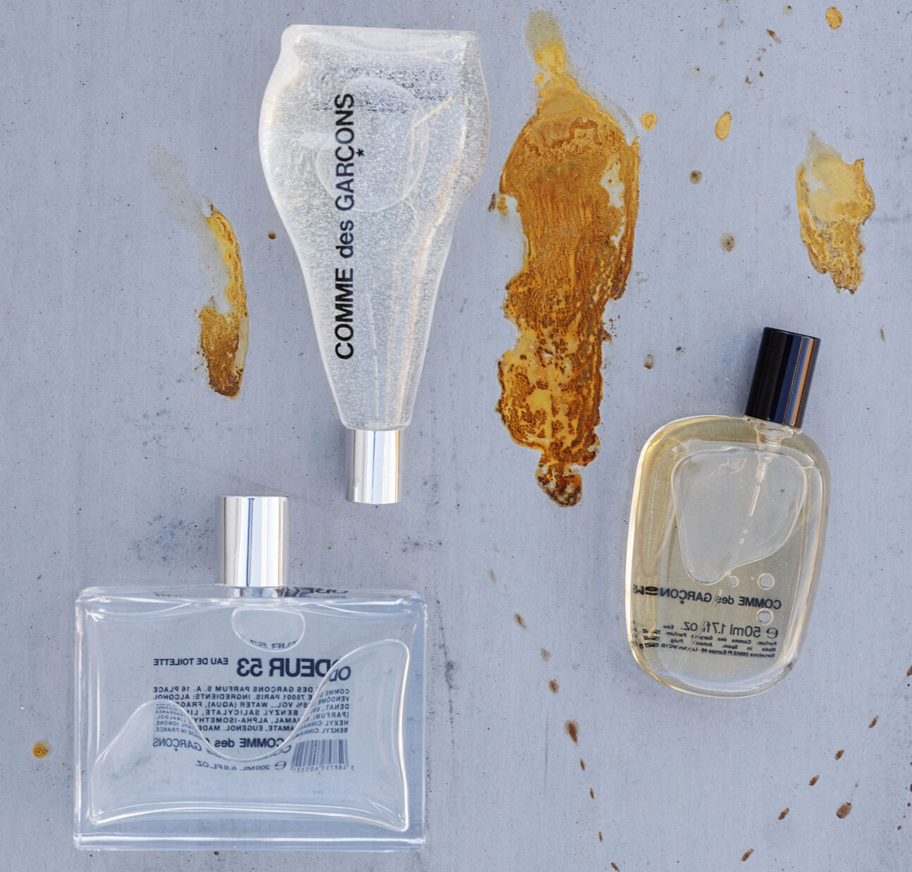 from left: Odeur 53, Comme des Garçons Eau de Parfum and Comme des Garçons 5 by COMME DES GARCONS; photography by Carolyn Drake