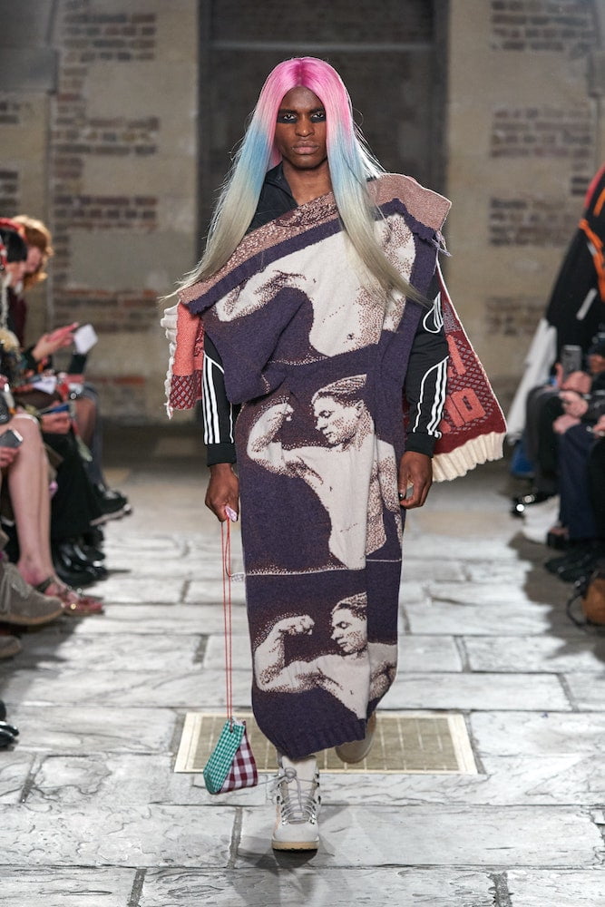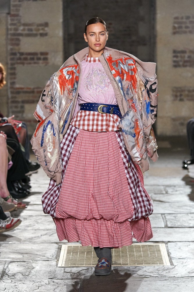 The collection was shown mostly on men (save for an appearance by supermodel Irina Shayk) – something Bovan had wanted to do for a while but now the time felt right. Folksy hand-knitted American flags were crafted into capes, lumberjack shirts were reinvented as swirling skirts, some pieces had the vast shoulder-scape of American footballers whilst check tablecloths were piled, draped, bundled and balled into stately shapes. Bovan also reworked iconic ready-made pieces from other brands including hand-painted Calvin Klein Jeans, Adidas tracksuits which were fashioned into ball gowns, alongside customised Vivienne Westwood tailoring, Converse and Alpha Industries bombers. It felt punk. It felt now.