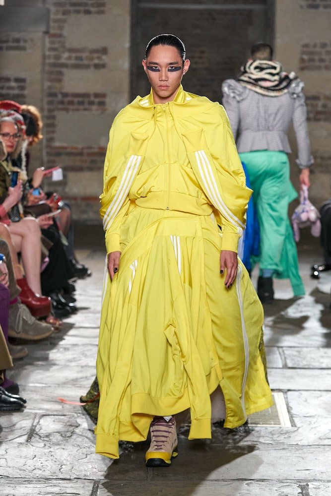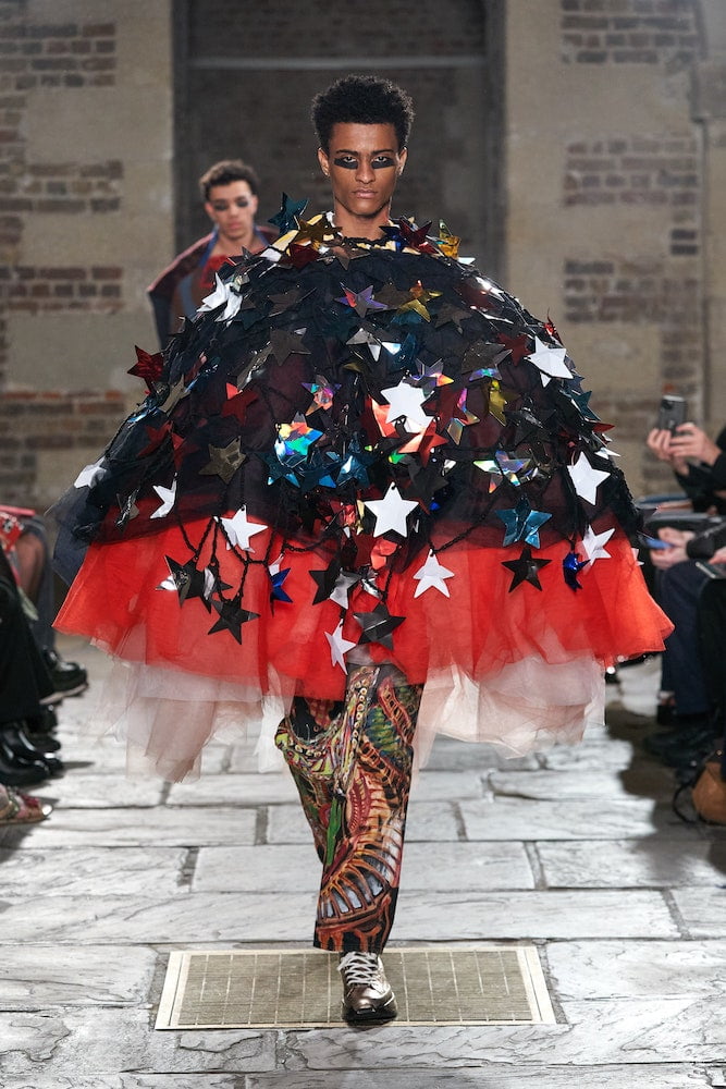 As Storm Eunice blew in, making London look like the twister dream sequence in The Wizard of Oz, Matty Bovan whipped up a storm of his own. The designer tumbled together Americana references in a hurricane of upcycling. Like a fashion Avenger wielding his power, he masterfully orchestrated found fabrics and fashion tropes into a powerful post-pandemic story.