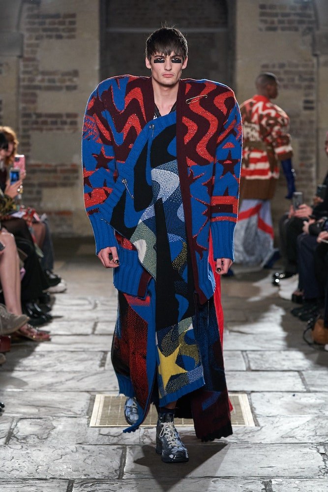 The collection was shown mostly on men (save for an appearance by supermodel Irina Shayk) – something Bovan had wanted to do for a while but now the time felt right. Folksy hand-knitted American flags were crafted into capes, lumberjack shirts were reinvented as swirling skirts, some pieces had the vast shoulder-scape of American footballers whilst check tablecloths were piled, draped, bundled and balled into stately shapes. Bovan also reworked iconic ready-made pieces from other brands including hand-painted Calvin Klein Jeans, Adidas tracksuits which were fashioned into ball gowns, alongside customised Vivienne Westwood tailoring, Converse and Alpha Industries bombers. It felt punk. It felt now.