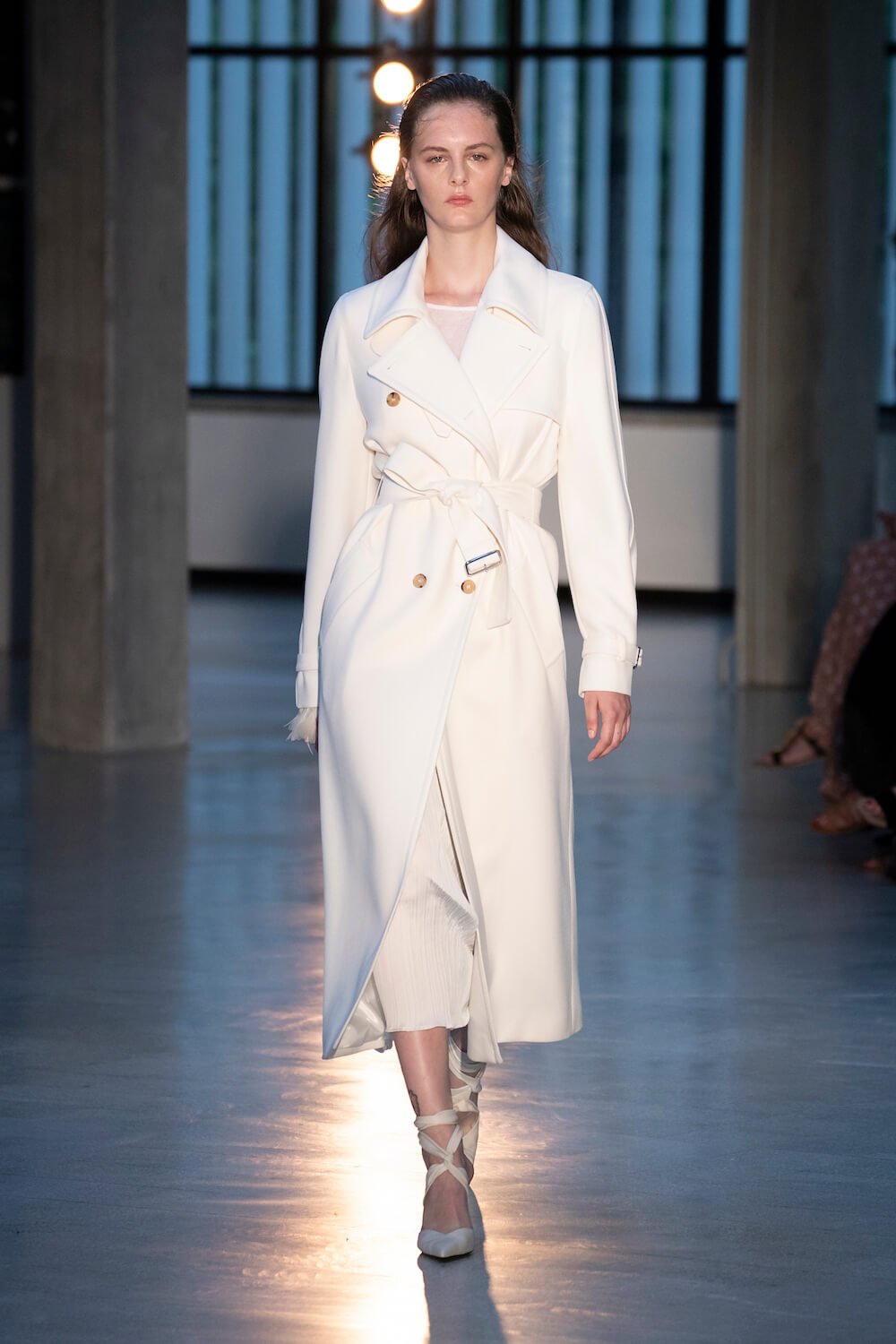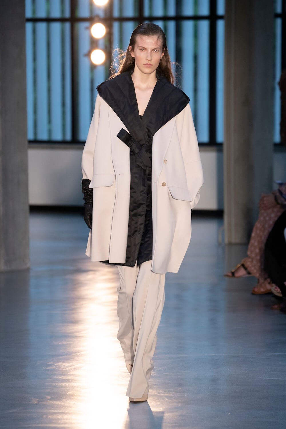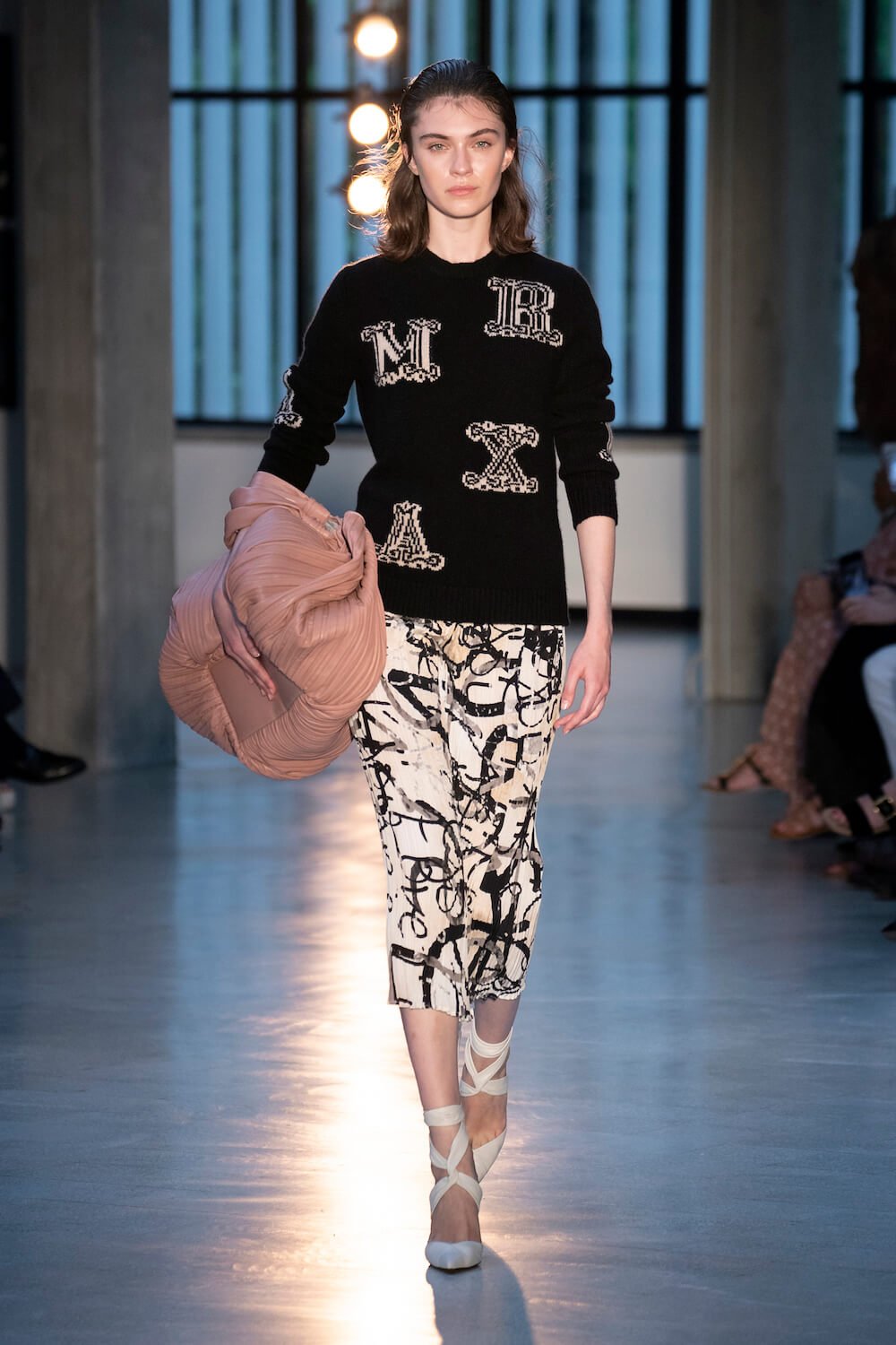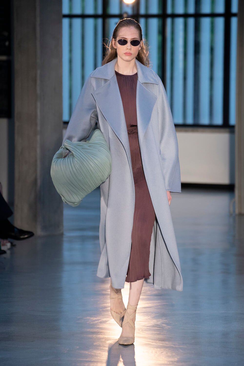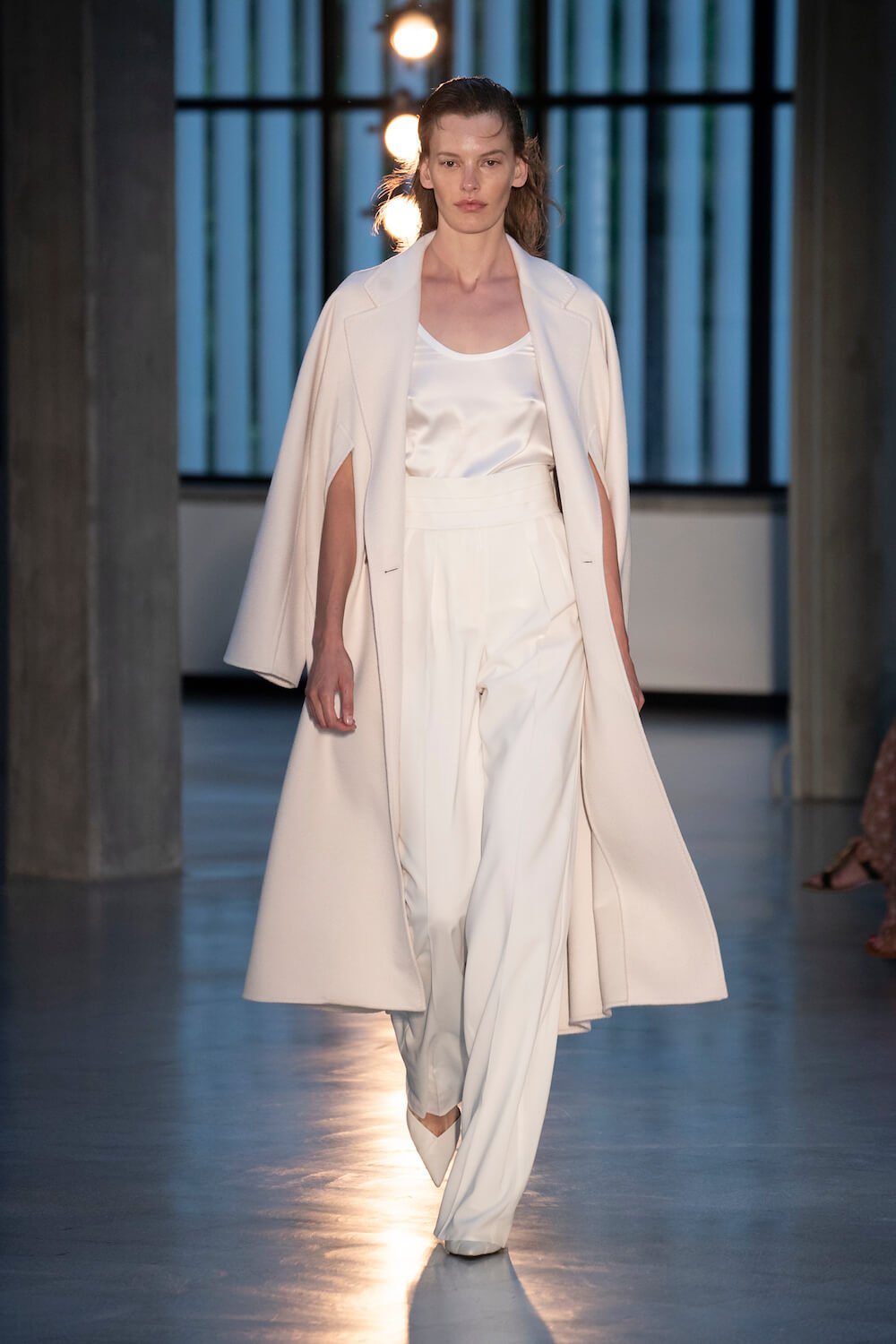 Max Mara may be a global mega brand with stores in 100 countries, but when it came to putting on its cruise show, there was no place like home. It makes sense when home is Reggio Emilia and a vast contemporary art collection housed in the former Max Mara industrial HQ. The show was held at Collezione Maramotti, which brims with major Twombly, Burri and Anselmo pieces collected by Max Mara founder Achille Maramotti. Designer Ian Griffiths took inspiration directly from the daring art housed there. The freshness of Pascali’s Coliseum relief inspired light transparencies and the chalky, neutral palette. The idea for crinkly pleats on tube skirts and evening dresses came from a rippled Manzoni sculpture and Griffiths pointed out an Anselmo sculpture, Torsione “which is probably one of the most pivotal pieces of Arte Povera, which for us was the inspiration for a shoulder strap- because we are not artists we are fashion designers.” That’s the magic of Max Mara: it combines great sophistication with something everyone can relate to. There was plenty here for every woman from the roomy coats to the slouchy trousers shown with simple vests and a silk cummerbund for evening. And it was all done with that special Italian know how. The finish was immaculate. “We do straight forward clothes that you can get on with your life in,” said Griffiths, “But they have this connection to avant garde art. This man, Achille Maramotti, who was making power dressing clothes in the 1980s was buying Bacons and and Burris. He was not a conservative thinker. He was forward thinking and radical. It puts an new perspective on the clothes.” Griffiths felt emotional backstage – he’s worked for the company for thirty years but this show gave him an opportunity to show a new side of Max Mara and Italian fashion. “People are saying negative things about Italy but look at Italian culture, Italian charm, Italian food and Italian fashion, which is all about making people Bella. It’s about making people look their best. I wanted to celebrate that.” That he did.