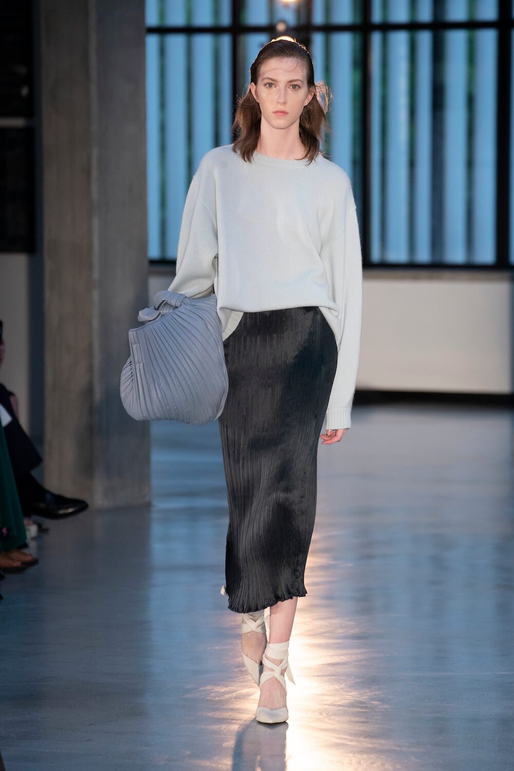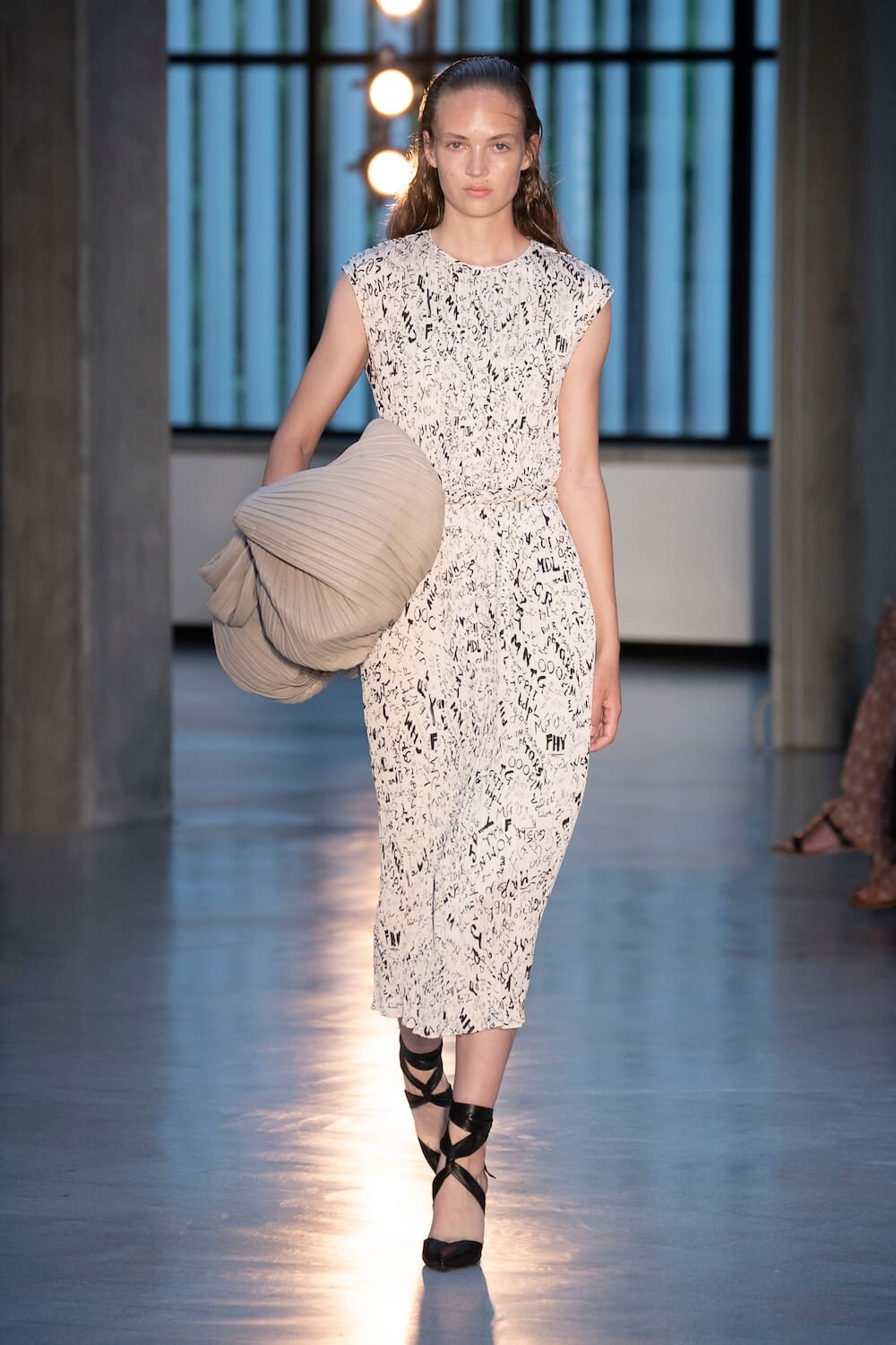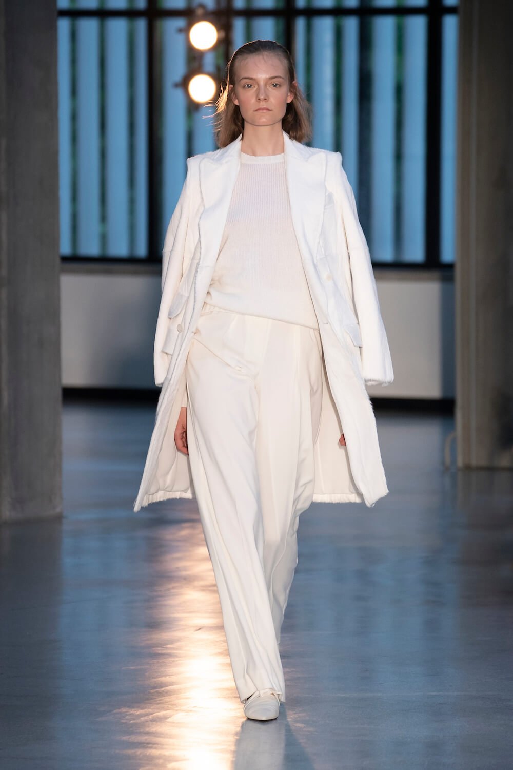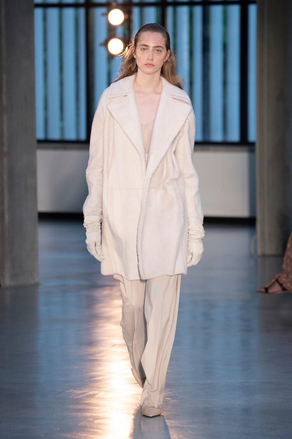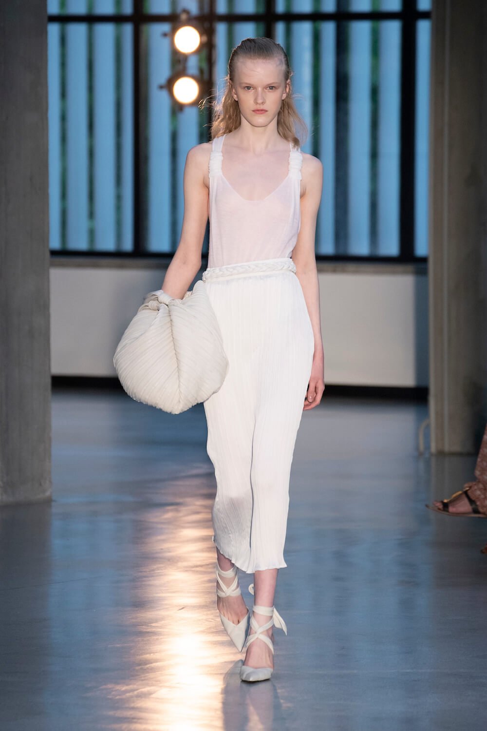 Max Mara may be a global mega brand with stores in 100 countries, but when it came to putting on its cruise show, there was no place like home. It makes sense when home is Reggio Emilia and a vast contemporary art collection housed in the former Max Mara industrial HQ. The show was held at Collezione Maramotti, which brims with major Twombly, Burri and Anselmo pieces collected by Max Mara founder Achille Maramotti. Designer Ian Griffiths took inspiration directly from the daring art housed there. The freshness of Pascali’s Coliseum relief inspired light transparencies and the chalky, neutral palette. The idea for crinkly pleats on tube skirts and evening dresses came from a rippled Manzoni sculpture and Griffiths pointed out an Anselmo sculpture, Torsione “which is probably one of the most pivotal pieces of Arte Povera, which for us was the inspiration for a shoulder strap- because we are not artists we are fashion designers.” That’s the magic of Max Mara: it combines great sophistication with something everyone can relate to. There was plenty here for every woman from the roomy coats to the slouchy trousers shown with simple vests and a silk cummerbund for evening. And it was all done with that special Italian know how. The finish was immaculate. “We do straight forward clothes that you can get on with your life in,” said Griffiths, “But they have this connection to avant garde art. This man, Achille Maramotti, who was making power dressing clothes in the 1980s was buying Bacons and and Burris. He was not a conservative thinker. He was forward thinking and radical. It puts an new perspective on the clothes.” Griffiths felt emotional backstage – he’s worked for the company for thirty years but this show gave him an opportunity to show a new side of Max Mara and Italian fashion. “People are saying negative things about Italy but look at Italian culture, Italian charm, Italian food and Italian fashion, which is all about making people Bella. It’s about making people look their best. I wanted to celebrate that.” That he did.