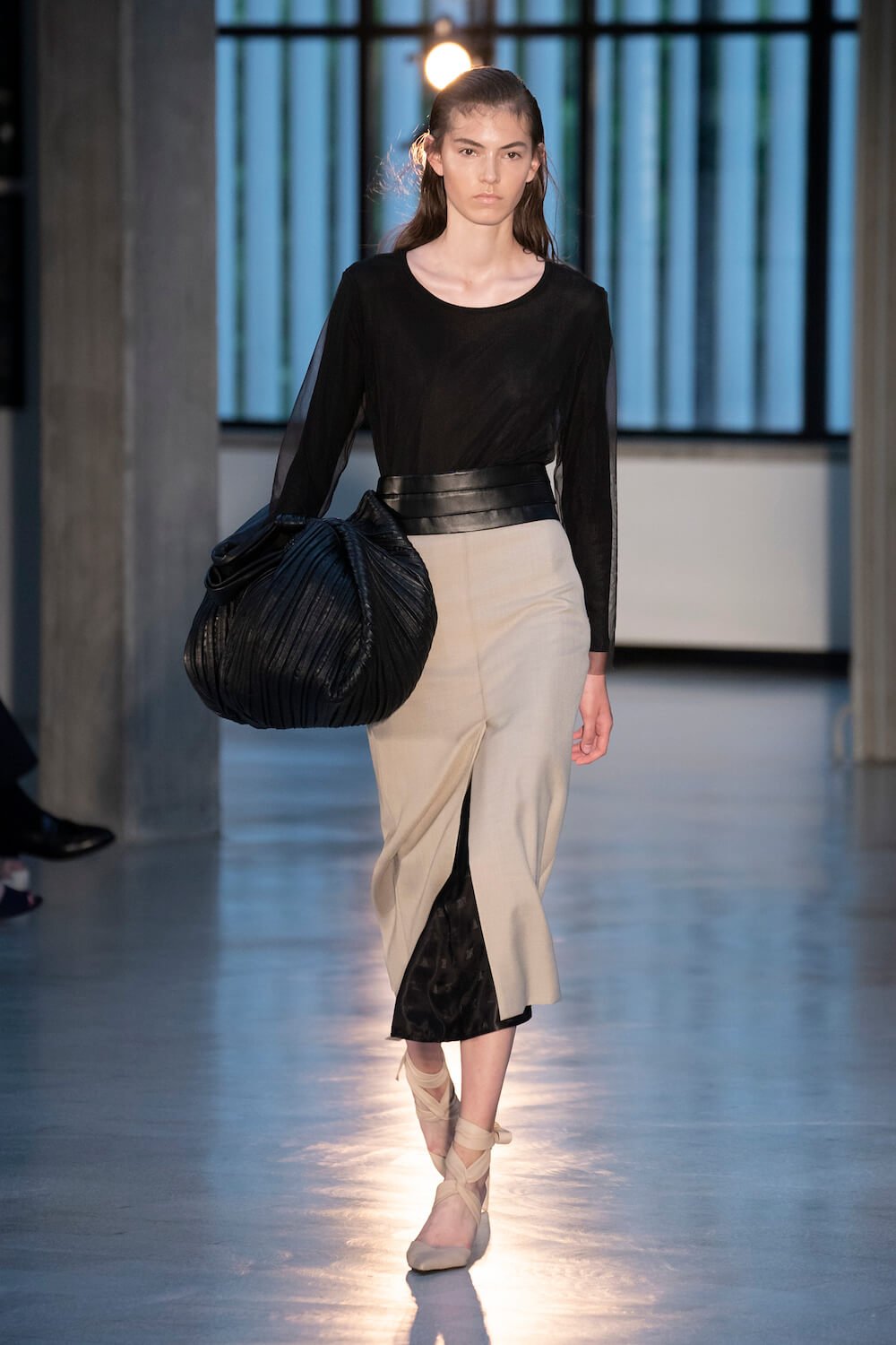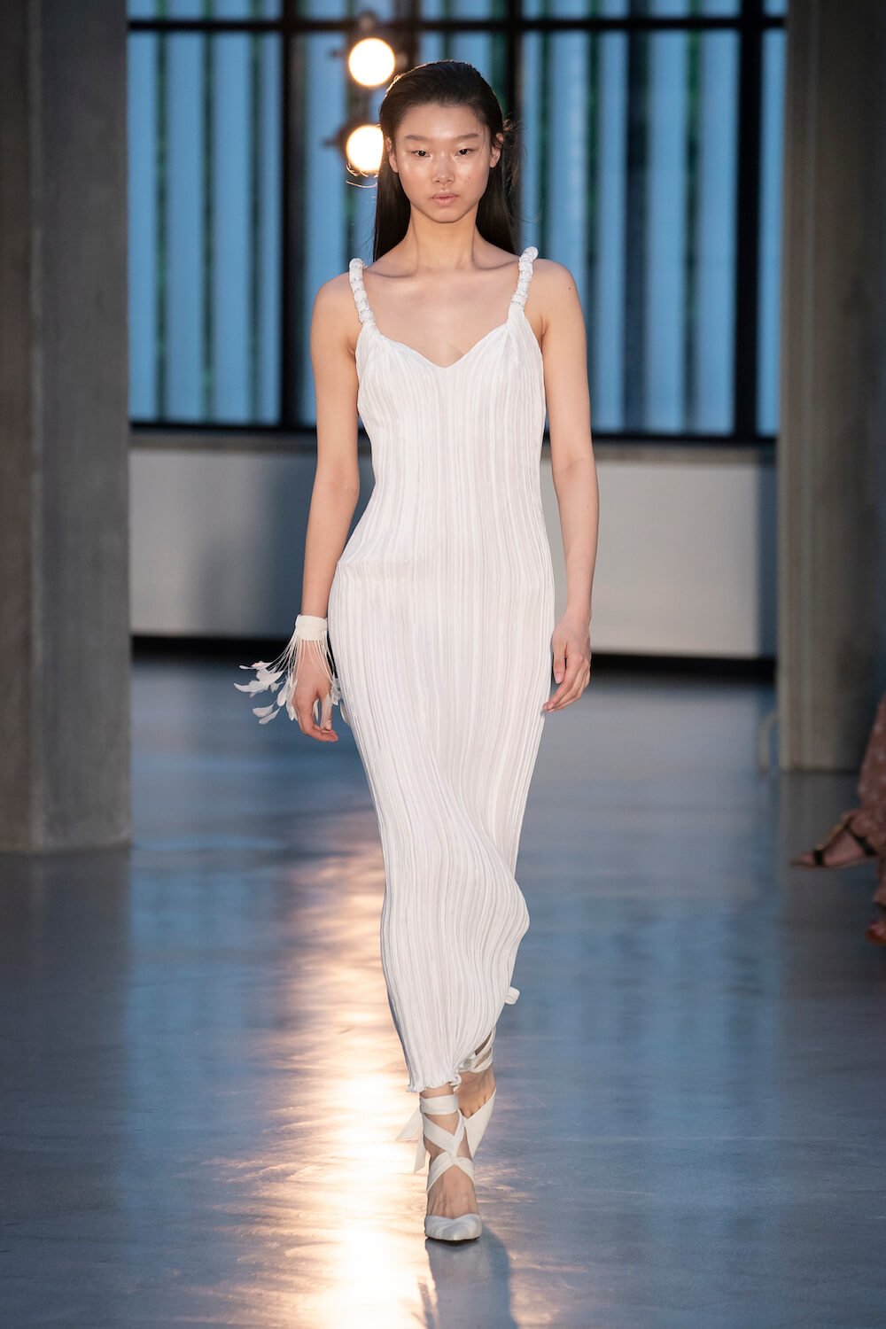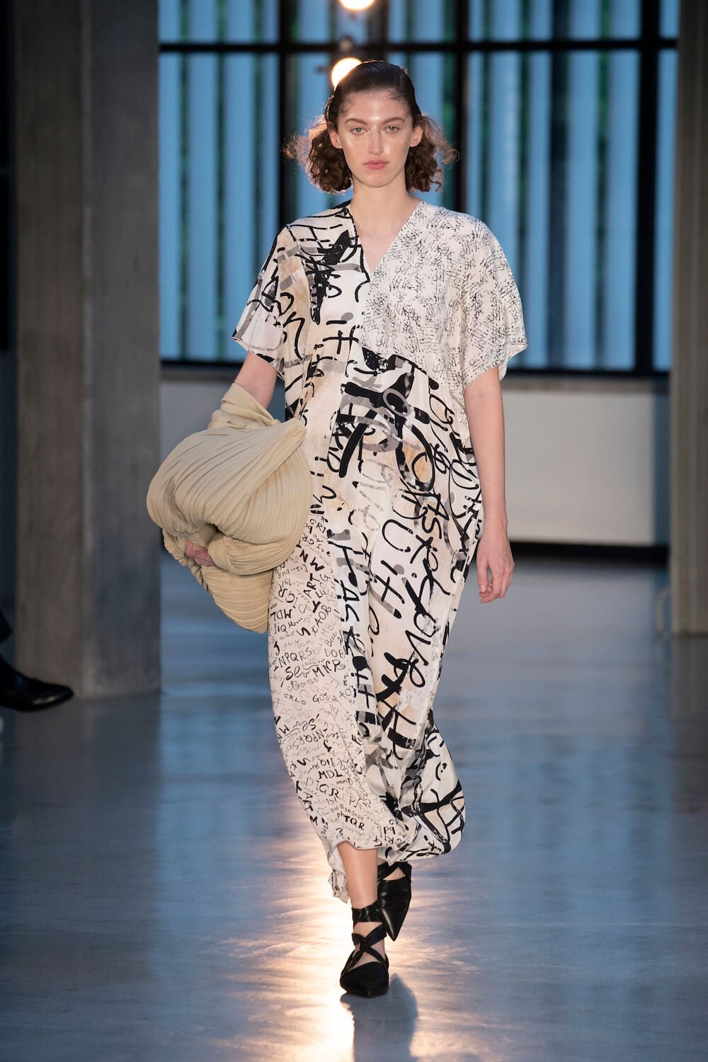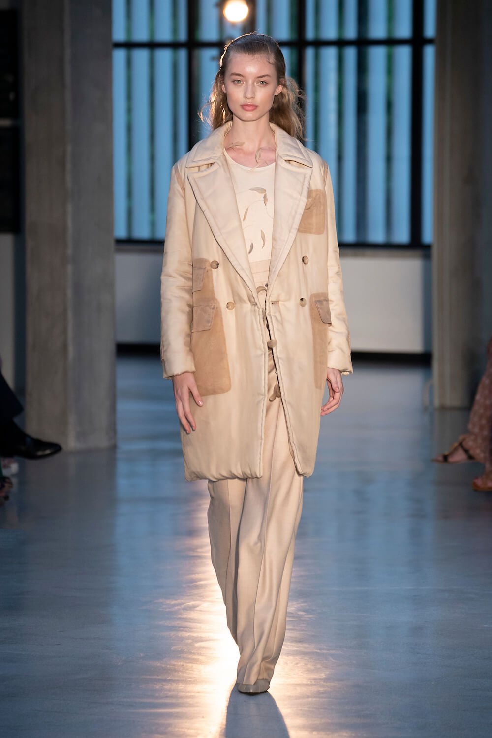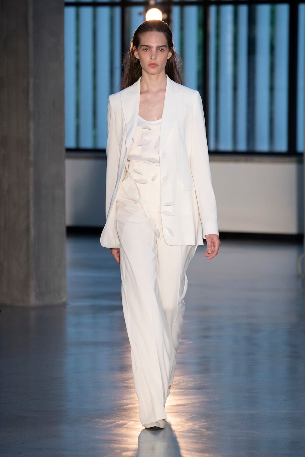 Max Mara may be a global mega brand with stores in 100 countries, but when it came to putting on its cruise show, there was no place like home. It makes sense when home is Reggio Emilia and a vast contemporary art collection housed in the former Max Mara industrial HQ. The show was held at Collezione Maramotti, which brims with major Twombly, Burri and Anselmo pieces collected by Max Mara founder Achille Maramotti. Designer Ian Griffiths took inspiration directly from the daring art housed there. The freshness of Pascali’s Coliseum relief inspired light transparencies and the chalky, neutral palette. The idea for crinkly pleats on tube skirts and evening dresses came from a rippled Manzoni sculpture and Griffiths pointed out an Anselmo sculpture, Torsione “which is probably one of the most pivotal pieces of Arte Povera, which for us was the inspiration for a shoulder strap- because we are not artists we are fashion designers.” That’s the magic of Max Mara: it combines great sophistication with something everyone can relate to. There was plenty here for every woman from the roomy coats to the slouchy trousers shown with simple vests and a silk cummerbund for evening. And it was all done with that special Italian know how. The finish was immaculate. “We do straight forward clothes that you can get on with your life in,” said Griffiths, “But they have this connection to avant garde art. This man, Achille Maramotti, who was making power dressing clothes in the 1980s was buying Bacons and and Burris. He was not a conservative thinker. He was forward thinking and radical. It puts an new perspective on the clothes.” Griffiths felt emotional backstage – he’s worked for the company for thirty years but this show gave him an opportunity to show a new side of Max Mara and Italian fashion. “People are saying negative things about Italy but look at Italian culture, Italian charm, Italian food and Italian fashion, which is all about making people Bella. It’s about making people look their best. I wanted to celebrate that.” That he did.