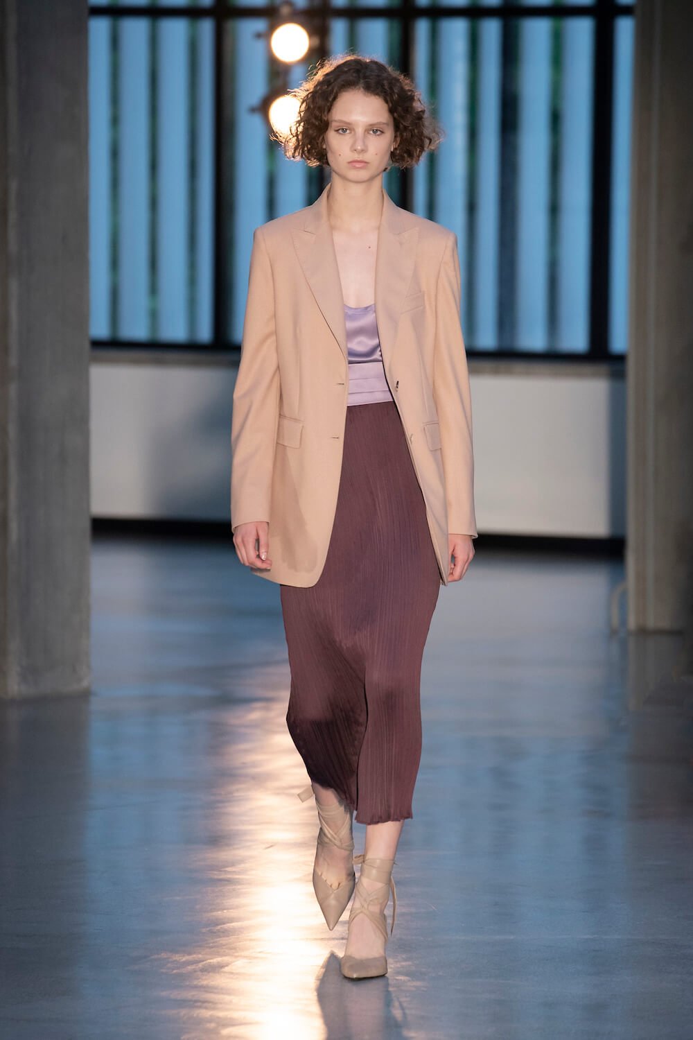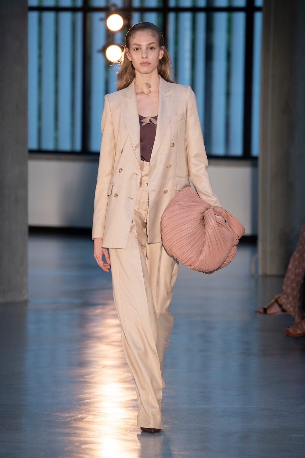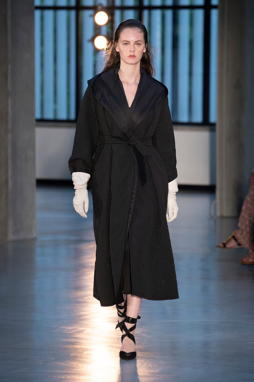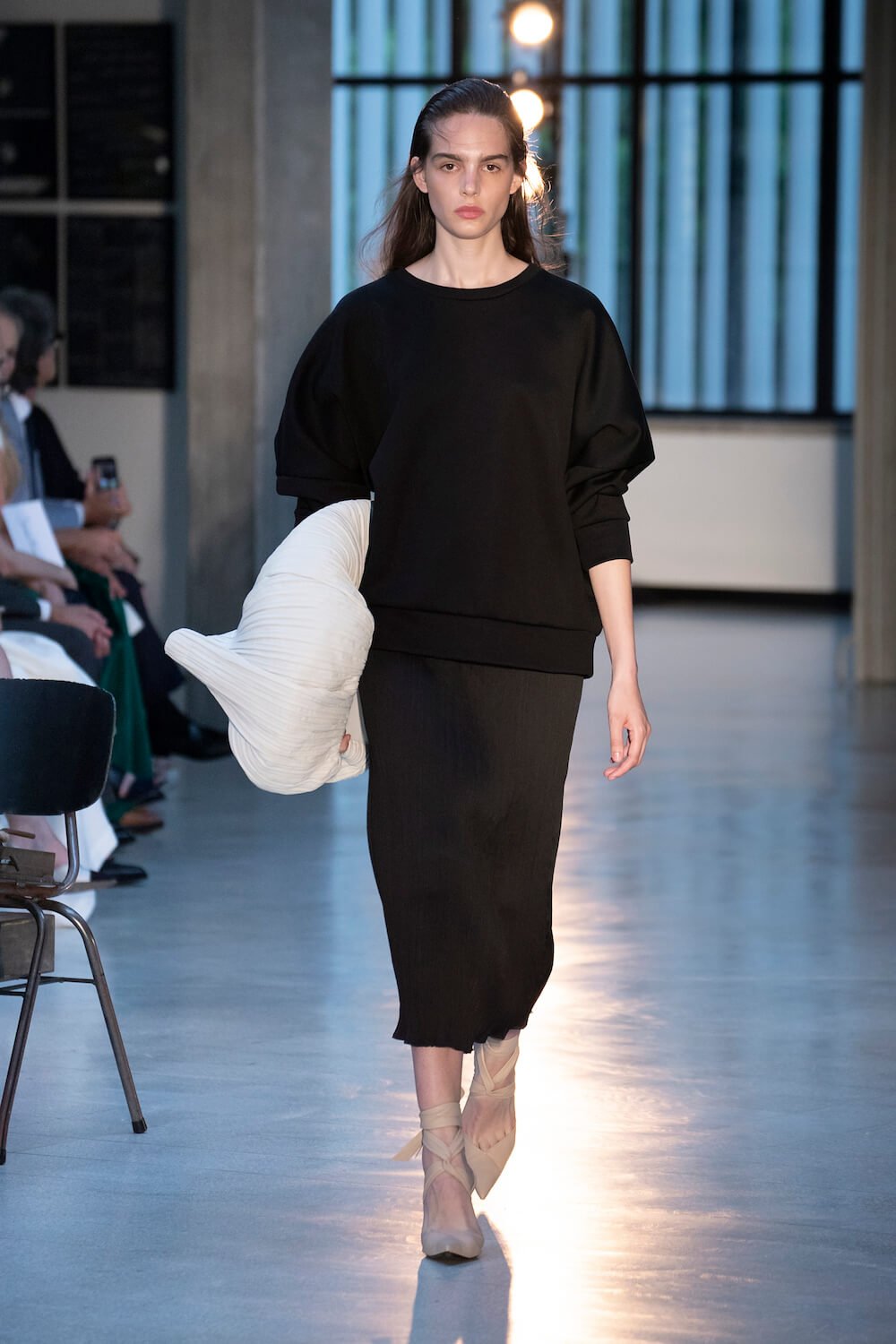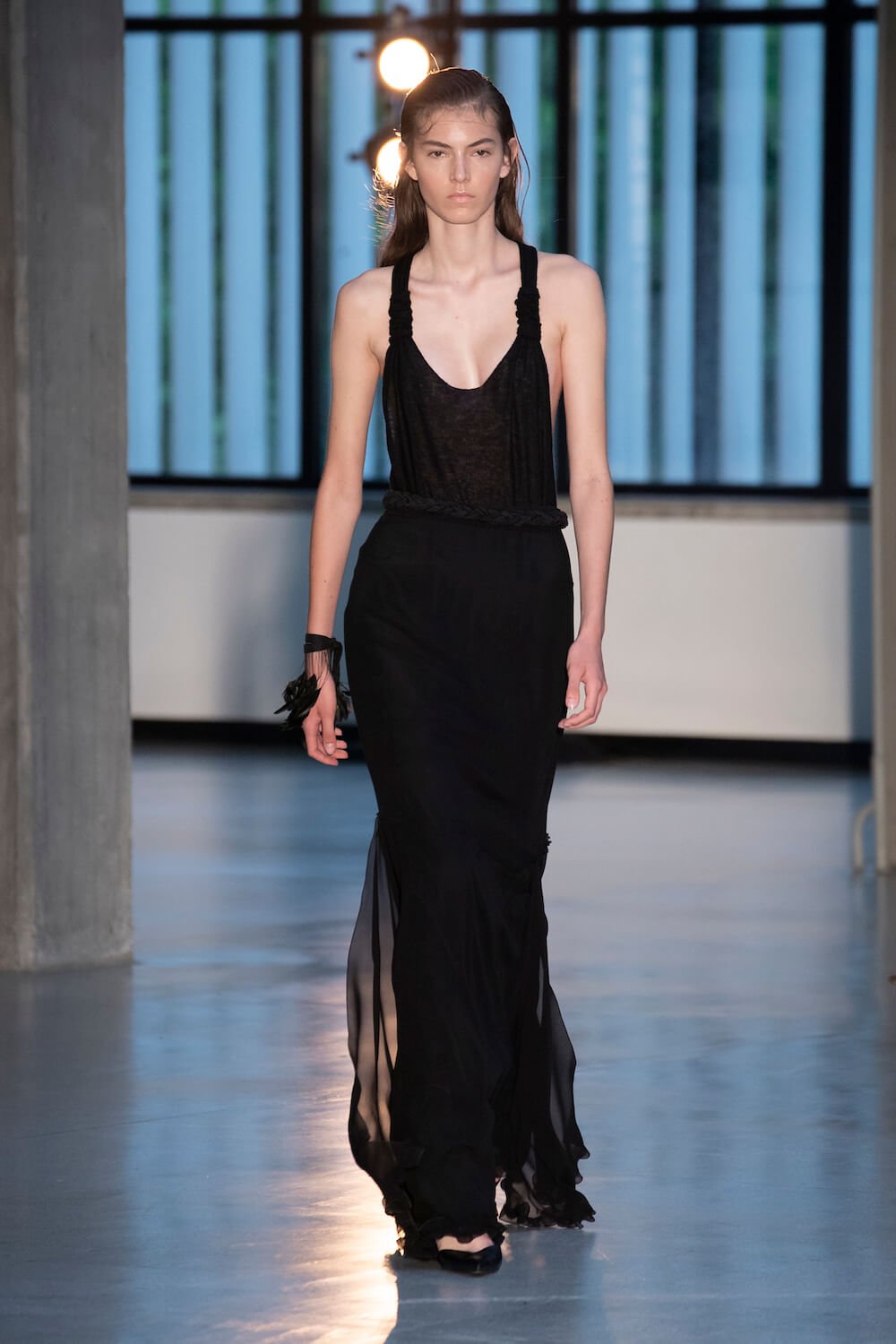 Max Mara may be a global mega brand with stores in 100 countries, but when it came to putting on its cruise show, there was no place like home. It makes sense when home is Reggio Emilia and a vast contemporary art collection housed in the former Max Mara industrial HQ. The show was held at Collezione Maramotti, which brims with major Twombly, Burri and Anselmo pieces collected by Max Mara founder Achille Maramotti. Designer Ian Griffiths took inspiration directly from the daring art housed there. The freshness of Pascali’s Coliseum relief inspired light transparencies and the chalky, neutral palette. The idea for crinkly pleats on tube skirts and evening dresses came from a rippled Manzoni sculpture and Griffiths pointed out an Anselmo sculpture, Torsione “which is probably one of the most pivotal pieces of Arte Povera, which for us was the inspiration for a shoulder strap- because we are not artists we are fashion designers.” That’s the magic of Max Mara: it combines great sophistication with something everyone can relate to. There was plenty here for every woman from the roomy coats to the slouchy trousers shown with simple vests and a silk cummerbund for evening. And it was all done with that special Italian know how. The finish was immaculate. “We do straight forward clothes that you can get on with your life in,” said Griffiths, “But they have this connection to avant garde art. This man, Achille Maramotti, who was making power dressing clothes in the 1980s was buying Bacons and and Burris. He was not a conservative thinker. He was forward thinking and radical. It puts an new perspective on the clothes.” Griffiths felt emotional backstage – he’s worked for the company for thirty years but this show gave him an opportunity to show a new side of Max Mara and Italian fashion. “People are saying negative things about Italy but look at Italian culture, Italian charm, Italian food and Italian fashion, which is all about making people Bella. It’s about making people look their best. I wanted to celebrate that.” That he did.