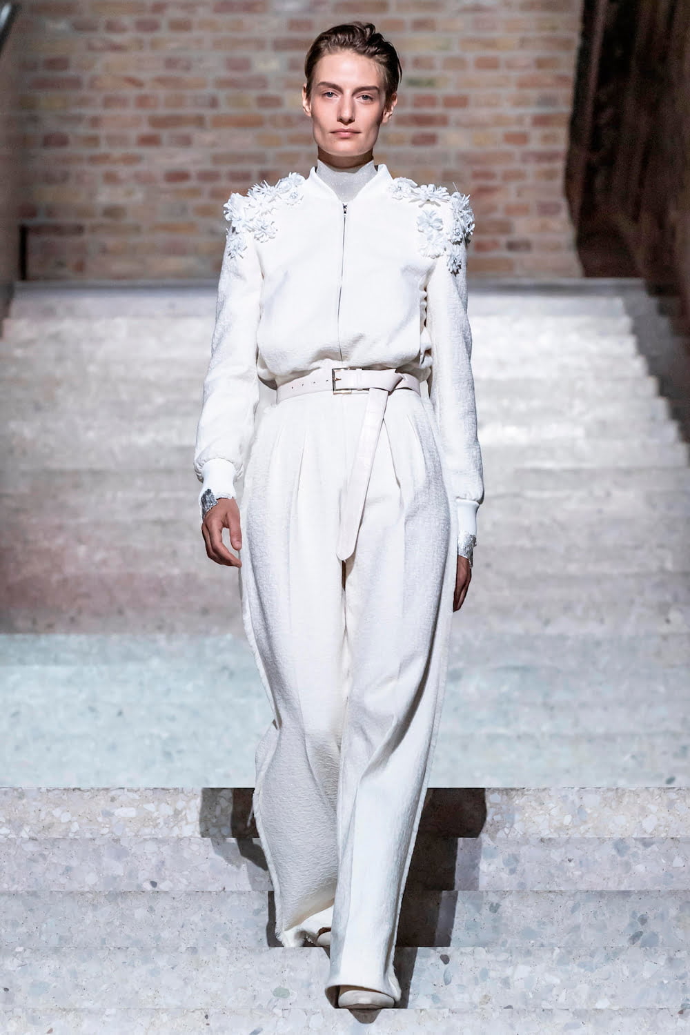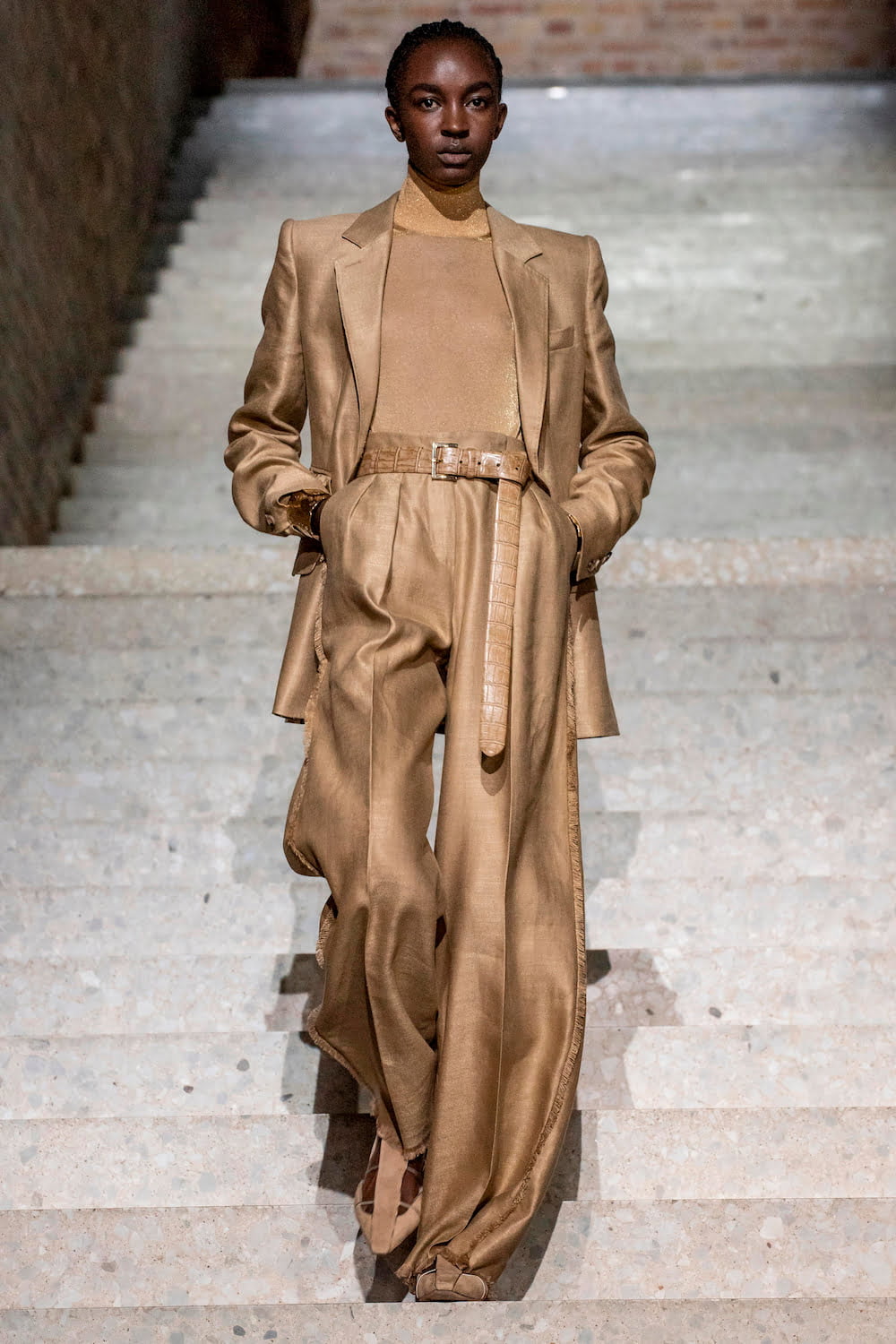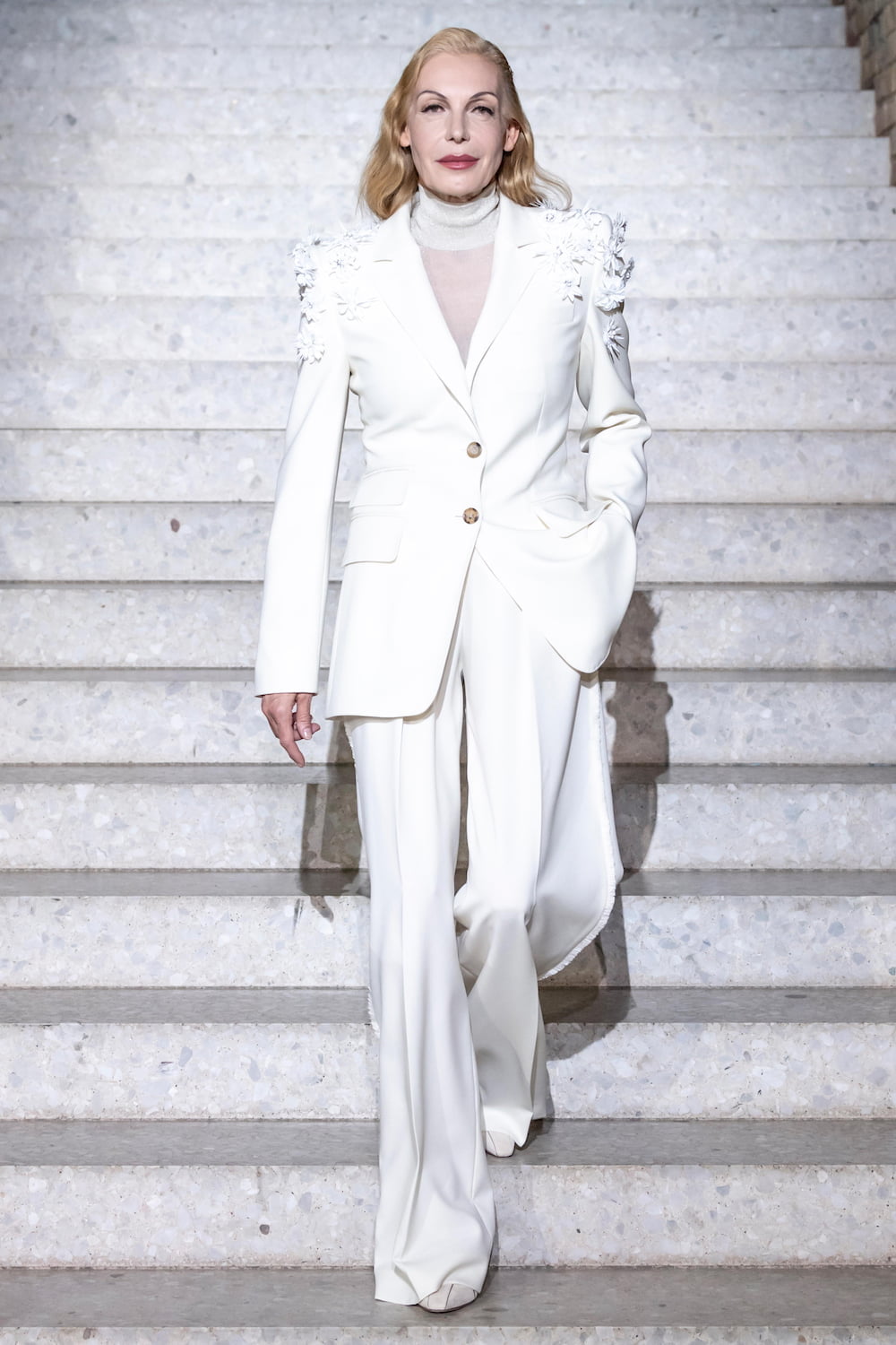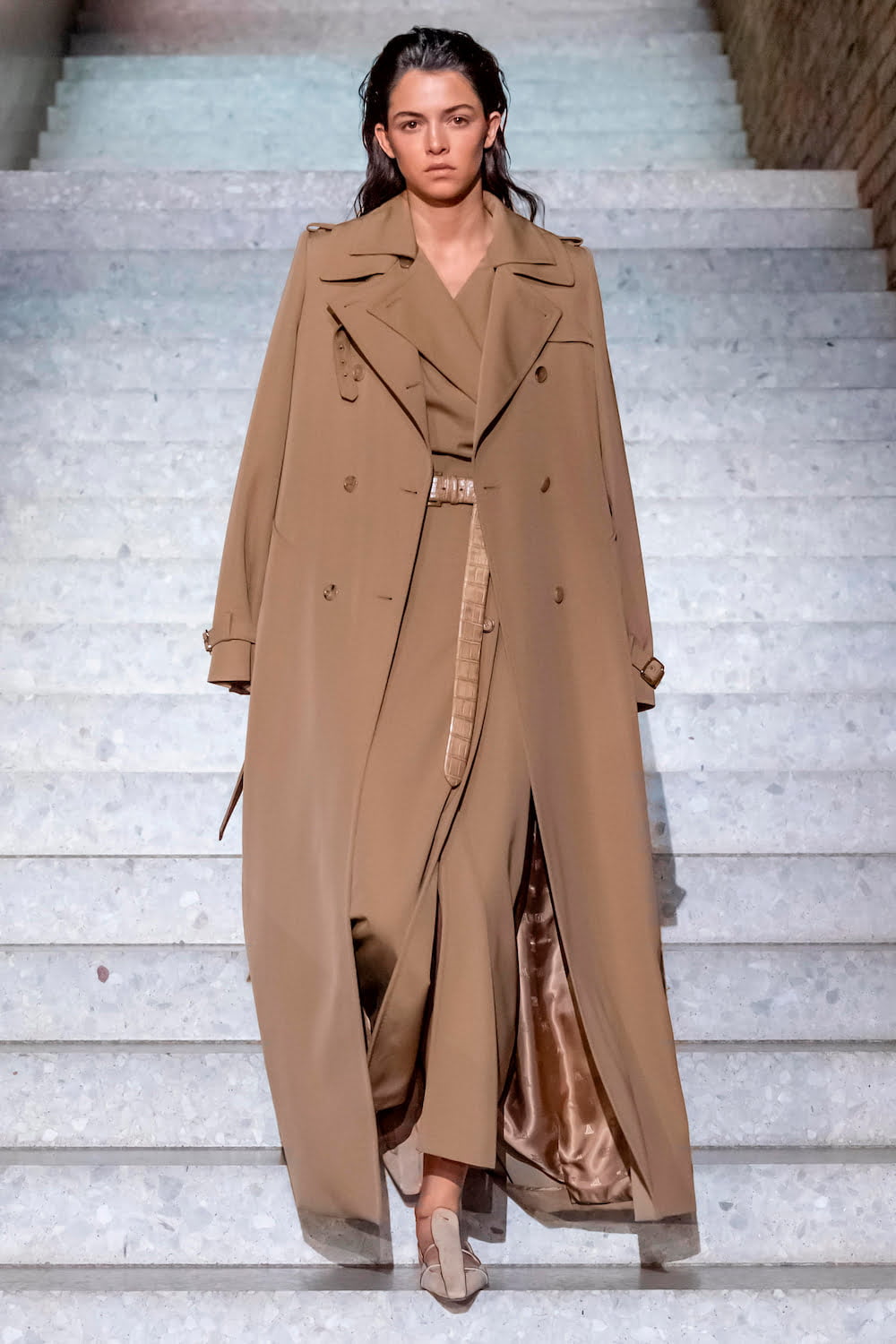 Against this potent backdrop Max Mara showed. Creative Director Ian Griffiths picked up the thread of ancient cultures and wove them together with the free spirit of Berlin – the masculine suits of Marlene Dietrich and the androgyny of David Bowie. This collection was an ode to tailoring but not the bland corporate kind. Trouser suits formed the backbone of almost every look. Trench coats added clandestine glamour, evening looks followed the same silhouette as day but glimmered with golden thread. The colours echoed the sandy bleached out tones of the exquisite antiquities found in the museum’s galleries. The brand paid homage to the city – its history, craft and complexities with the Berlin coat: porcelain white, strictly tailored but adorned with embroidered flowers inspired by Meissen. Max Mara arrived at its own sense of classicism when Ute Lemper and Carolyn Murphy crossed paths on the runway. Timeless talented women – they are part of the Max Mara DNA.