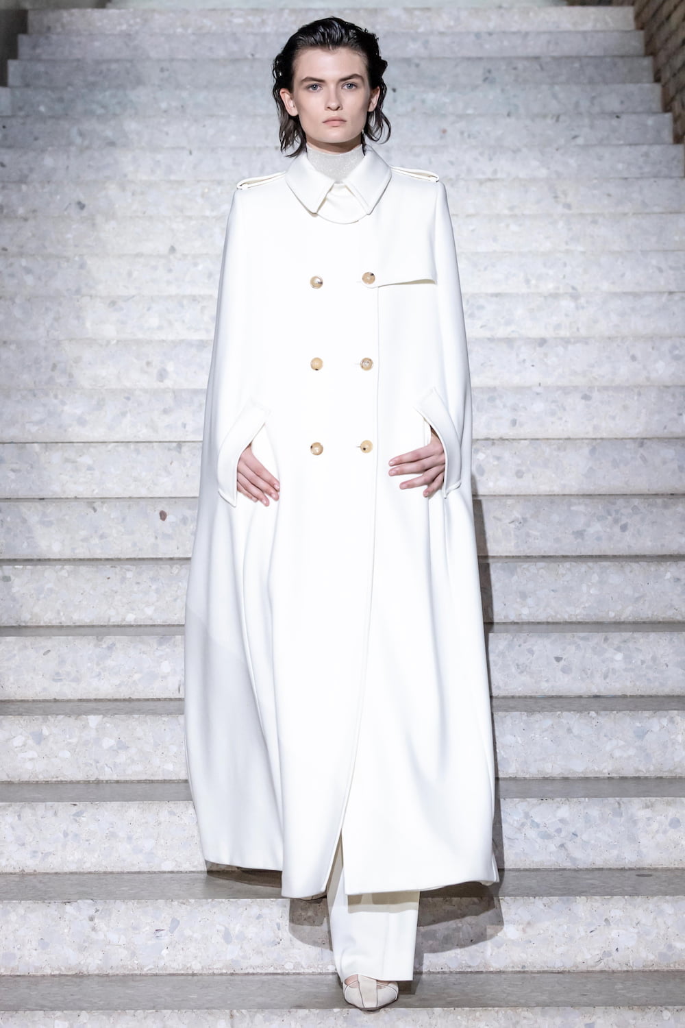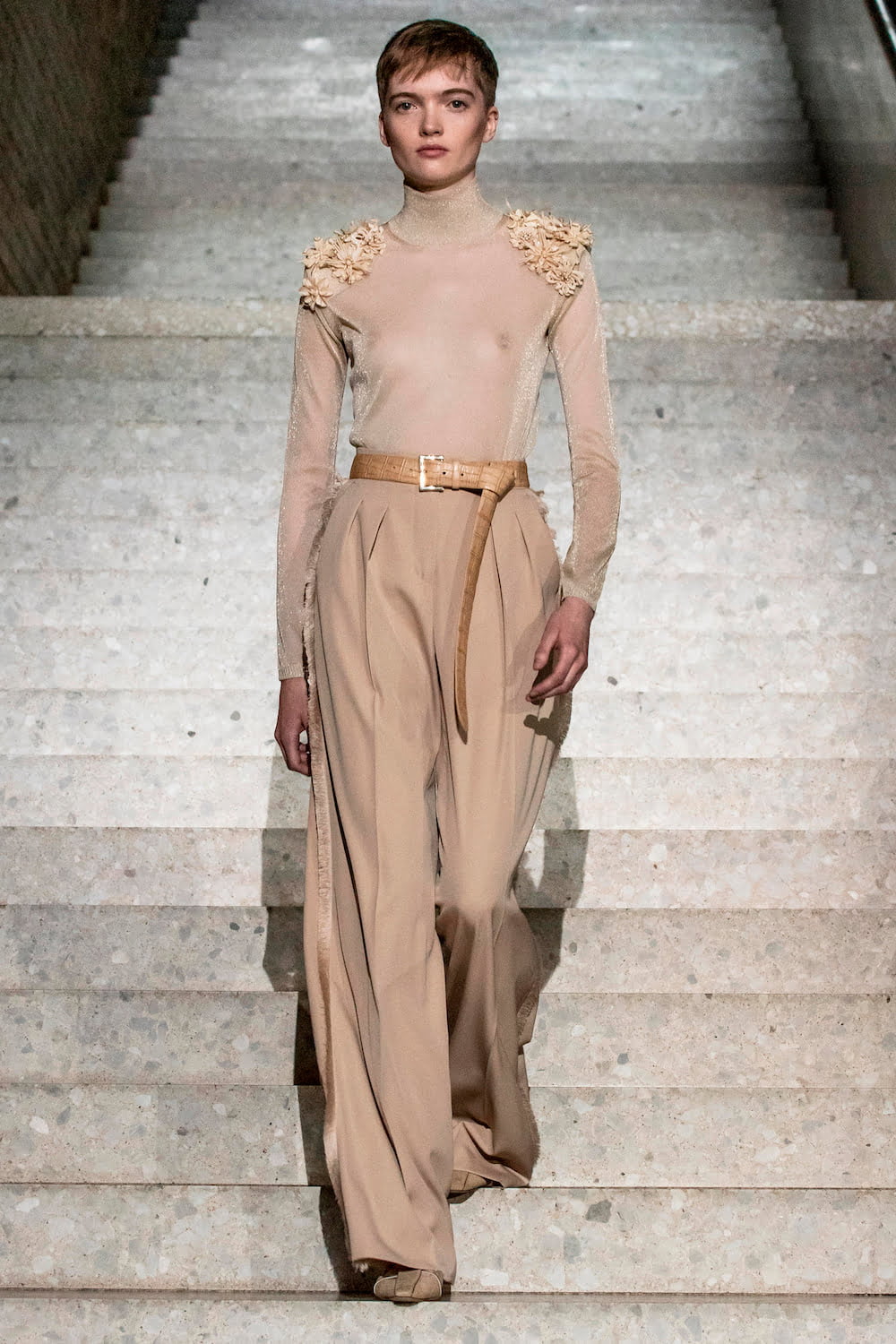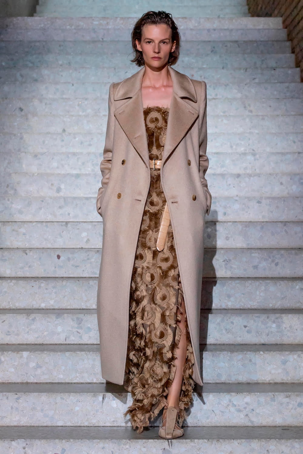 Against this potent backdrop Max Mara showed. Creative Director Ian Griffiths picked up the thread of ancient cultures and wove them together with the free spirit of Berlin – the masculine suits of Marlene Dietrich and the androgyny of David Bowie. This collection was an ode to tailoring but not the bland corporate kind. Trouser suits formed the backbone of almost every look. Trench coats added clandestine glamour, evening looks followed the same silhouette as day but glimmered with golden thread. The colours echoed the sandy bleached out tones of the exquisite antiquities found in the museum’s galleries. The brand paid homage to the city – its history, craft and complexities with the Berlin coat: porcelain white, strictly tailored but adorned with embroidered flowers inspired by Meissen. Max Mara arrived at its own sense of classicism when Ute Lemper and Carolyn Murphy crossed paths on the runway. Timeless talented women – they are part of the Max Mara DNA.