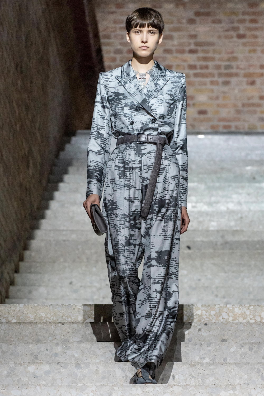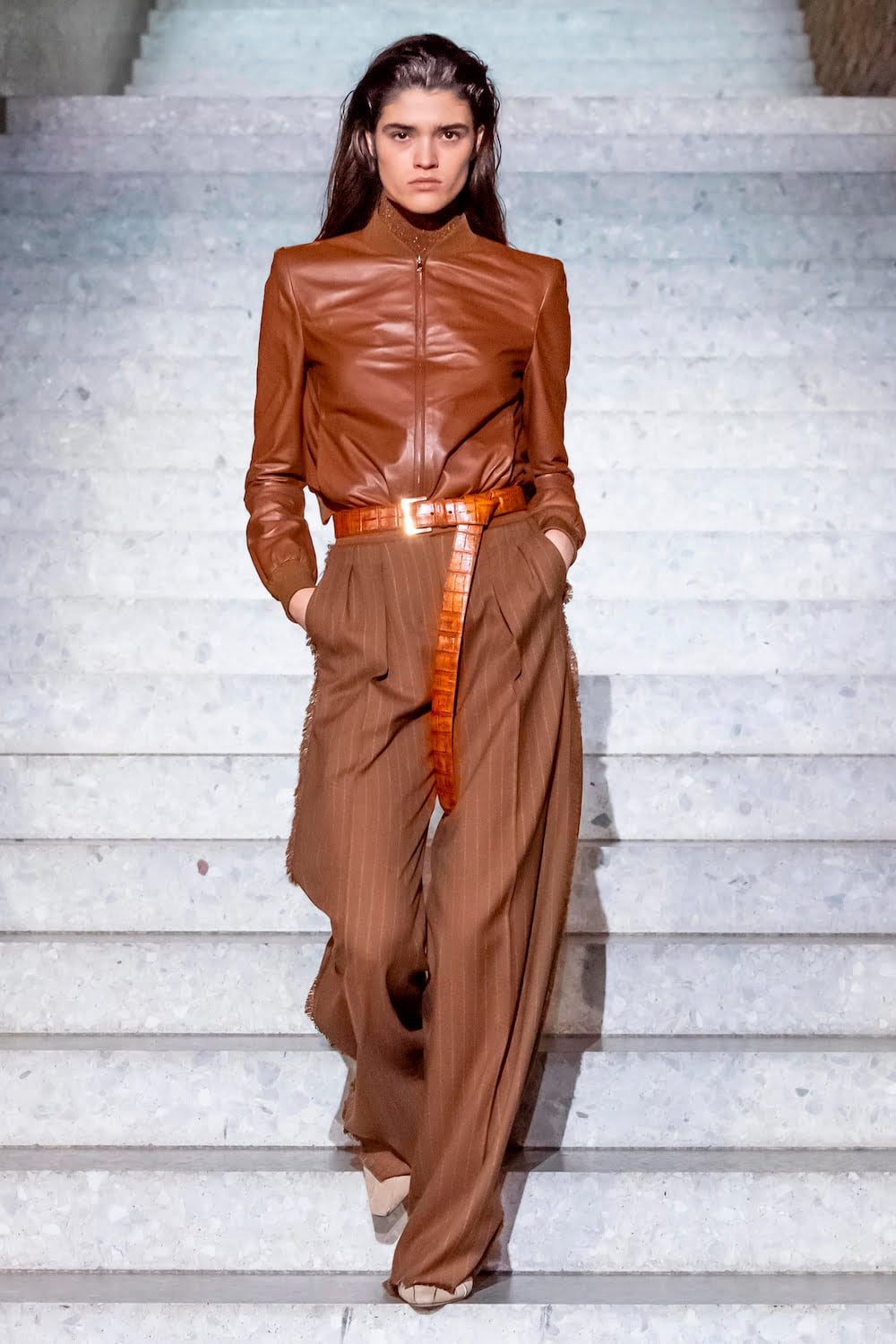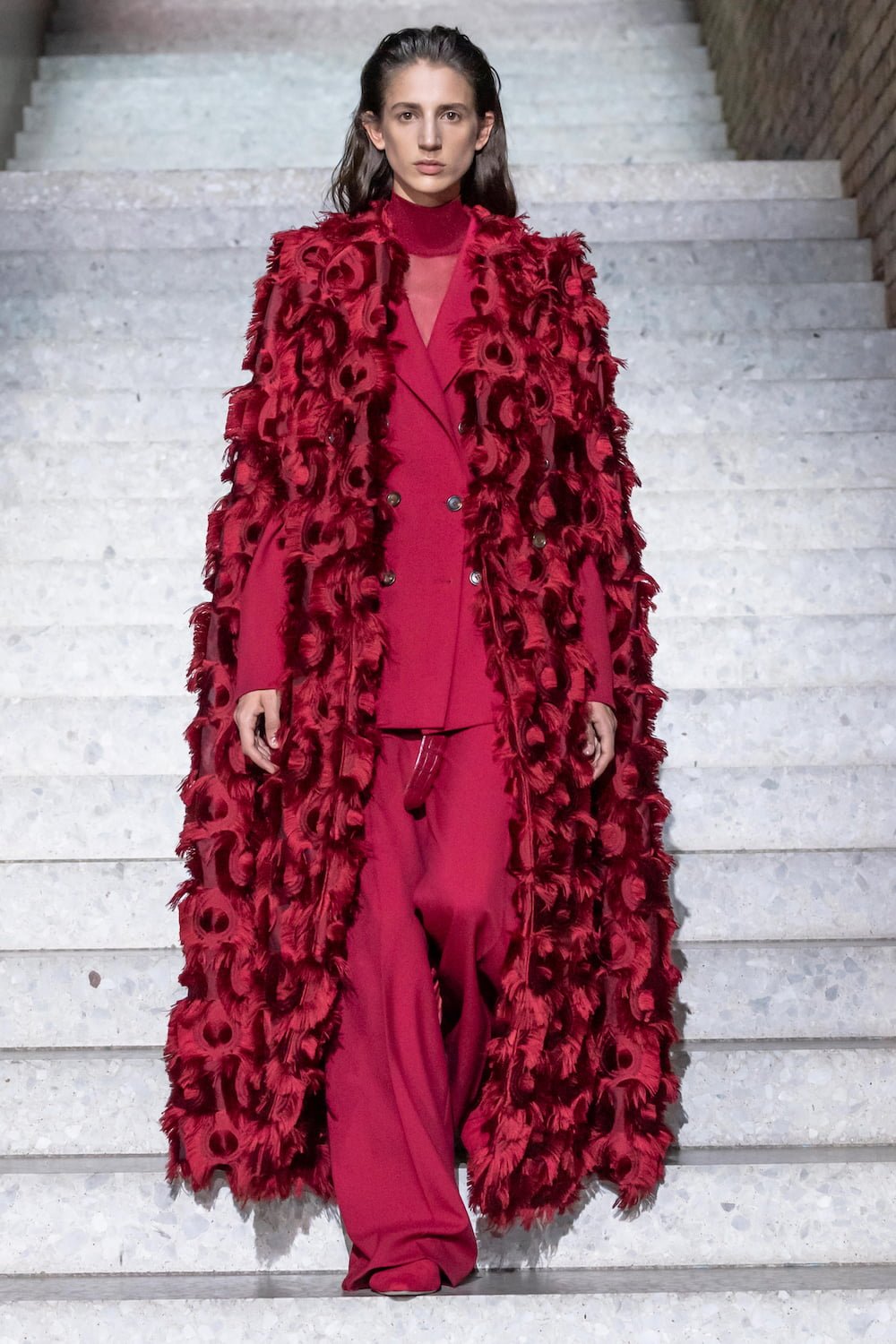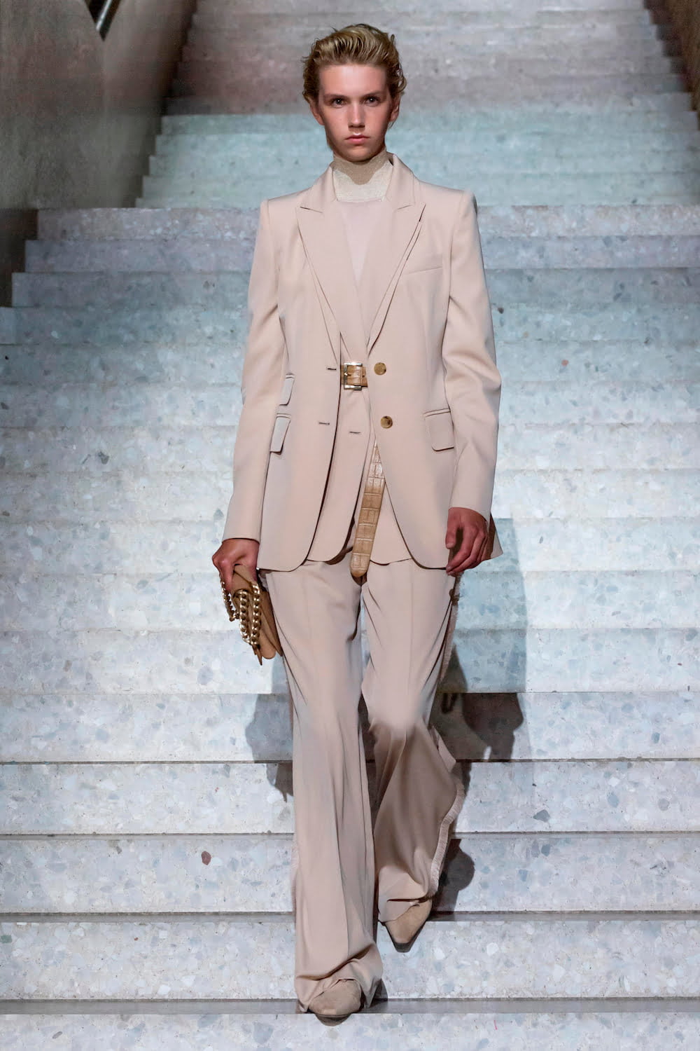 Against this potent backdrop Max Mara showed. Creative Director Ian Griffiths picked up the thread of ancient cultures and wove them together with the free spirit of Berlin – the masculine suits of Marlene Dietrich and the androgyny of David Bowie. This collection was an ode to tailoring but not the bland corporate kind. Trouser suits formed the backbone of almost every look. Trench coats added clandestine glamour, evening looks followed the same silhouette as day but glimmered with golden thread. The colours echoed the sandy bleached out tones of the exquisite antiquities found in the museum’s galleries. The brand paid homage to the city – its history, craft and complexities with the Berlin coat: porcelain white, strictly tailored but adorned with embroidered flowers inspired by Meissen. Max Mara arrived at its own sense of classicism when Ute Lemper and Carolyn Murphy crossed paths on the runway. Timeless talented women – they are part of the Max Mara DNA.