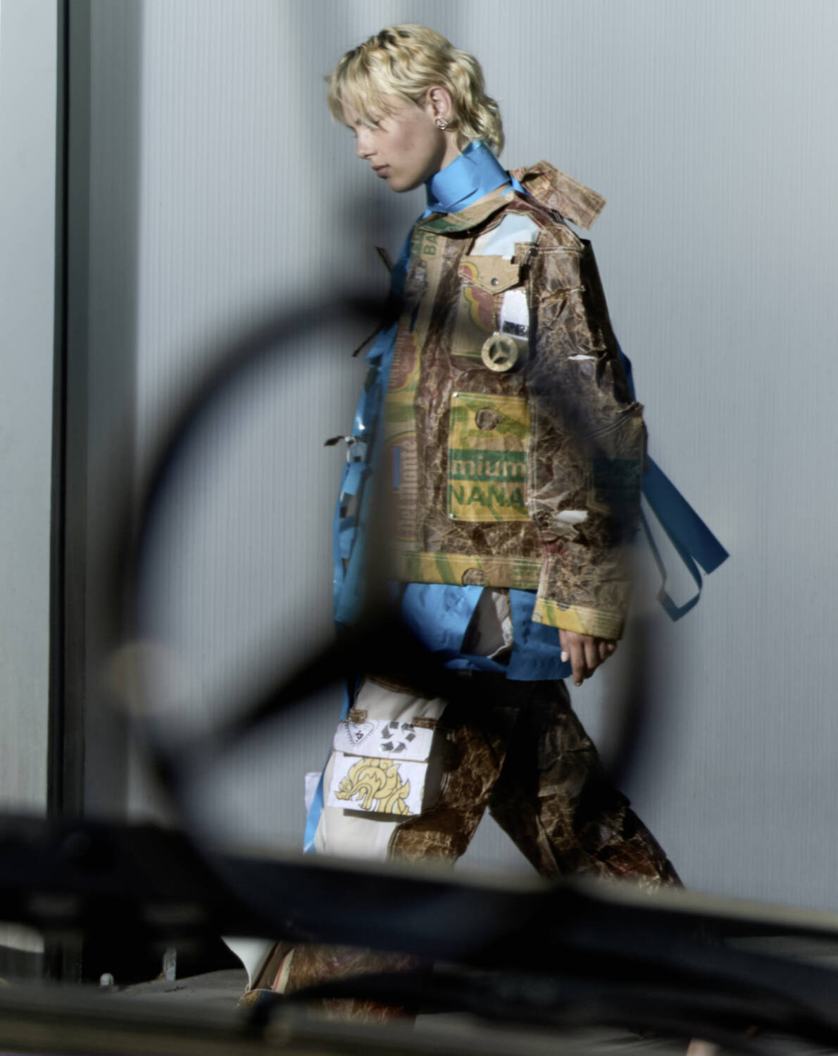 Before announcing Goff as the winner, Mercedes-Benz ran a mentorship programme, where each of the ten finalists were instructed in the latest sustainable design practices and repurposing materials became a common thread amongst them. Gaëlle Halloo Lang spliced-up and reassembled second-hand pieces like football jerseys, Julie Mouly-Pommerol upcycled her grandmother’s shirts to create a 1920s-esque draped dress, and Japanese designer Kenshiro Suzuki used ninety-percent biodegradable materials in his everyday ensemble. Designer duo, La Cage’s use of sun-faded and buried-and-unburied fabrics also played with the ideas of use, reuse, construction and deconstruction. The same can be said for Romain Bichot, whose dramatic, inventive use of deadstock fabrics has seen him take the helm as a junior ready-to-wear designer at Balenciaga, Fabian Kis-Juhasz, who presented a rebellious take on traditional wedding attire, and Tal Maslavi, who showcased leather goods designed to look like cake… and a massage-chair-trouser-hybrid.
