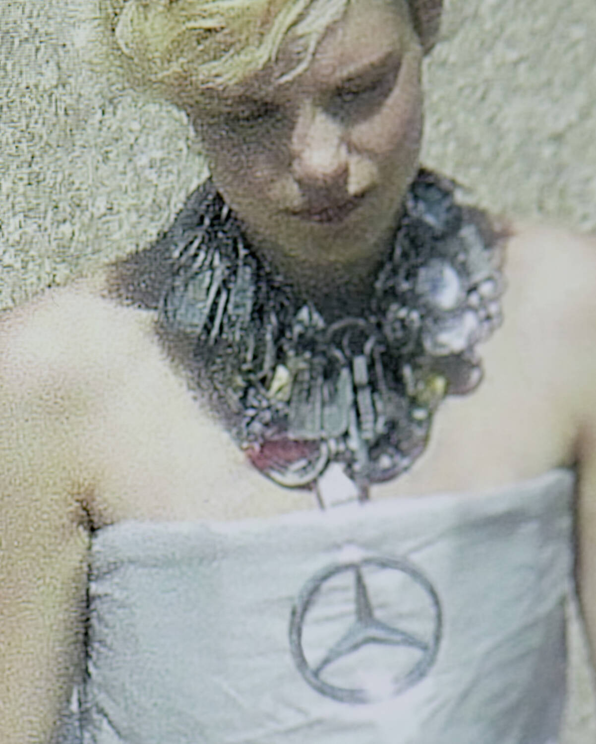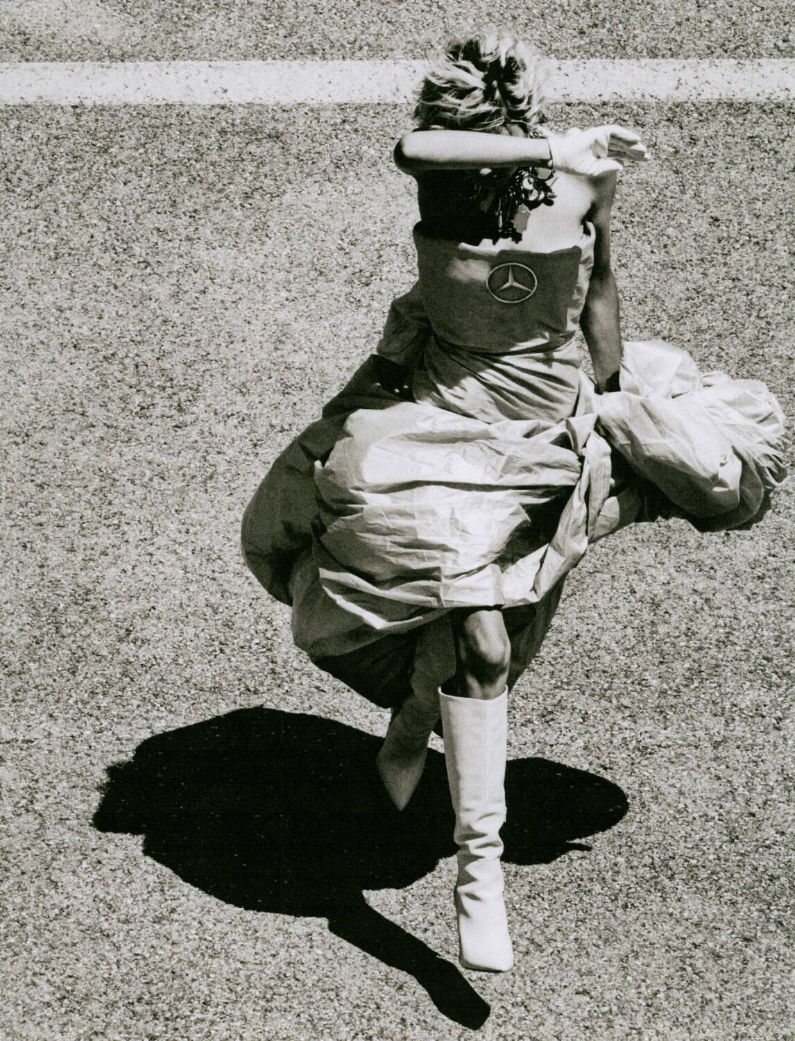 To “create” a new look who would be sustainable, while the production of this new look in itself would put in question the sustainability of it. My base of reflection was all those couture gowns, made only for a “one time in a life”. My look for Mercedes-Benz is a car cover, draped on a corset, and pined to itself. I bought it in a shop next to my apartment, kept the receipt and will bring it back in its original state to the shop. The « one time in a life » dress.