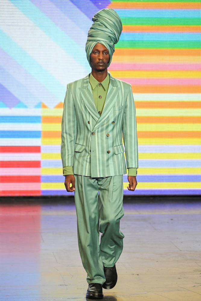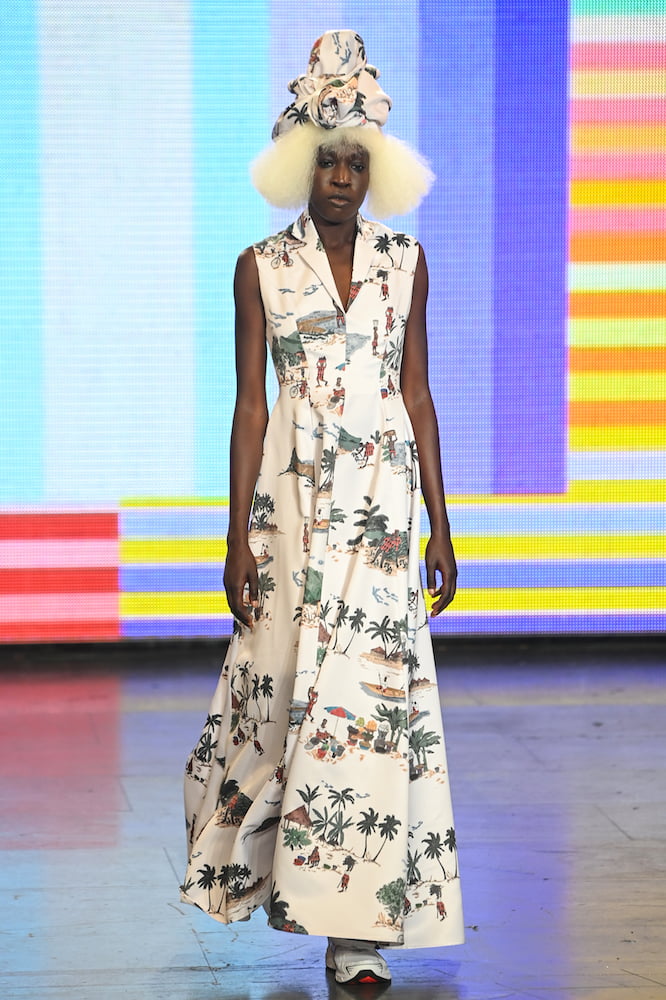 Labrum’s designer Foday Dumbuya hails from Sierra Leone, growing up between Freetown, London and Cyprus (this summer, he was given the job of designing Sierra Leone’s Olympic uniform). Though based in East London, he designs his collections with Madam Wokie Skills Development; an organization in Freetown that provides economic opportunities and practical skills for women. Labrum’s SS22 outing was dedicated to the style and culture brought over to Britain by Caribbean and African migrants through the seventies. Dubbed The Sound of Movement, models strolled in British tailoring cut with West African accents, whether it be exaggerated collars or flared sleeves. Blazers, overcoats and suit trousers came decorated in illustrations depicting village life in Dumbuya’s native country, as well as tribal masks and tie-dye prints by Yinka Ilori.