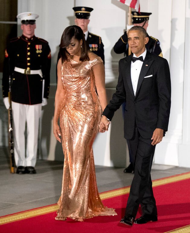 Nothing says “I’m out of here” in a more decisive way than a swift swish of a full-length golden chainmail gown. Really – try it. Even more so when said gown is Atelier Versace, and you are not mere mortal human but Michelle Obama, First Lady of the United States and general all-round goddess, and you are not, in fact, storming out of any old function, but actually your final state dinner, hosting the Italian Prime Minister in The White House. Not that she actually stormed out, of course, Mobama is far too elegant and poised for that. No, instead, she just schooled us with a lesson in opulent goddess realness. Like she’d been dunked in a large vat of gold and only dates men worth over a 20 million dollars. Ms Donatella, creator of extraordinary gown, offered her thoughts via social media this morning, writing: “I am humbled and honored to have had the opportunity to dress the First Lady of the United States, Michelle Obama. Thank you, Michelle, for all the things you have done for America and for the world, and especially, for empowering and inspiring women everywhere.” Here here. And, after that impeccable serving of face on the cover of T Magazine earlier this week, I am, to put it mildly, wildly obsessed with the exiting First Lady. Can we just say fuck the election now and crown Mobama and her exquisitely formed upper arms Madame President? Please?