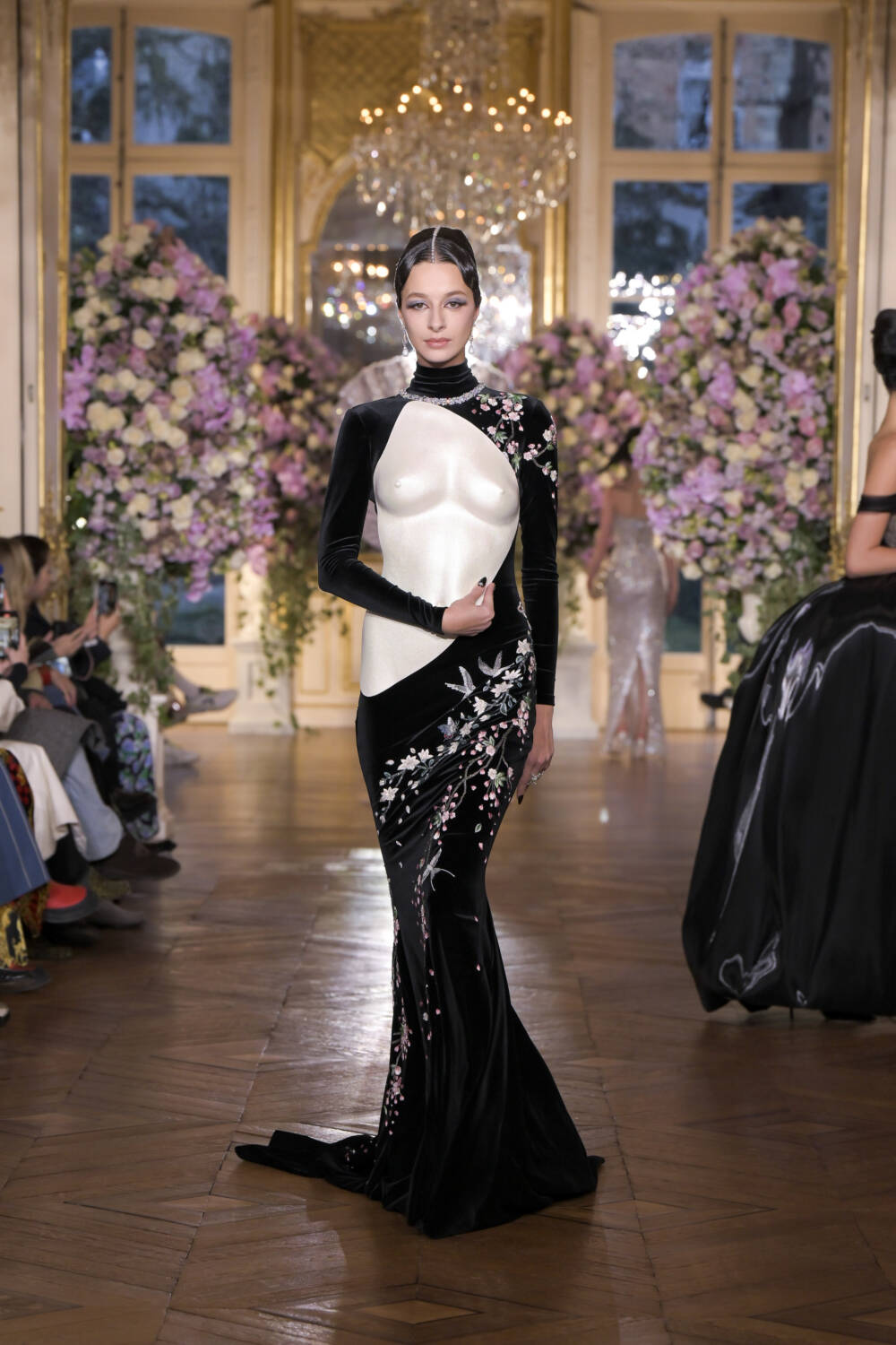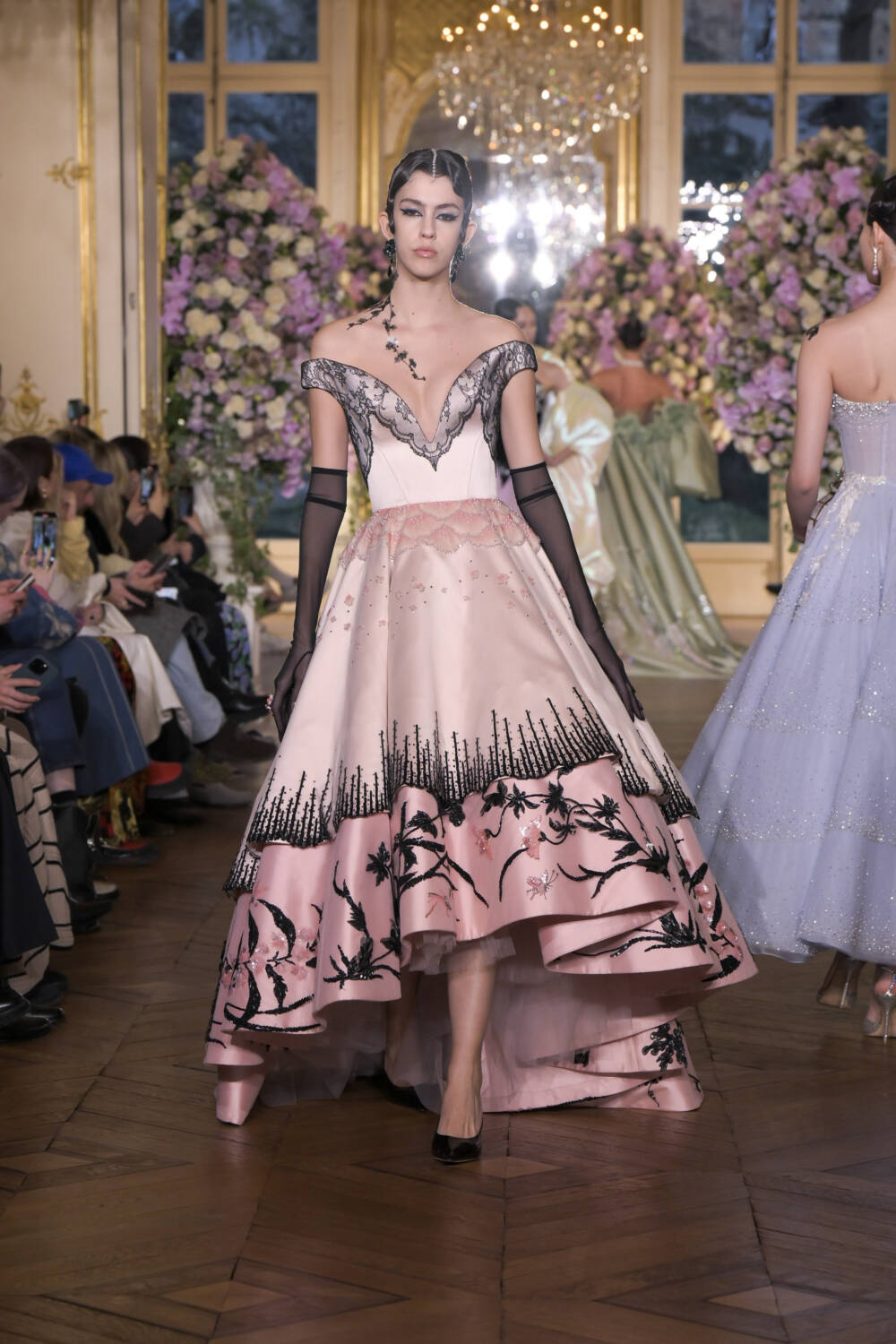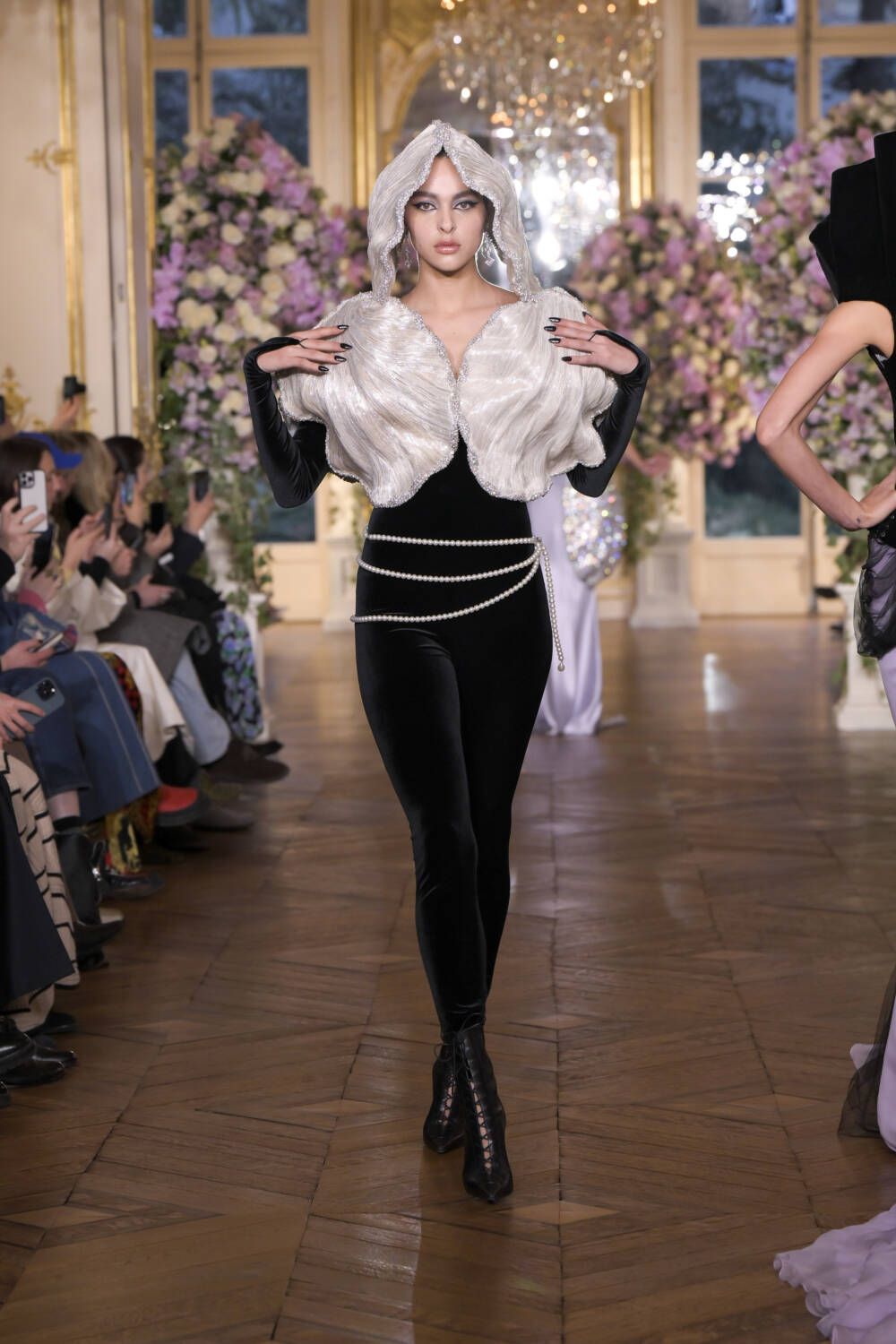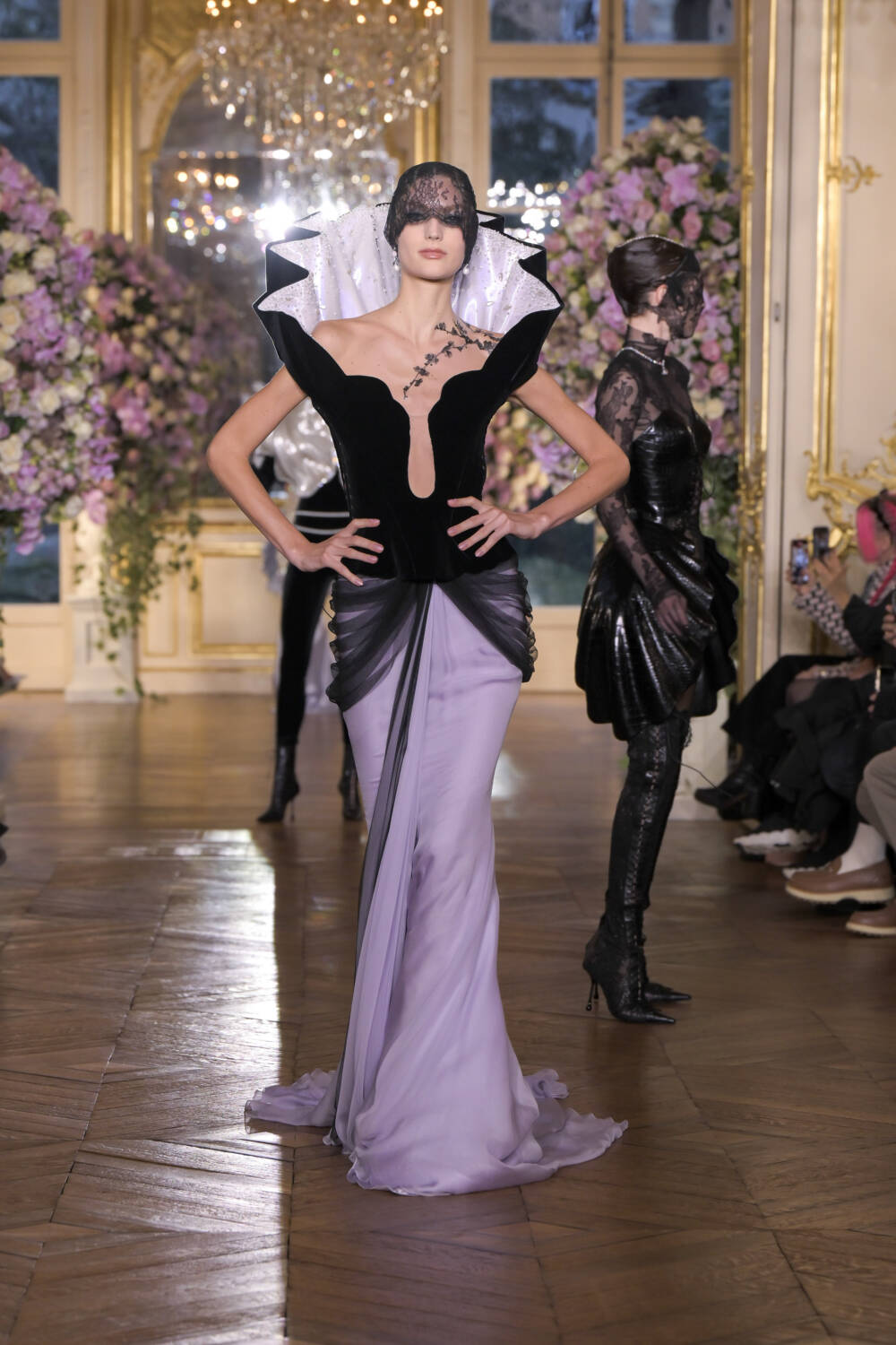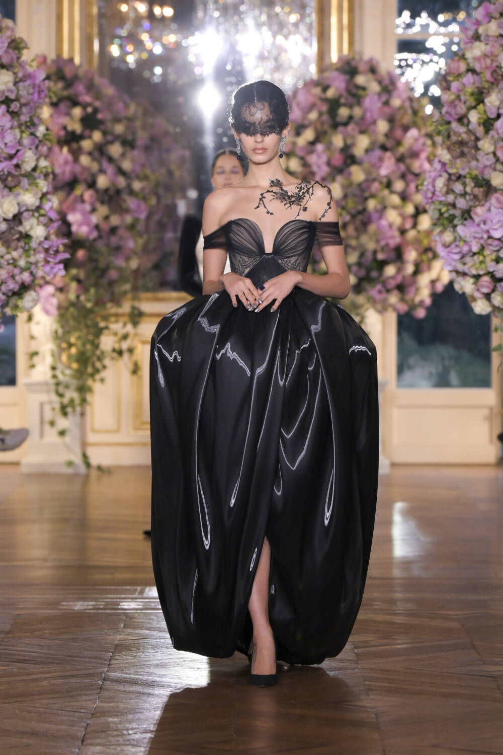 Curving, pearlescent bodices topped slinking velvet gowns. Shell-like structures shrouded shoulders, and oyster-like jaws crafted from leather popped over hips. Black chantilly lace was used to veil faces and craft corsets for a more sultry tone, and sheer gowns cemented this feeling of subtle sexiness. Layers of petticoats and draped silk were introduced to enhance the elegance.