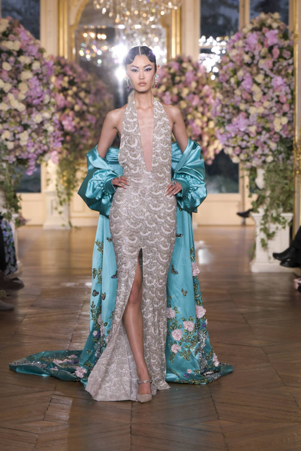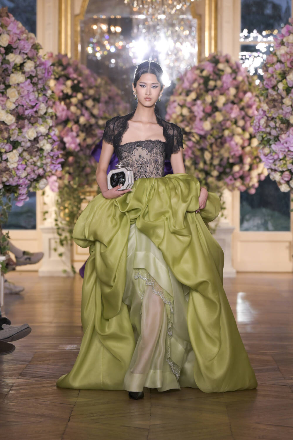 There were references to traditional Korean dress through craftsmanship, with the traditional mother-of-pearl inlaying technique of Najeonchilgi used on bodices and accessories. Minhwa, a Korean folk art, inspired the grandiose silhouettes as canvases. Royal levels of elaborate, Miss Sohee’s design language is couture to the core.