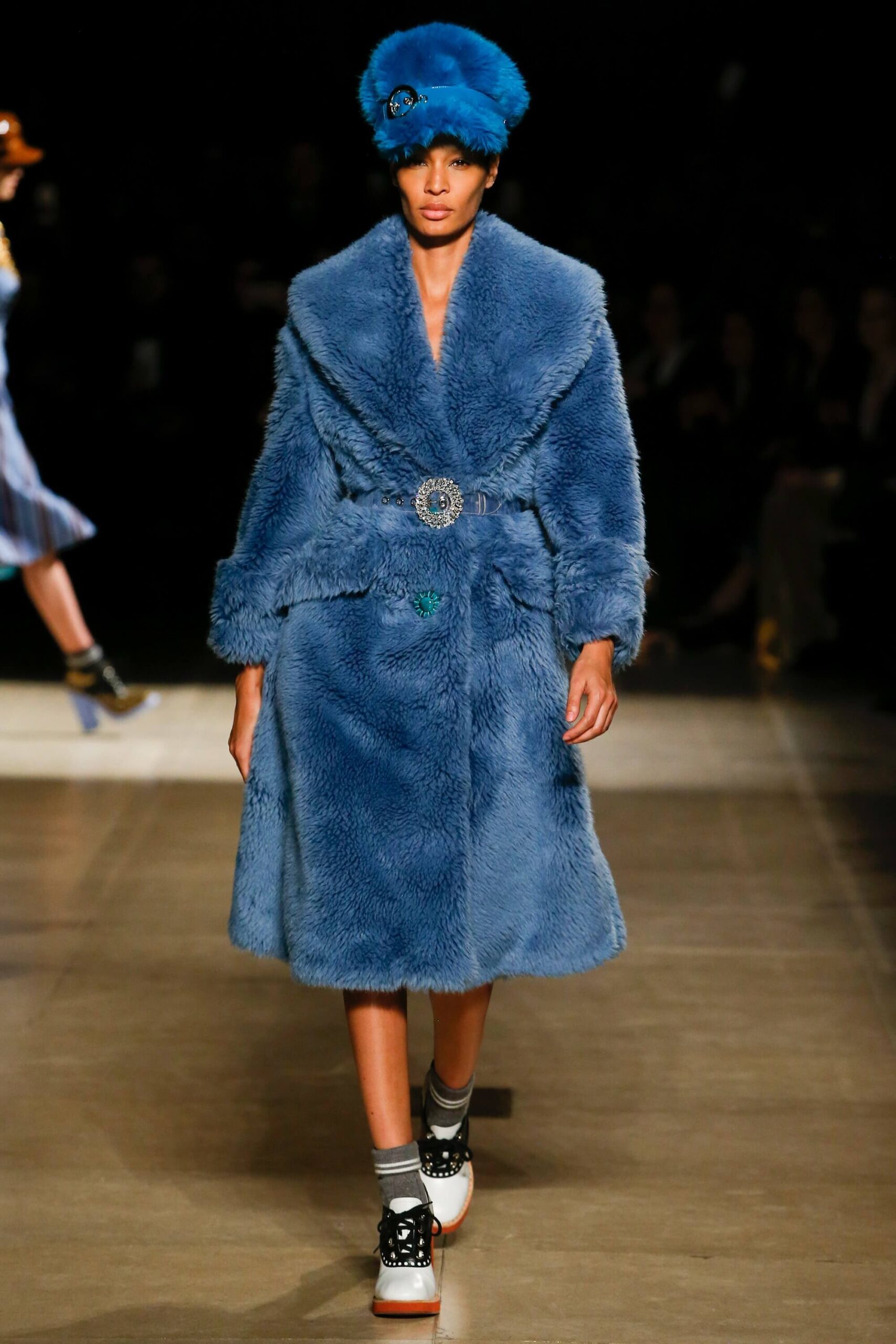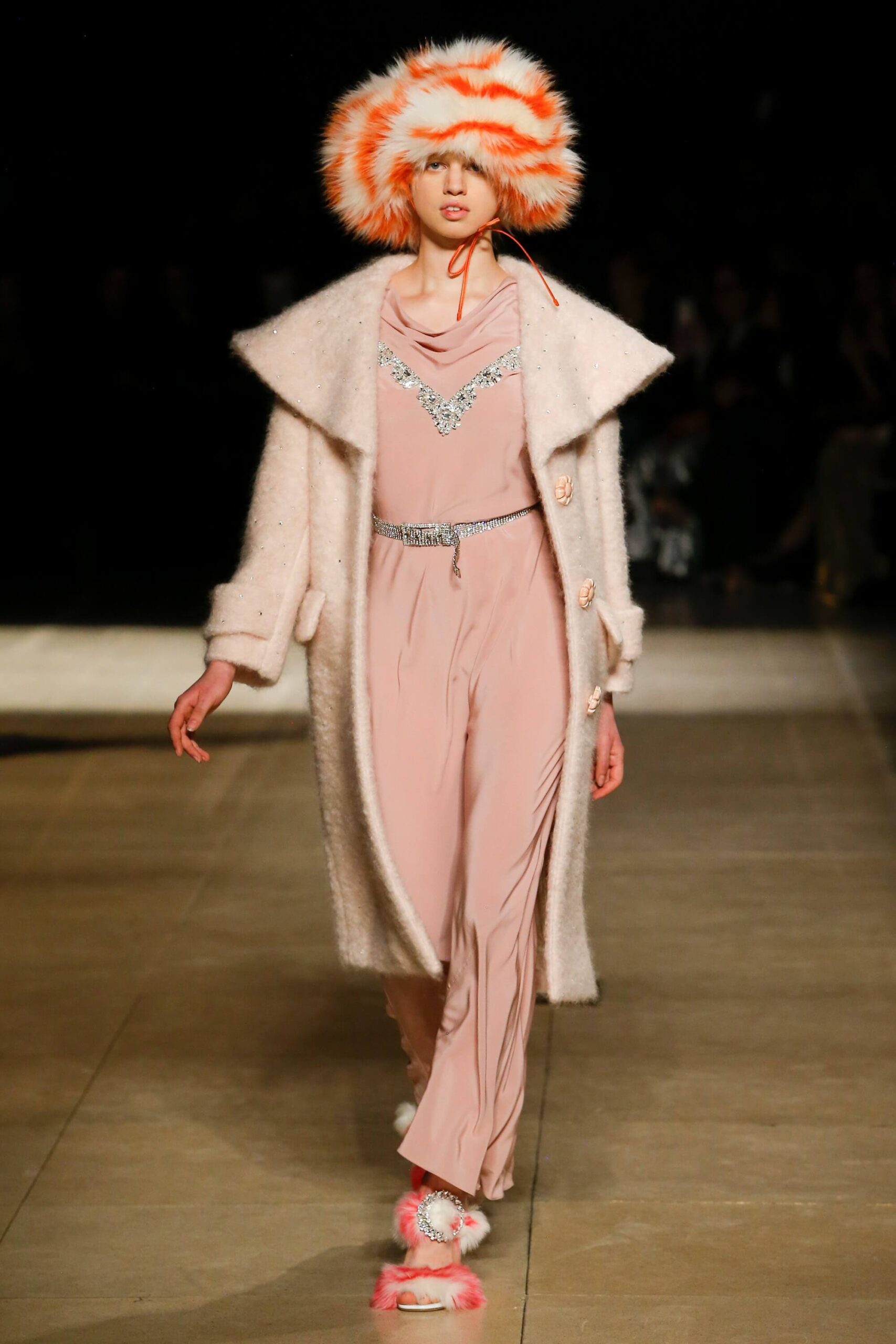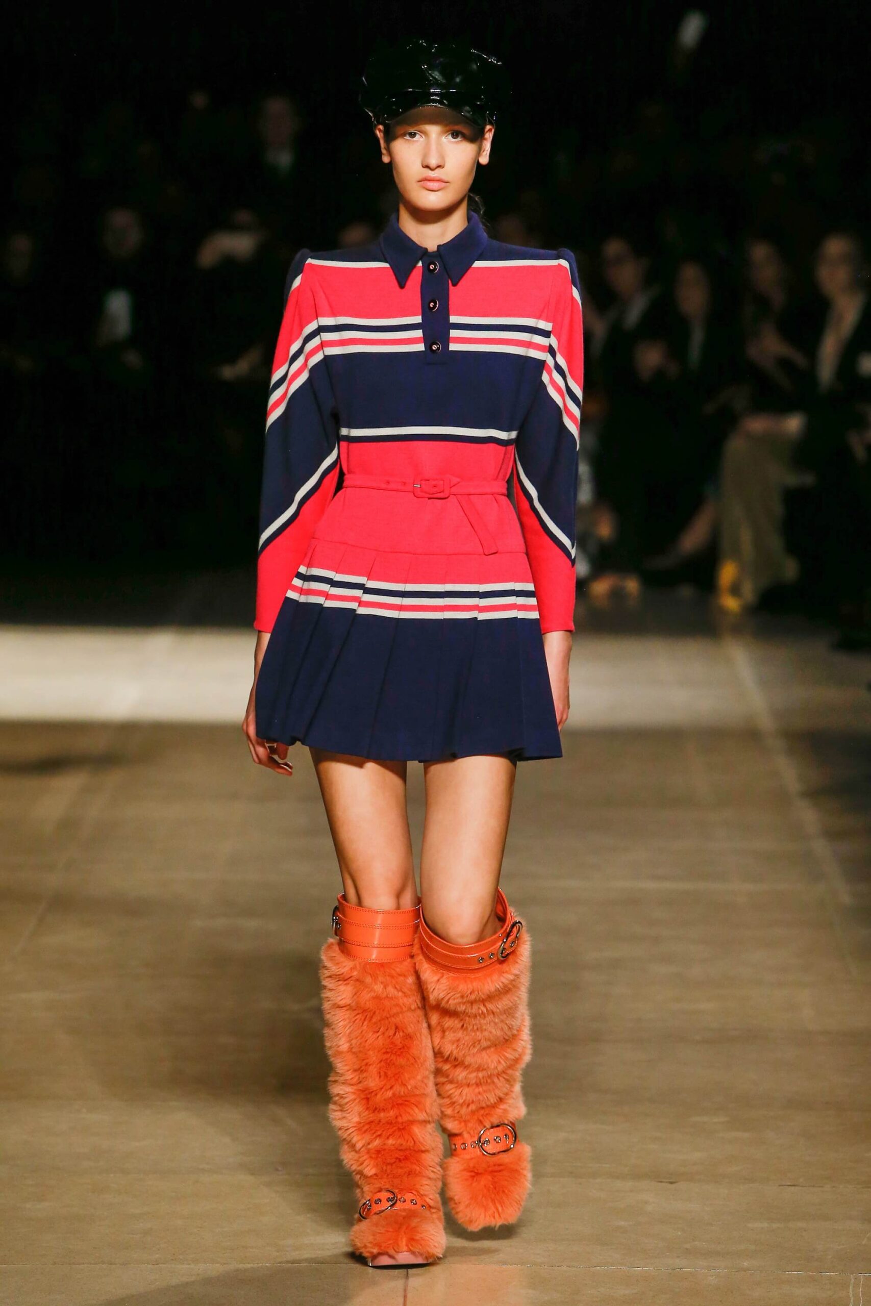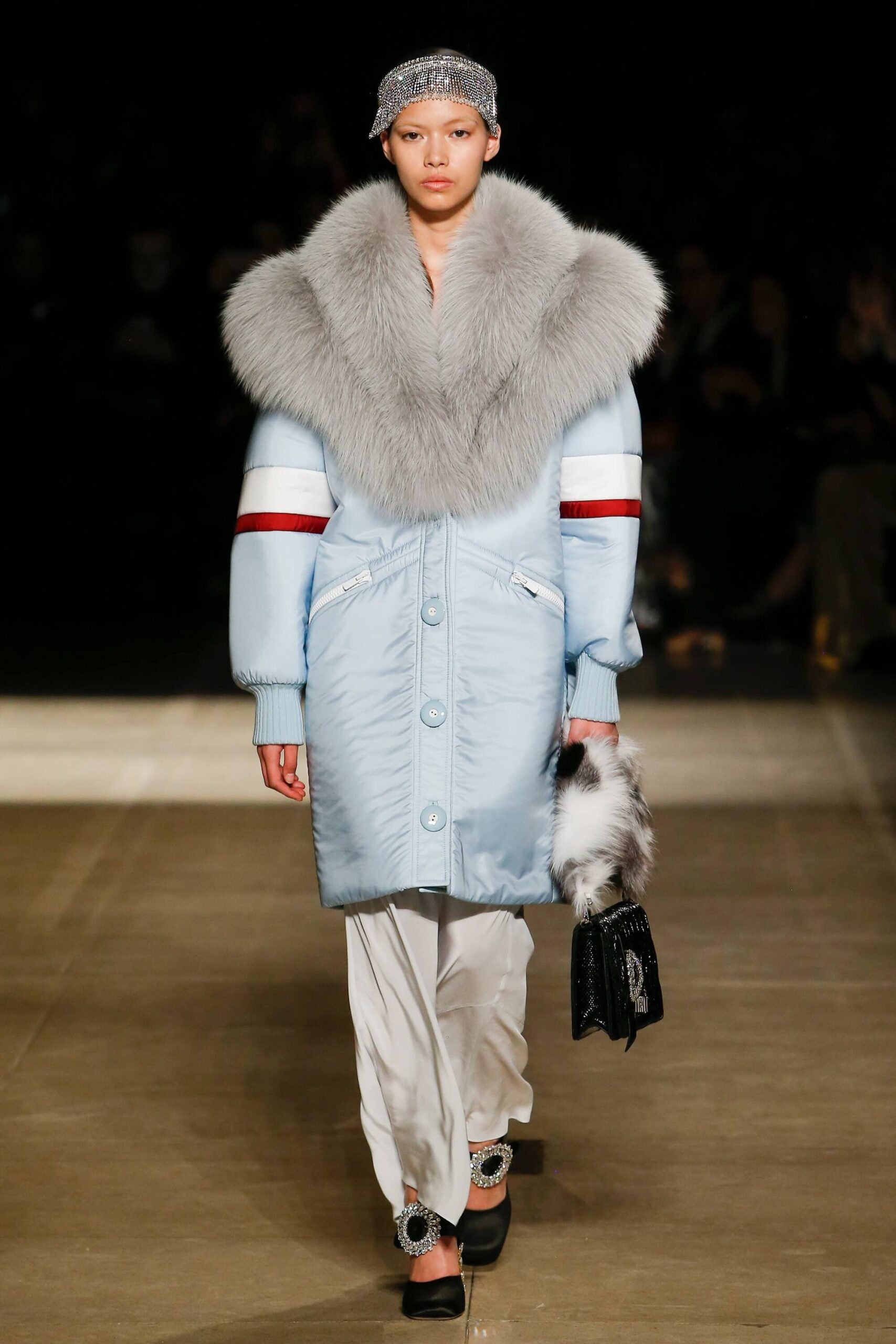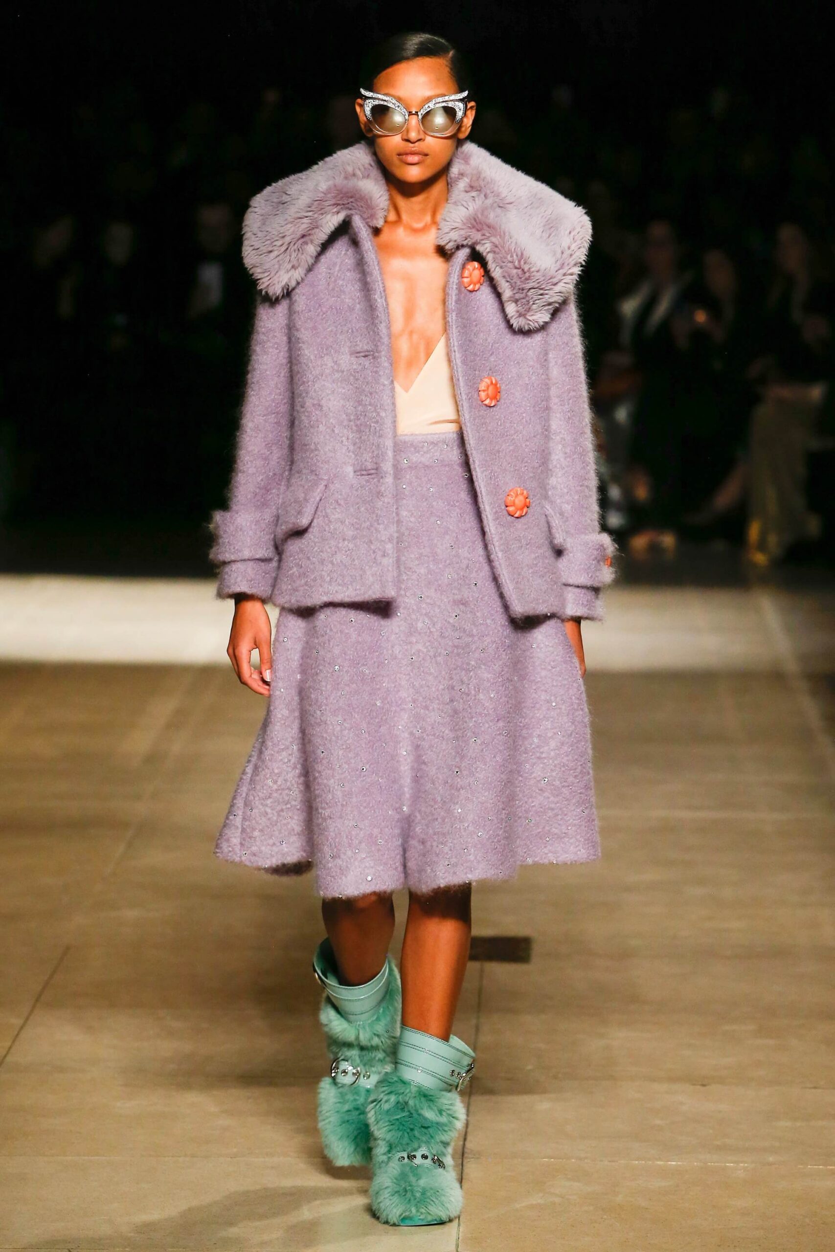 We will begin with the staircase for the very fact that when a staircase is entirely upholstered in purple faux fur, it probably bears mentioning. A bit like a purple muppet, though a quick post-show Google actually revealed there are very few purple muppets, apart from an obscure Japanese Sesame Street character called Teena. Either way, we will be, on return to the homeland, journeying to the nearest Hobbycraft, purchasing several yards of faux fur and a staple gun. Well, if Miuccia says so. There were clothes too, of course – very lovely clothes that continued fur-based theme – glorious shawl collared coats, some entirely furry, other becoming transparent macs beneath the collar, puffy stoles, huge furry gloves – all in this rainbow, Care Bear colour palette of soft pastels or sharper greens, reds and purples. Soundtrack was De la Soul and there was certainly what we’ll call a hip-hop “tinge” to this – these hefty varsity jackets, here in soft pastels, furry baker boy hats or these crystal numbers that sat on the chests of tops, a bit like those you might find on a basketball jersey. You know that bright yellow De La Soul album cover with the hand-drawn flowers on it? Well, the collection kind of riffed on that 90s-meets-60s psychedelia – mostly through the prints – cats, telephones, a sort of surfer-y reworking of the Miu Miu logo. Collection finished, like all good things should, with sequins – specifically, ultra-glam mini-dresses trimmed at the edges with crystals. Miuccia, you know us too well.
