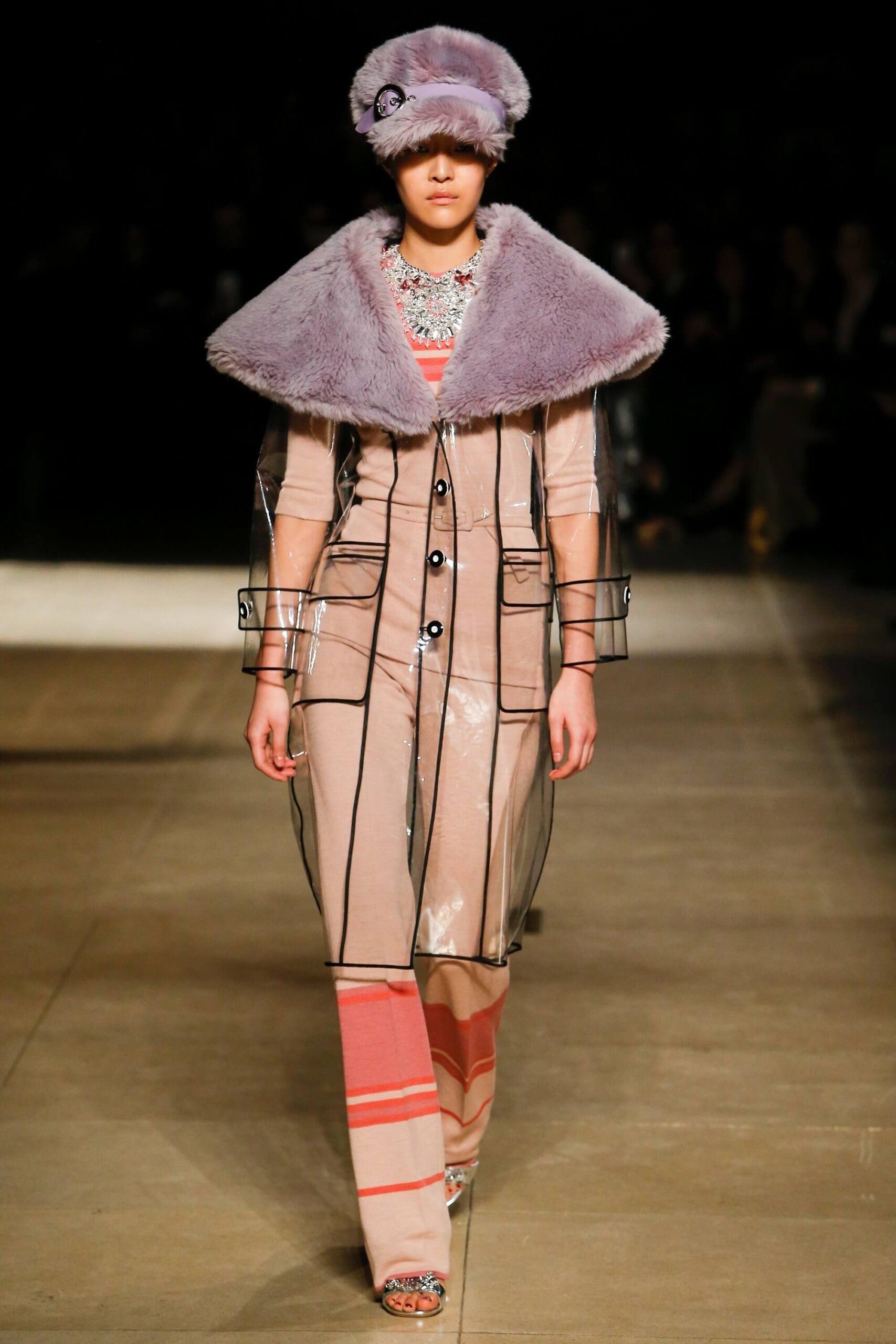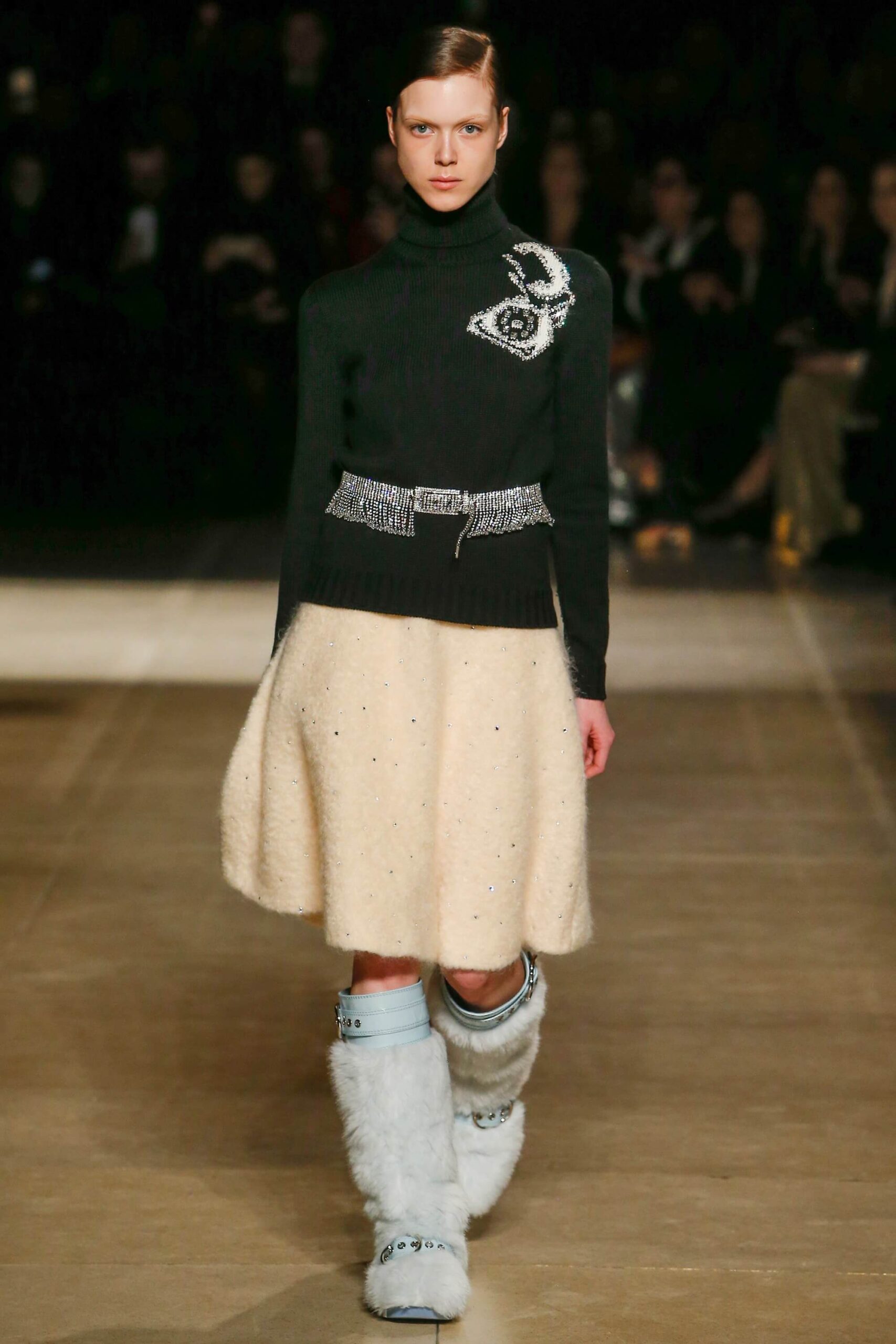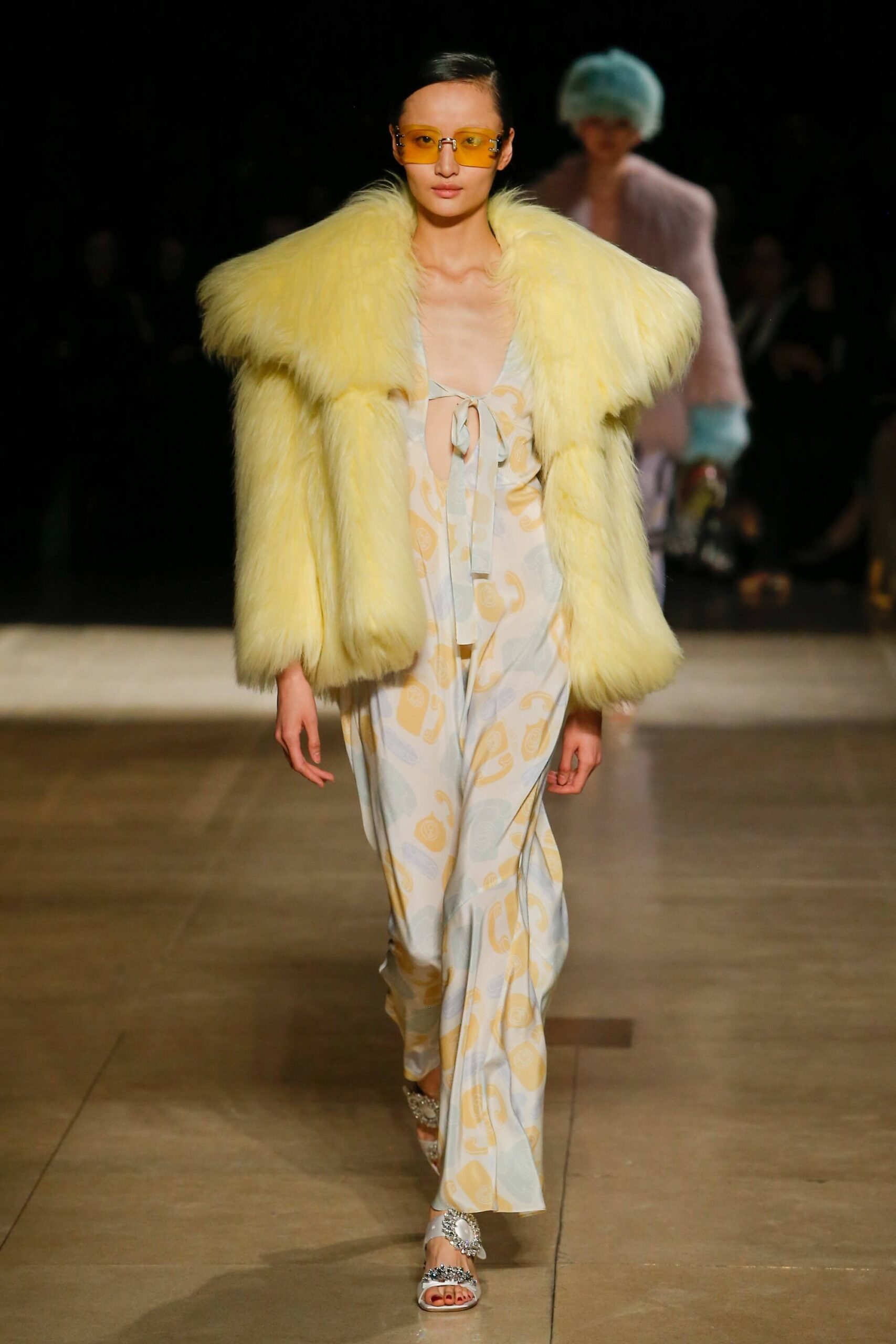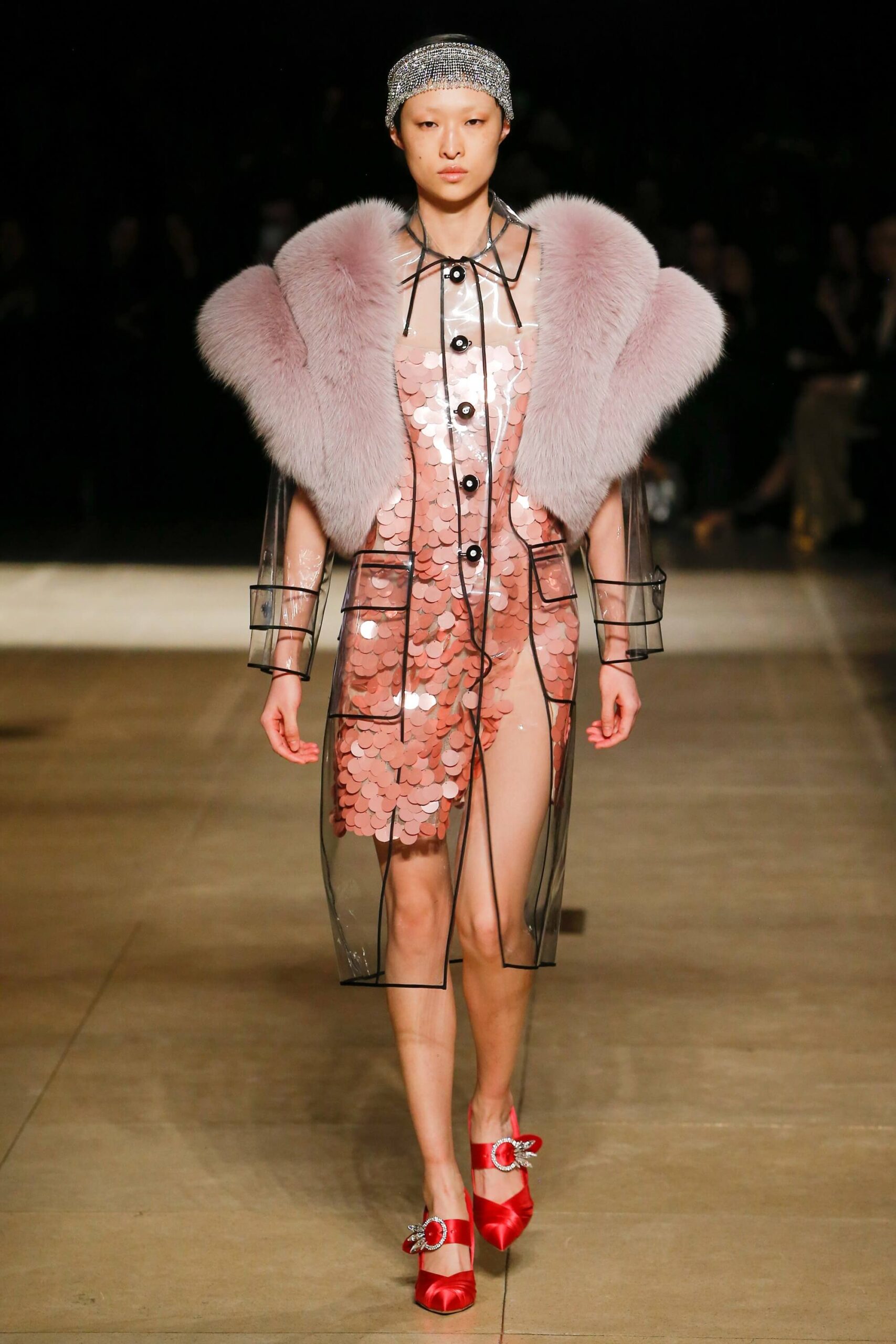 We will begin with the staircase for the very fact that when a staircase is entirely upholstered in purple faux fur, it probably bears mentioning. A bit like a purple muppet, though a quick post-show Google actually revealed there are very few purple muppets, apart from an obscure Japanese Sesame Street character called Teena. Either way, we will be, on return to the homeland, journeying to the nearest Hobbycraft, purchasing several yards of faux fur and a staple gun. Well, if Miuccia says so. There were clothes too, of course – very lovely clothes that continued fur-based theme – glorious shawl collared coats, some entirely furry, other becoming transparent macs beneath the collar, puffy stoles, huge furry gloves – all in this rainbow, Care Bear colour palette of soft pastels or sharper greens, reds and purples. Soundtrack was De la Soul and there was certainly what we’ll call a hip-hop “tinge” to this – these hefty varsity jackets, here in soft pastels, furry baker boy hats or these crystal numbers that sat on the chests of tops, a bit like those you might find on a basketball jersey. You know that bright yellow De La Soul album cover with the hand-drawn flowers on it? Well, the collection kind of riffed on that 90s-meets-60s psychedelia – mostly through the prints – cats, telephones, a sort of surfer-y reworking of the Miu Miu logo. Collection finished, like all good things should, with sequins – specifically, ultra-glam mini-dresses trimmed at the edges with crystals. Miuccia, you know us too well.