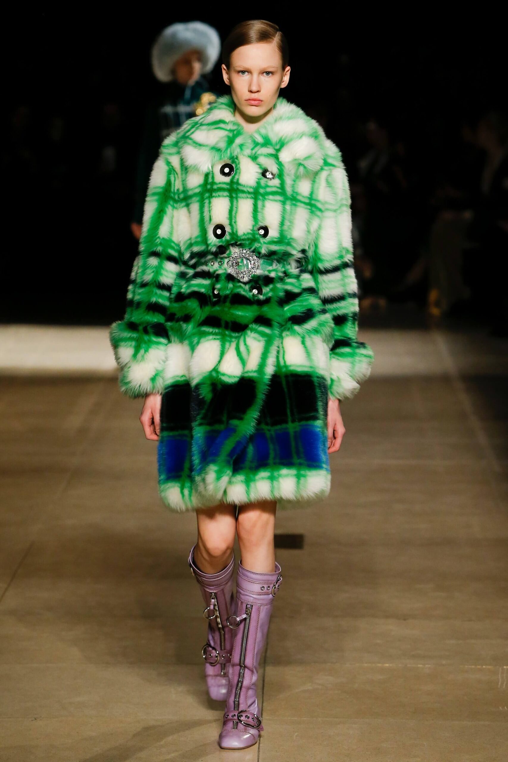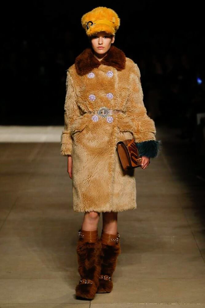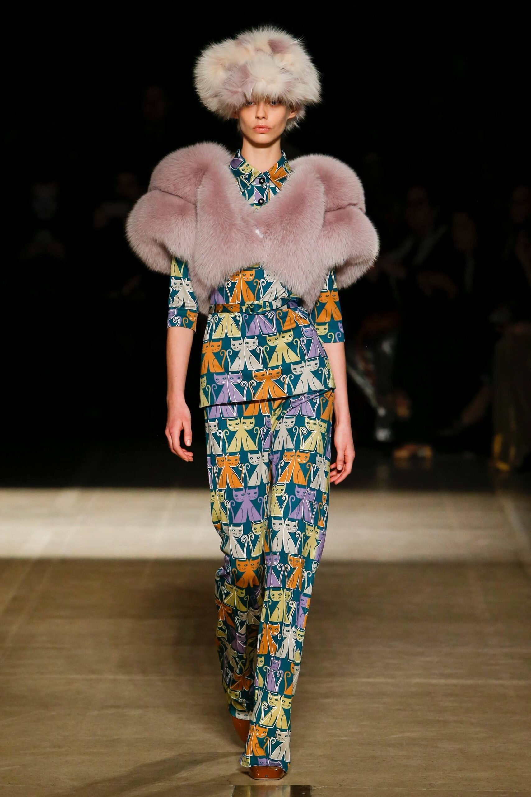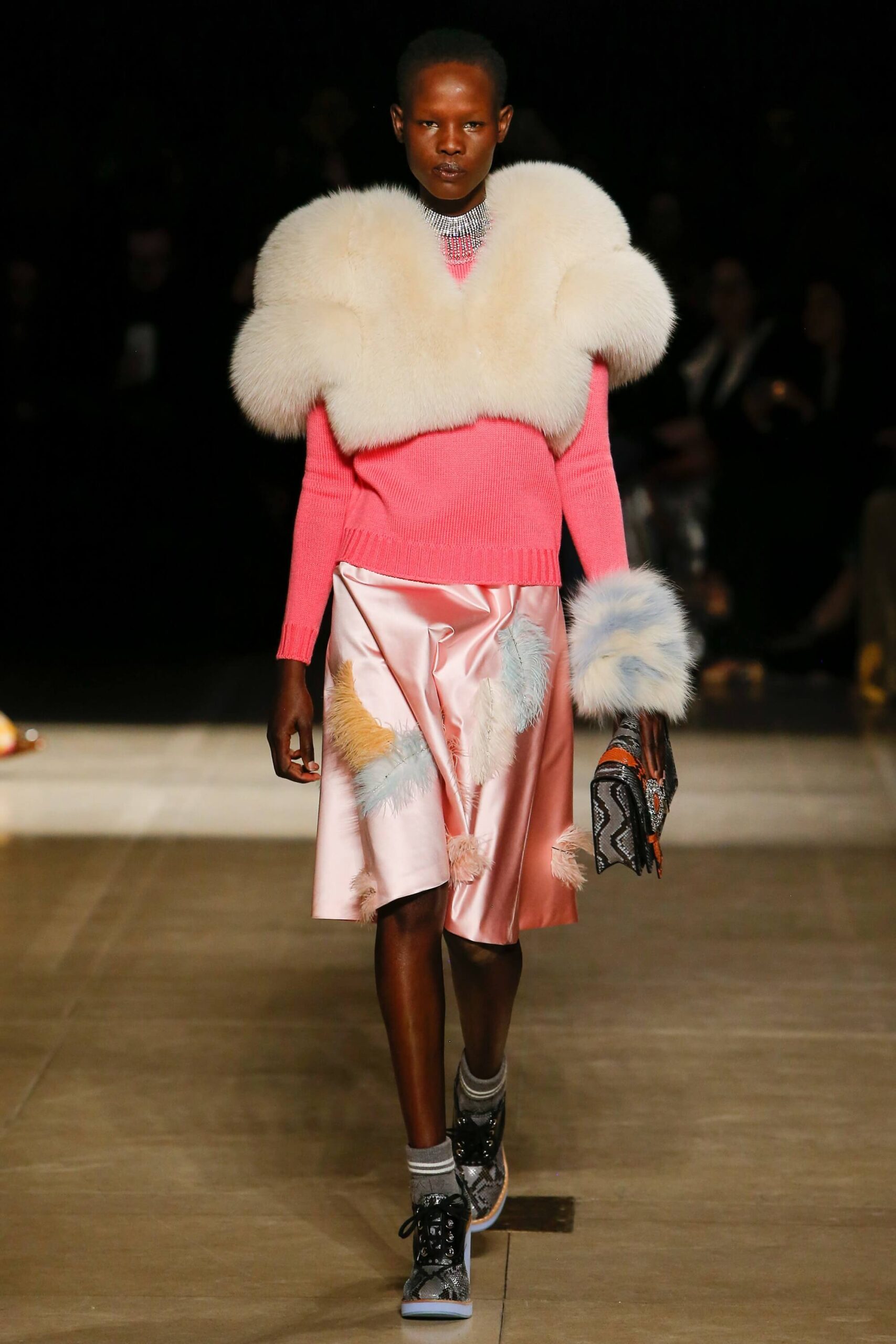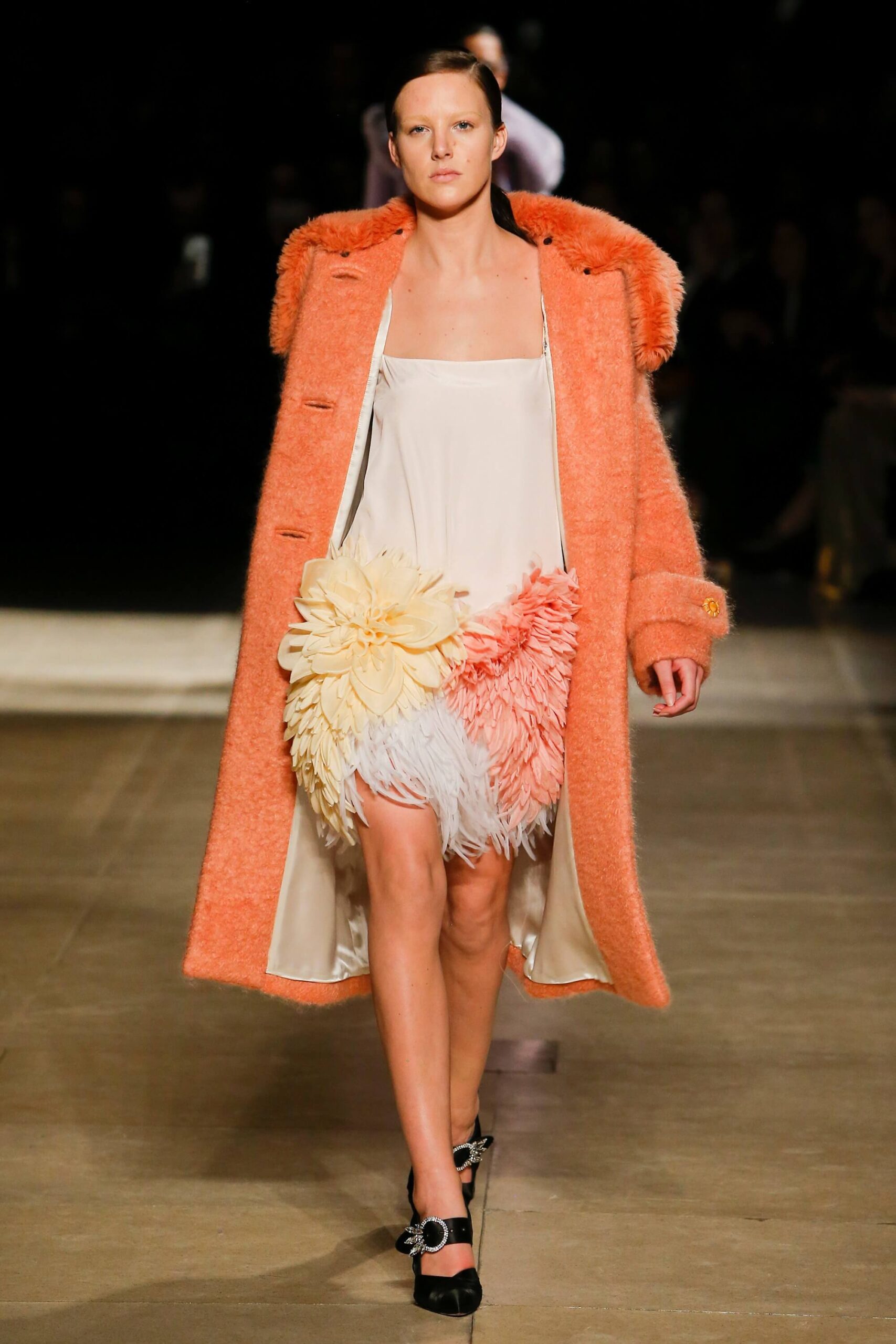 We will begin with the staircase for the very fact that when a staircase is entirely upholstered in purple faux fur, it probably bears mentioning. A bit like a purple muppet, though a quick post-show Google actually revealed there are very few purple muppets, apart from an obscure Japanese Sesame Street character called Teena. Either way, we will be, on return to the homeland, journeying to the nearest Hobbycraft, purchasing several yards of faux fur and a staple gun. Well, if Miuccia says so. There were clothes too, of course – very lovely clothes that continued fur-based theme – glorious shawl collared coats, some entirely furry, other becoming transparent macs beneath the collar, puffy stoles, huge furry gloves – all in this rainbow, Care Bear colour palette of soft pastels or sharper greens, reds and purples. Soundtrack was De la Soul and there was certainly what we’ll call a hip-hop “tinge” to this – these hefty varsity jackets, here in soft pastels, furry baker boy hats or these crystal numbers that sat on the chests of tops, a bit like those you might find on a basketball jersey. You know that bright yellow De La Soul album cover with the hand-drawn flowers on it? Well, the collection kind of riffed on that 90s-meets-60s psychedelia – mostly through the prints – cats, telephones, a sort of surfer-y reworking of the Miu Miu logo. Collection finished, like all good things should, with sequins – specifically, ultra-glam mini-dresses trimmed at the edges with crystals. Miuccia, you know us too well.