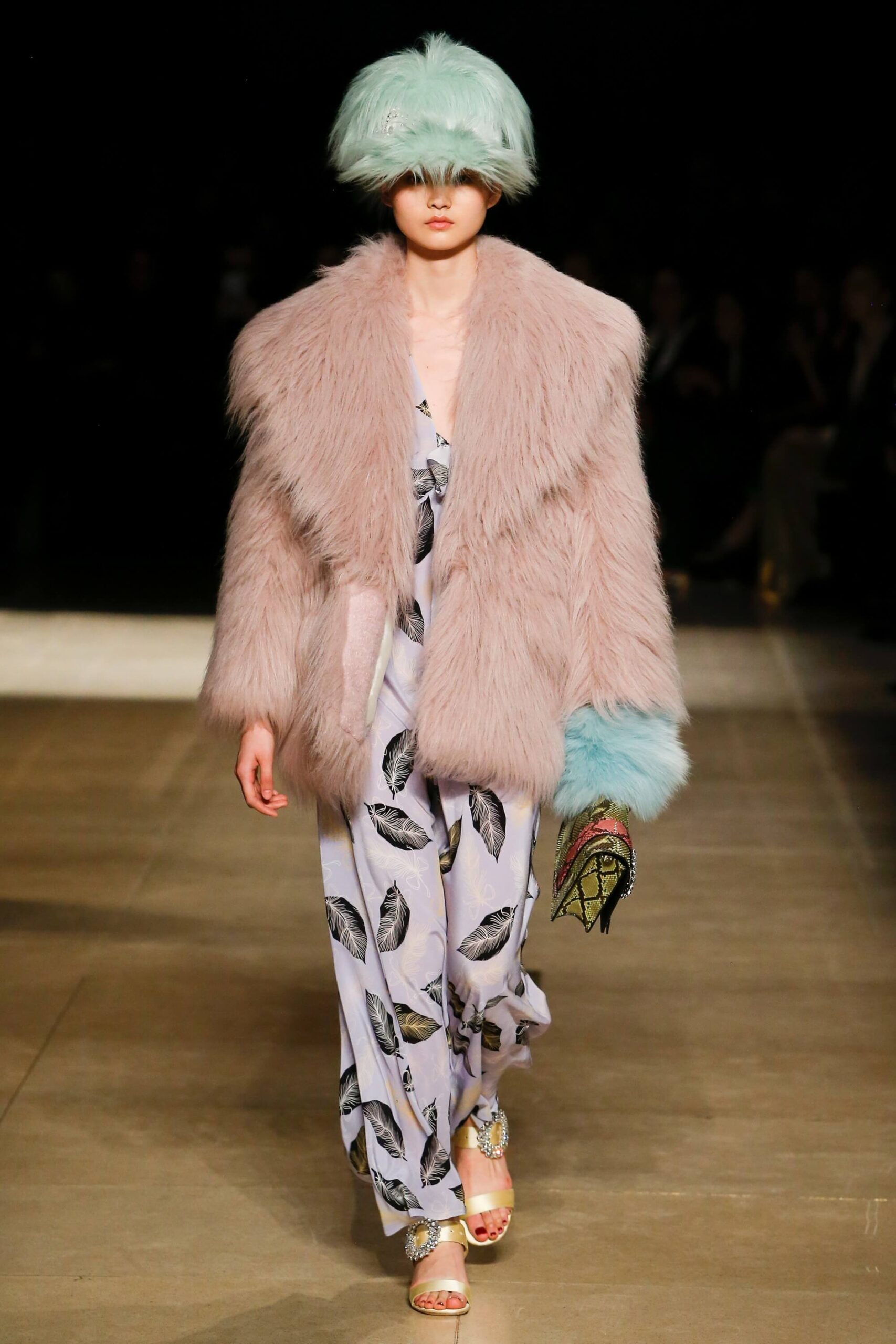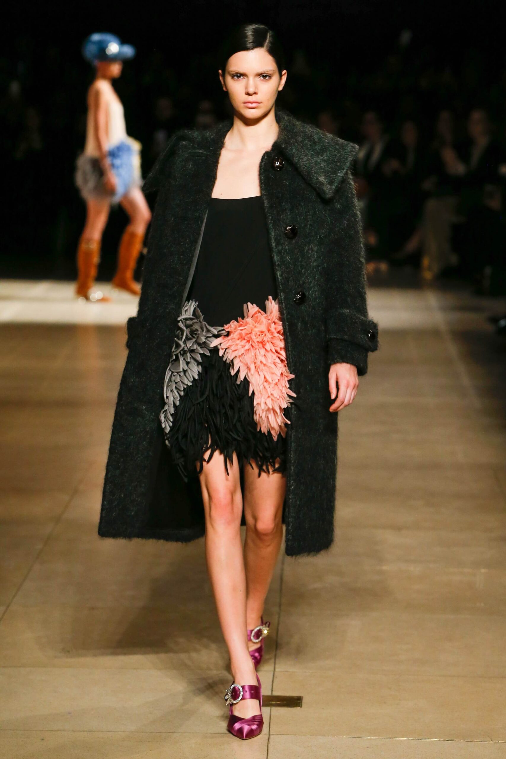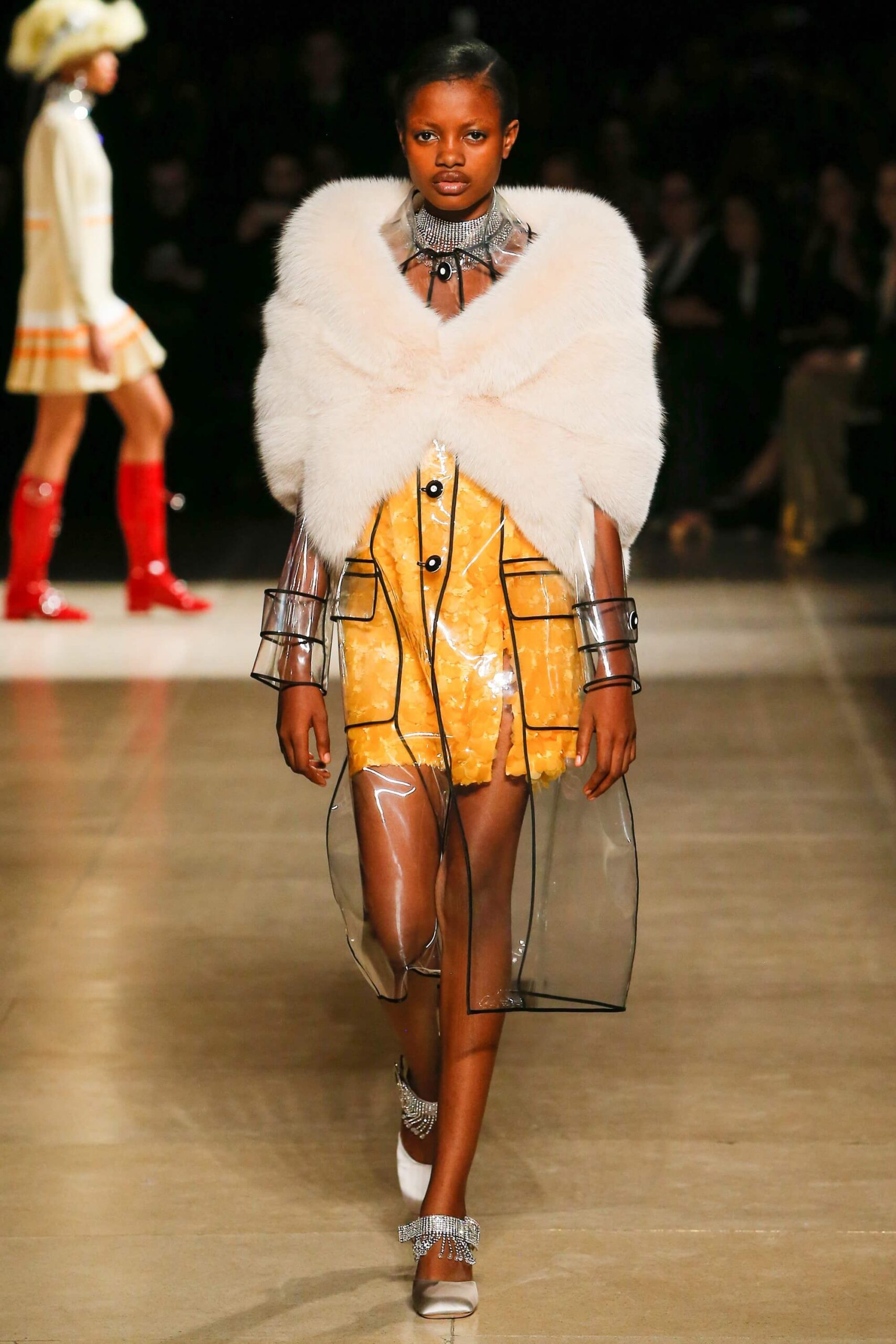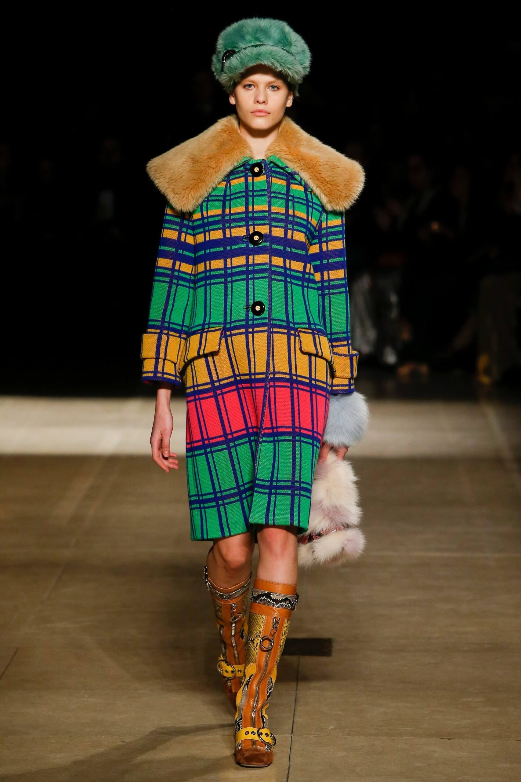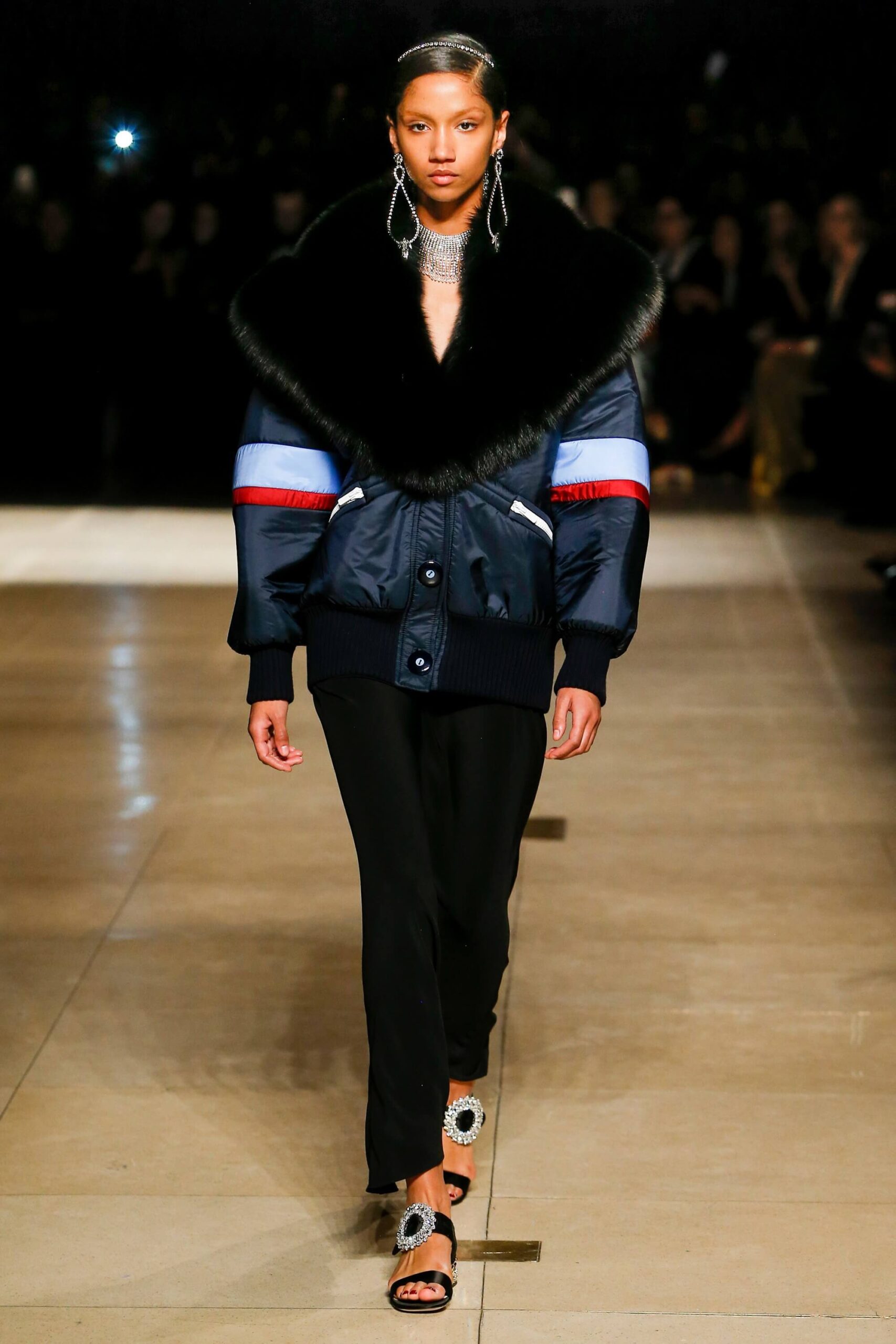 We will begin with the staircase for the very fact that when a staircase is entirely upholstered in purple faux fur, it probably bears mentioning. A bit like a purple muppet, though a quick post-show Google actually revealed there are very few purple muppets, apart from an obscure Japanese Sesame Street character called Teena. Either way, we will be, on return to the homeland, journeying to the nearest Hobbycraft, purchasing several yards of faux fur and a staple gun. Well, if Miuccia says so. There were clothes too, of course – very lovely clothes that continued fur-based theme – glorious shawl collared coats, some entirely furry, other becoming transparent macs beneath the collar, puffy stoles, huge furry gloves – all in this rainbow, Care Bear colour palette of soft pastels or sharper greens, reds and purples. Soundtrack was De la Soul and there was certainly what we’ll call a hip-hop “tinge” to this – these hefty varsity jackets, here in soft pastels, furry baker boy hats or these crystal numbers that sat on the chests of tops, a bit like those you might find on a basketball jersey. You know that bright yellow De La Soul album cover with the hand-drawn flowers on it? Well, the collection kind of riffed on that 90s-meets-60s psychedelia – mostly through the prints – cats, telephones, a sort of surfer-y reworking of the Miu Miu logo. Collection finished, like all good things should, with sequins – specifically, ultra-glam mini-dresses trimmed at the edges with crystals. Miuccia, you know us too well.