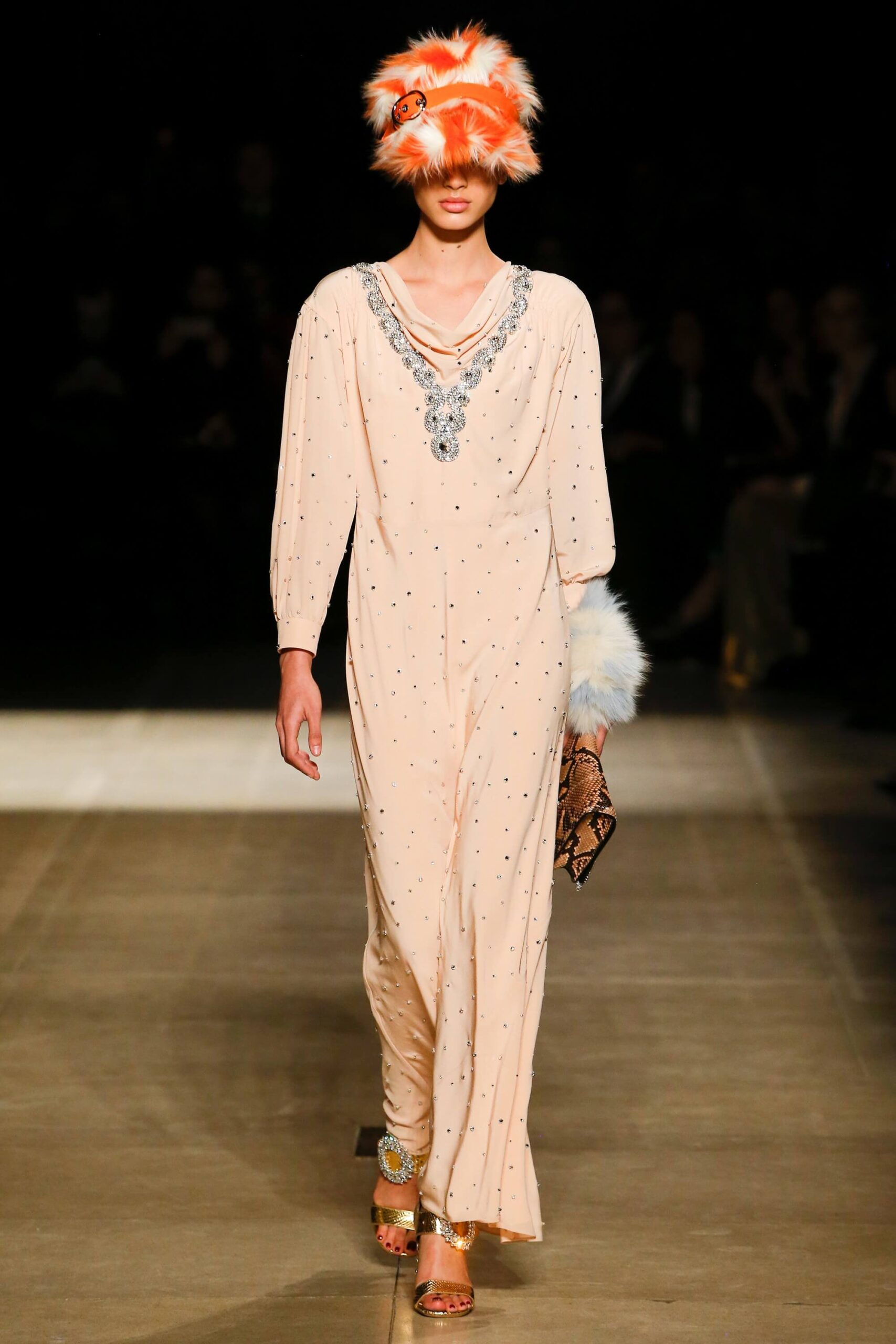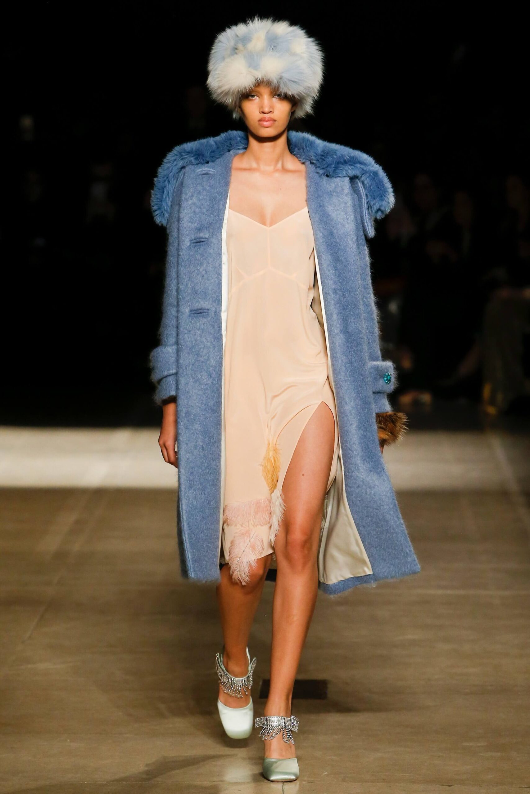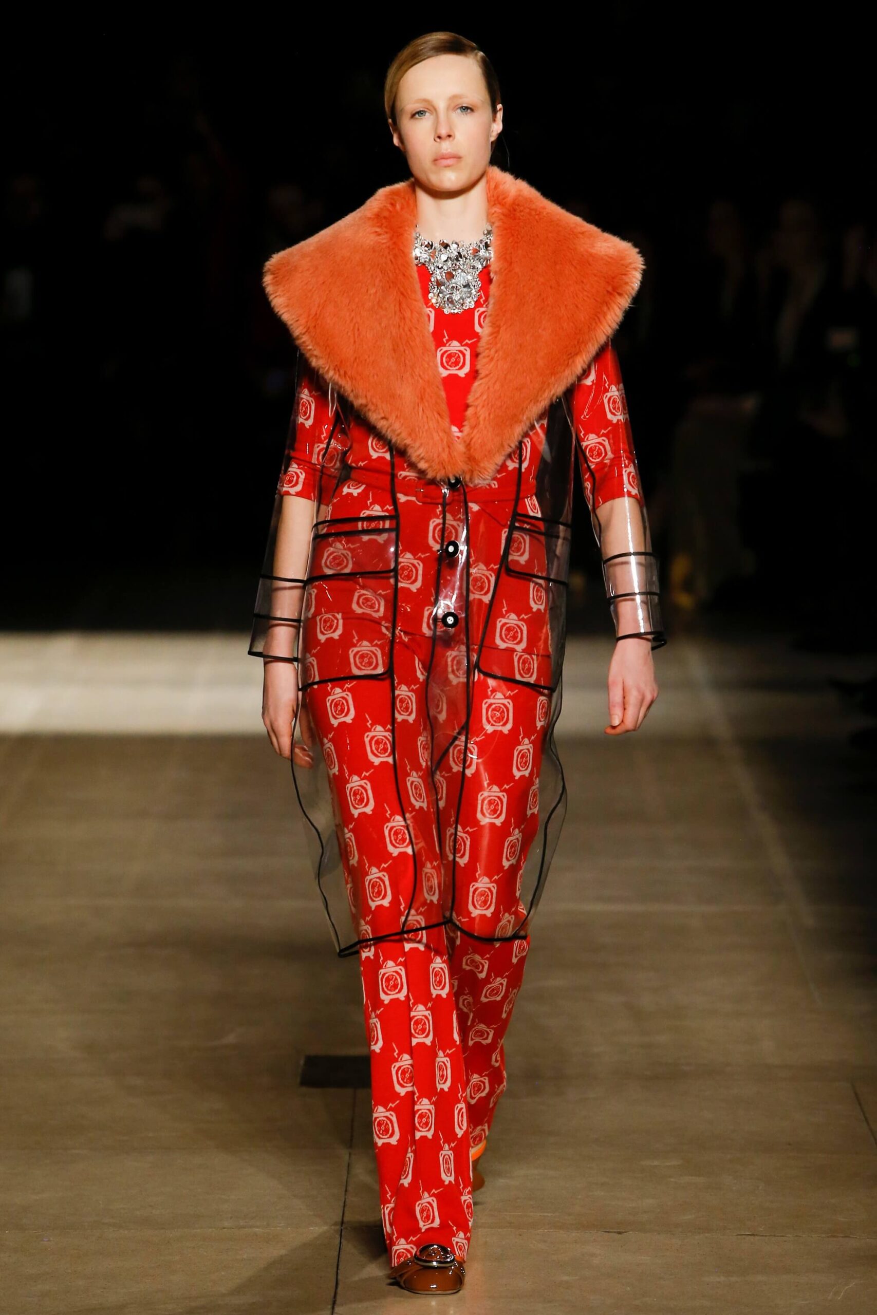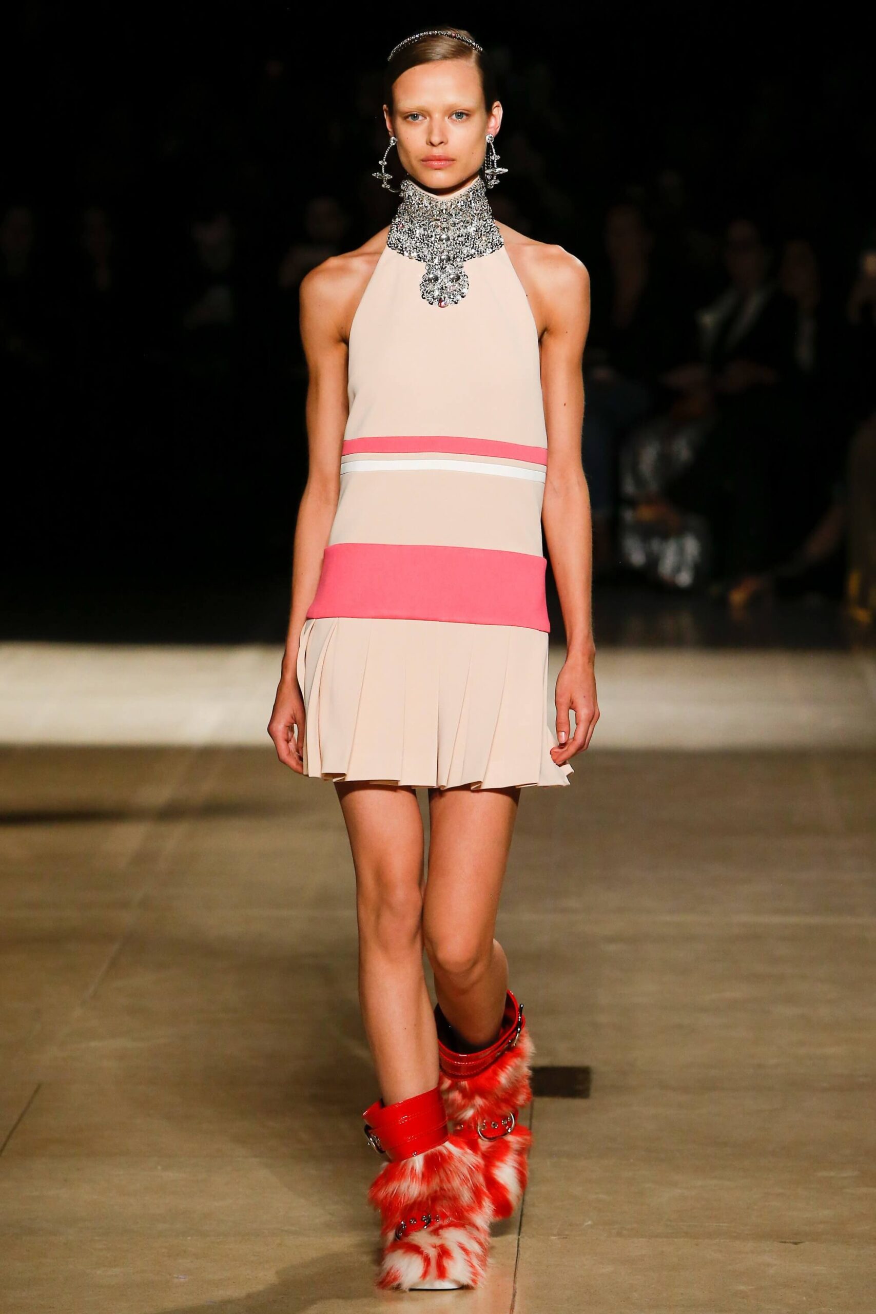 We will begin with the staircase for the very fact that when a staircase is entirely upholstered in purple faux fur, it probably bears mentioning. A bit like a purple muppet, though a quick post-show Google actually revealed there are very few purple muppets, apart from an obscure Japanese Sesame Street character called Teena. Either way, we will be, on return to the homeland, journeying to the nearest Hobbycraft, purchasing several yards of faux fur and a staple gun. Well, if Miuccia says so. There were clothes too, of course – very lovely clothes that continued fur-based theme – glorious shawl collared coats, some entirely furry, other becoming transparent macs beneath the collar, puffy stoles, huge furry gloves – all in this rainbow, Care Bear colour palette of soft pastels or sharper greens, reds and purples. Soundtrack was De la Soul and there was certainly what we’ll call a hip-hop “tinge” to this – these hefty varsity jackets, here in soft pastels, furry baker boy hats or these crystal numbers that sat on the chests of tops, a bit like those you might find on a basketball jersey. You know that bright yellow De La Soul album cover with the hand-drawn flowers on it? Well, the collection kind of riffed on that 90s-meets-60s psychedelia – mostly through the prints – cats, telephones, a sort of surfer-y reworking of the Miu Miu logo. Collection finished, like all good things should, with sequins – specifically, ultra-glam mini-dresses trimmed at the edges with crystals. Miuccia, you know us too well.