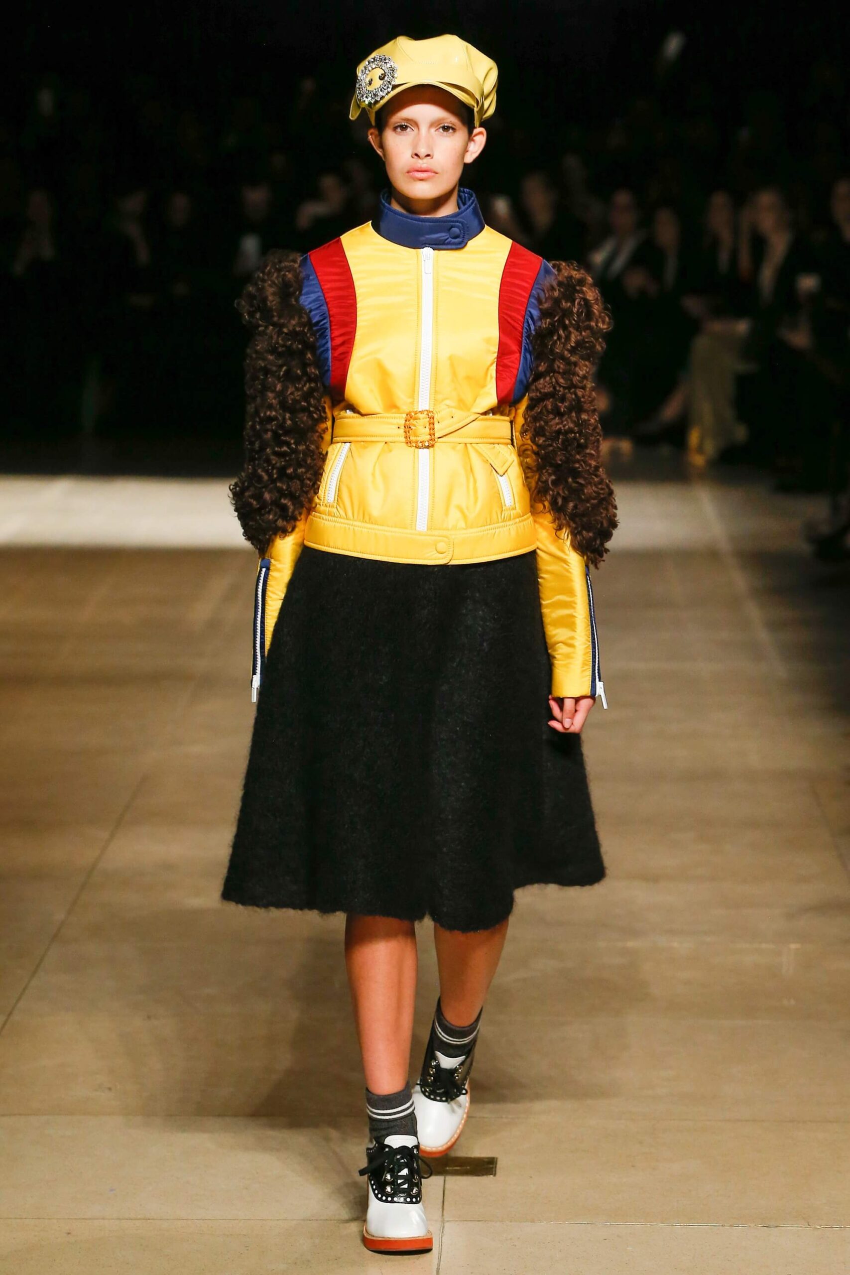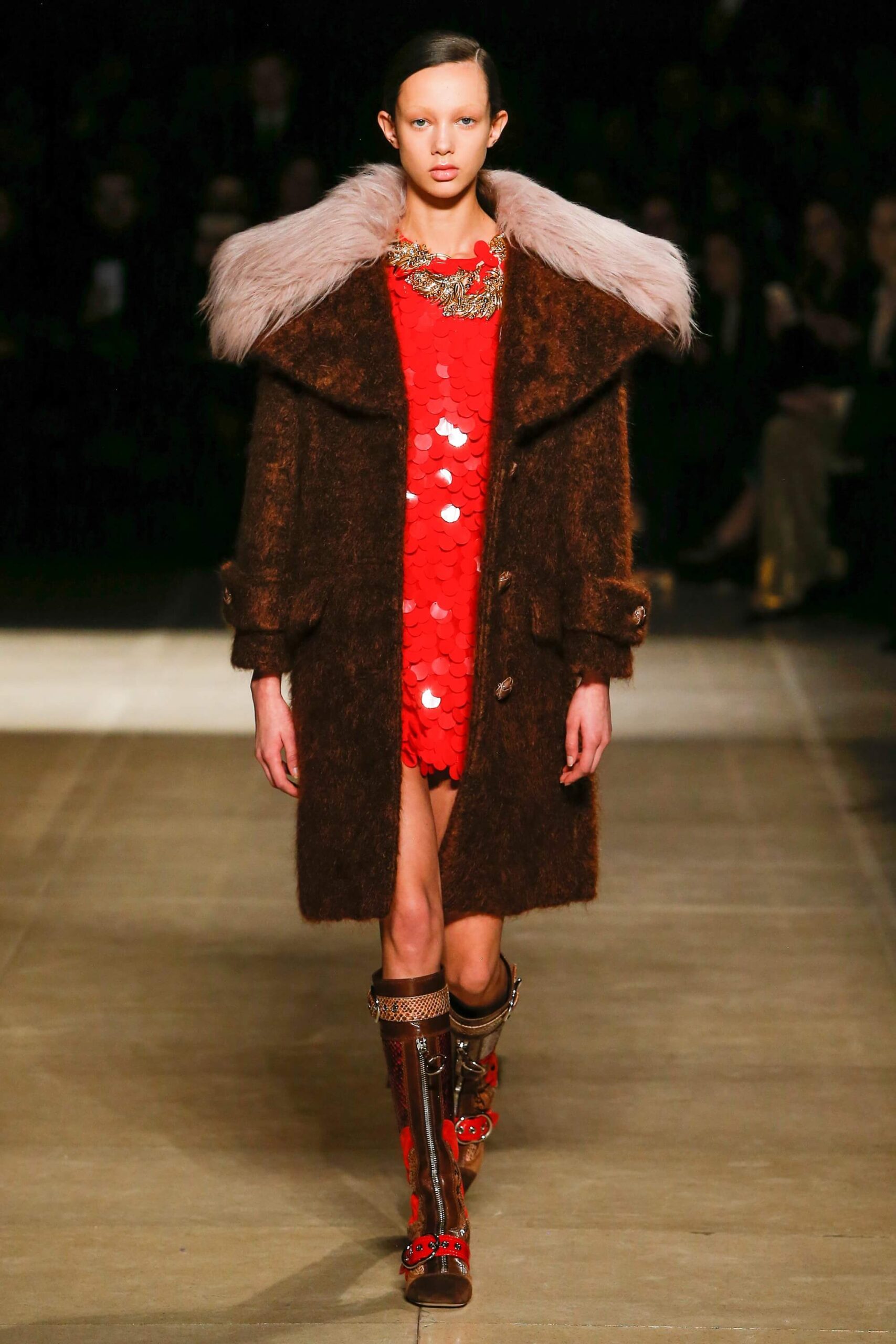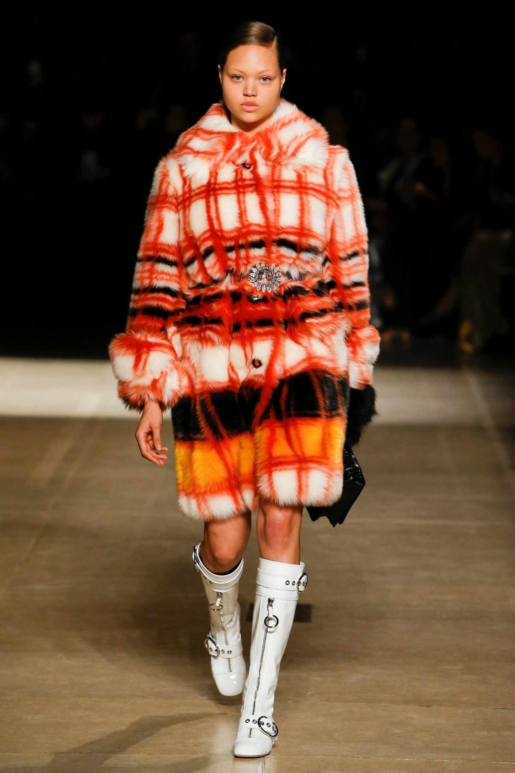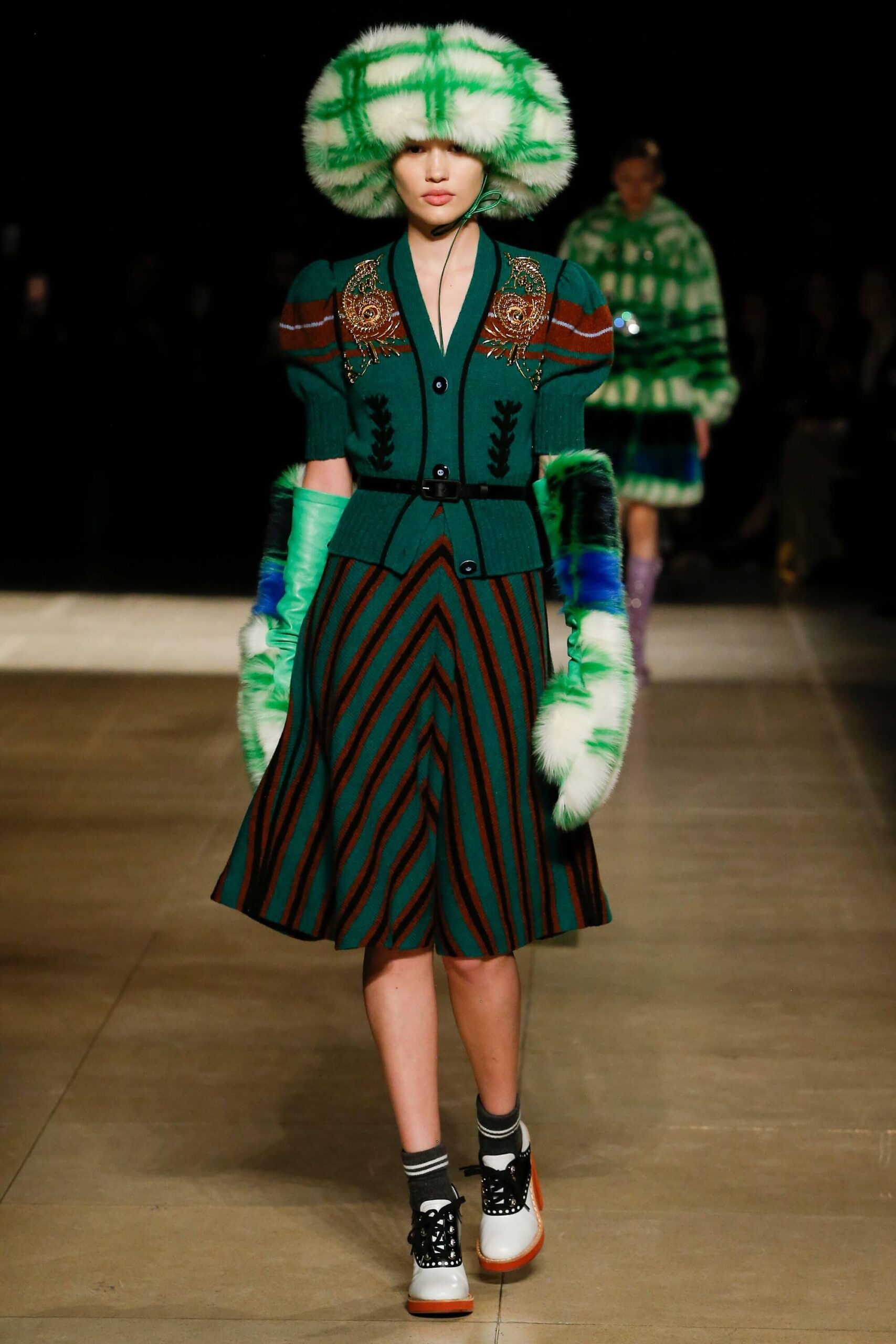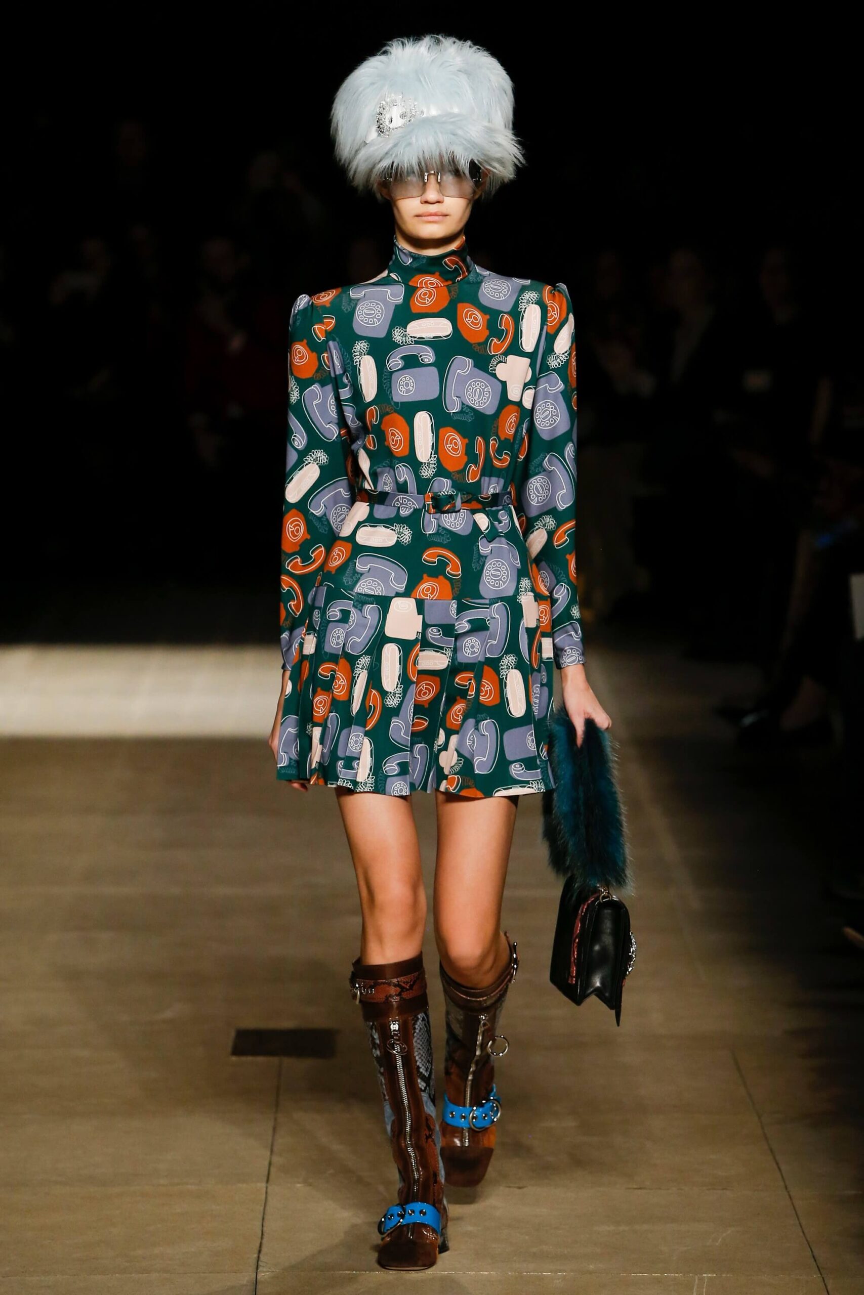 We will begin with the staircase for the very fact that when a staircase is entirely upholstered in purple faux fur, it probably bears mentioning. A bit like a purple muppet, though a quick post-show Google actually revealed there are very few purple muppets, apart from an obscure Japanese Sesame Street character called Teena. Either way, we will be, on return to the homeland, journeying to the nearest Hobbycraft, purchasing several yards of faux fur and a staple gun. Well, if Miuccia says so. There were clothes too, of course – very lovely clothes that continued fur-based theme – glorious shawl collared coats, some entirely furry, other becoming transparent macs beneath the collar, puffy stoles, huge furry gloves – all in this rainbow, Care Bear colour palette of soft pastels or sharper greens, reds and purples. Soundtrack was De la Soul and there was certainly what we’ll call a hip-hop “tinge” to this – these hefty varsity jackets, here in soft pastels, furry baker boy hats or these crystal numbers that sat on the chests of tops, a bit like those you might find on a basketball jersey. You know that bright yellow De La Soul album cover with the hand-drawn flowers on it? Well, the collection kind of riffed on that 90s-meets-60s psychedelia – mostly through the prints – cats, telephones, a sort of surfer-y reworking of the Miu Miu logo. Collection finished, like all good things should, with sequins – specifically, ultra-glam mini-dresses trimmed at the edges with crystals. Miuccia, you know us too well.