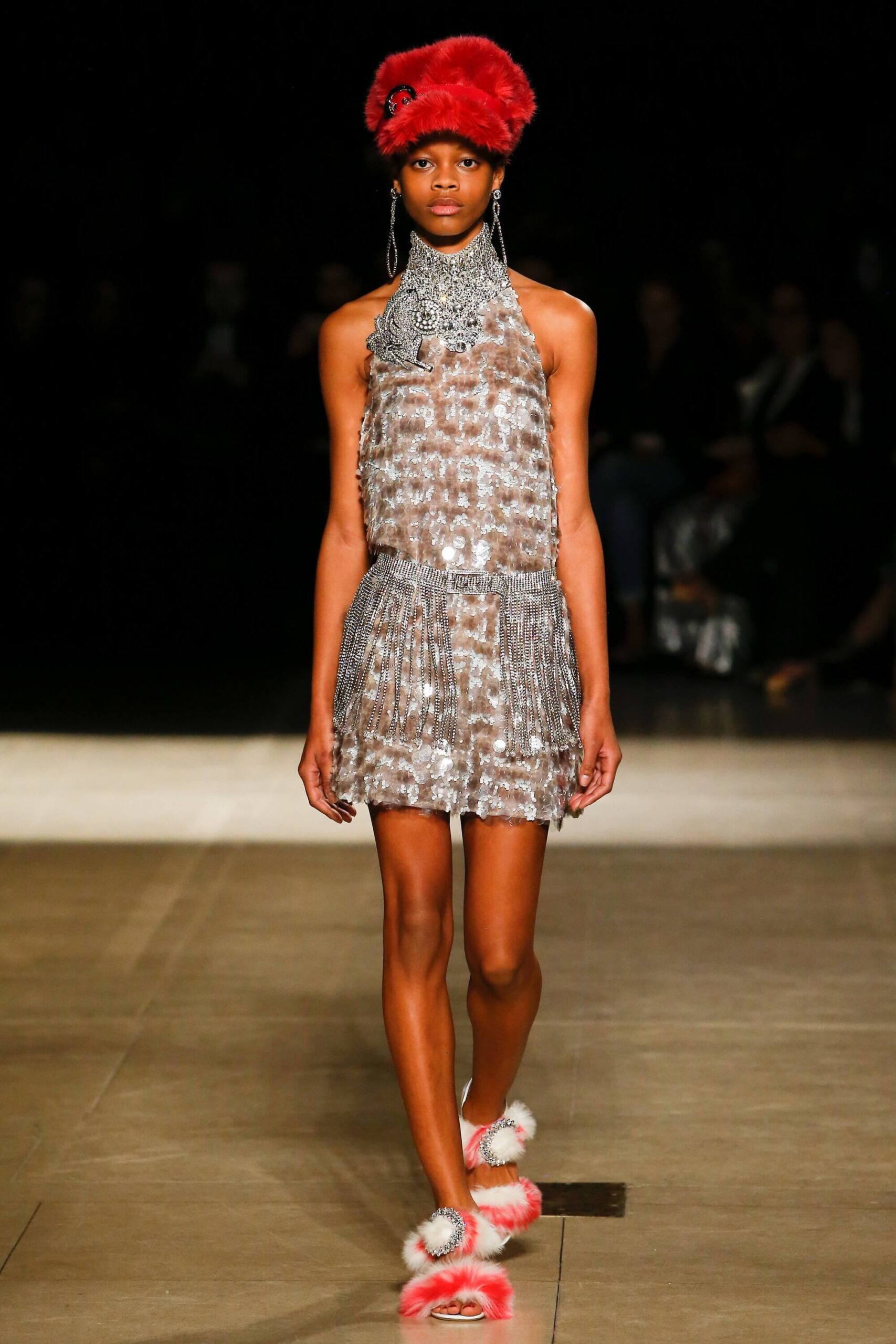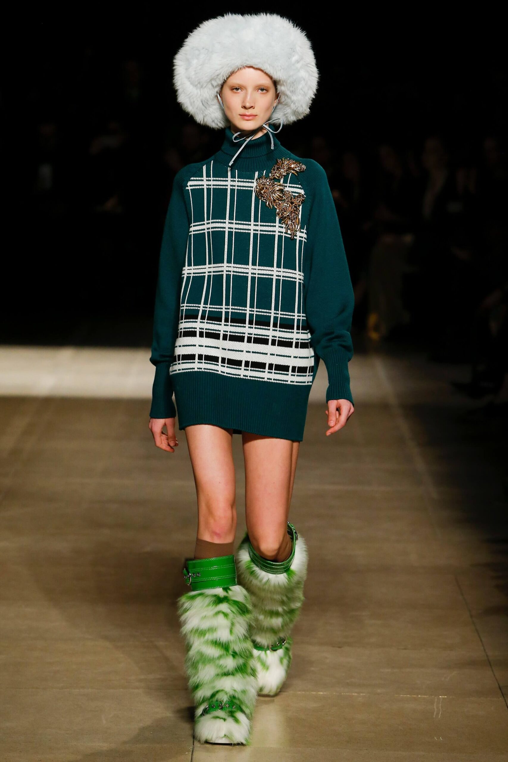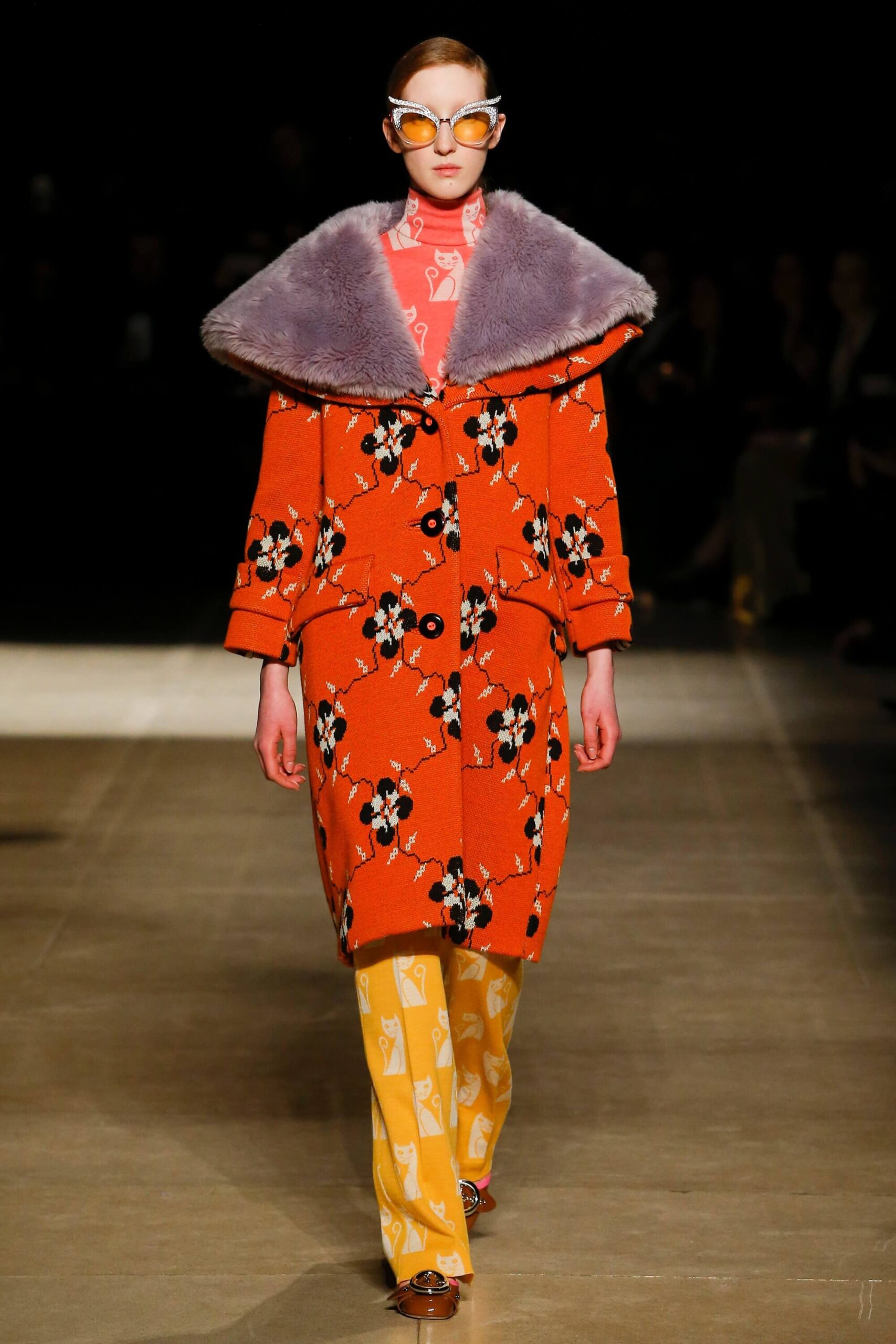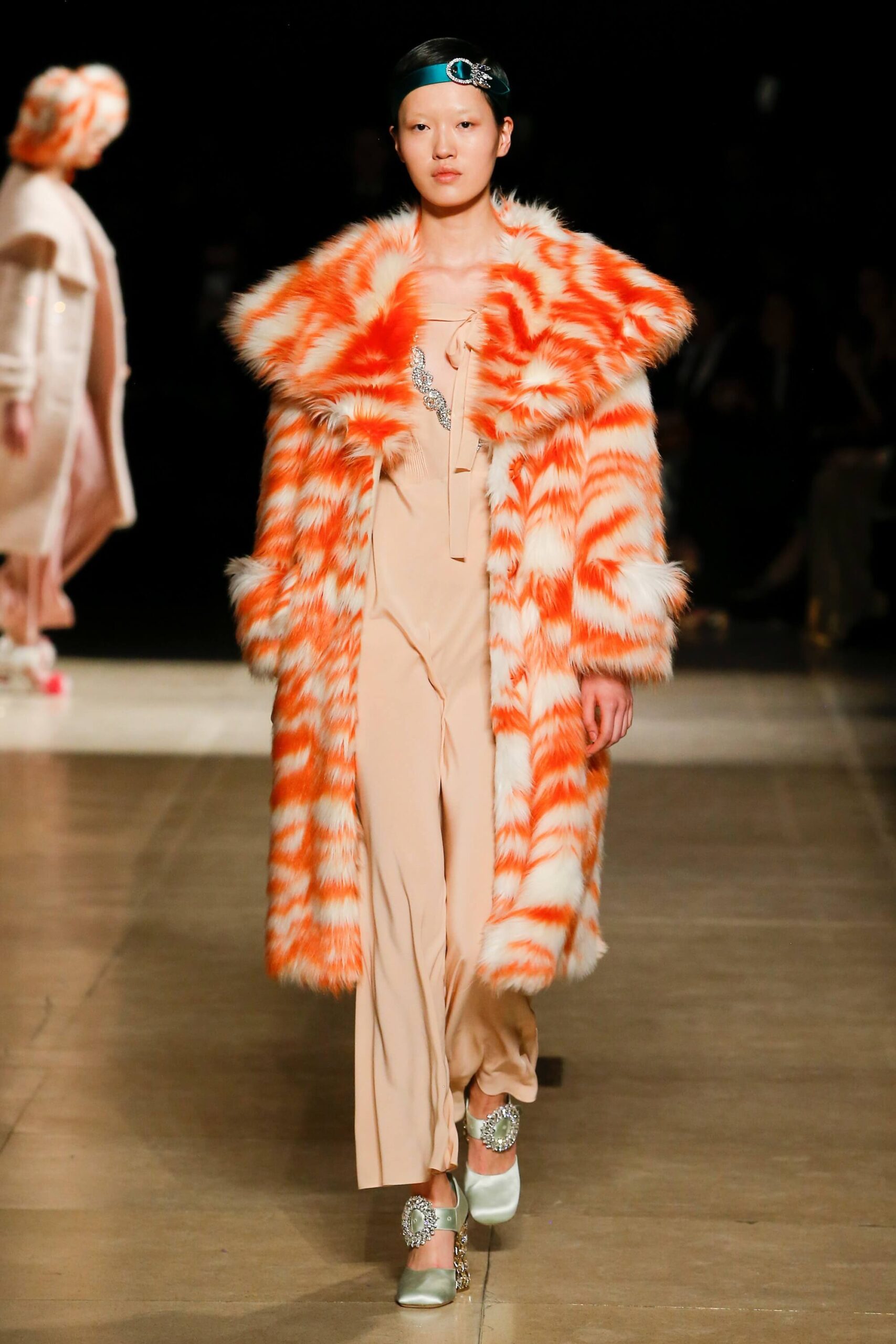 We will begin with the staircase for the very fact that when a staircase is entirely upholstered in purple faux fur, it probably bears mentioning. A bit like a purple muppet, though a quick post-show Google actually revealed there are very few purple muppets, apart from an obscure Japanese Sesame Street character called Teena. Either way, we will be, on return to the homeland, journeying to the nearest Hobbycraft, purchasing several yards of faux fur and a staple gun. Well, if Miuccia says so. There were clothes too, of course – very lovely clothes that continued fur-based theme – glorious shawl collared coats, some entirely furry, other becoming transparent macs beneath the collar, puffy stoles, huge furry gloves – all in this rainbow, Care Bear colour palette of soft pastels or sharper greens, reds and purples. Soundtrack was De la Soul and there was certainly what we’ll call a hip-hop “tinge” to this – these hefty varsity jackets, here in soft pastels, furry baker boy hats or these crystal numbers that sat on the chests of tops, a bit like those you might find on a basketball jersey. You know that bright yellow De La Soul album cover with the hand-drawn flowers on it? Well, the collection kind of riffed on that 90s-meets-60s psychedelia – mostly through the prints – cats, telephones, a sort of surfer-y reworking of the Miu Miu logo. Collection finished, like all good things should, with sequins – specifically, ultra-glam mini-dresses trimmed at the edges with crystals. Miuccia, you know us too well.