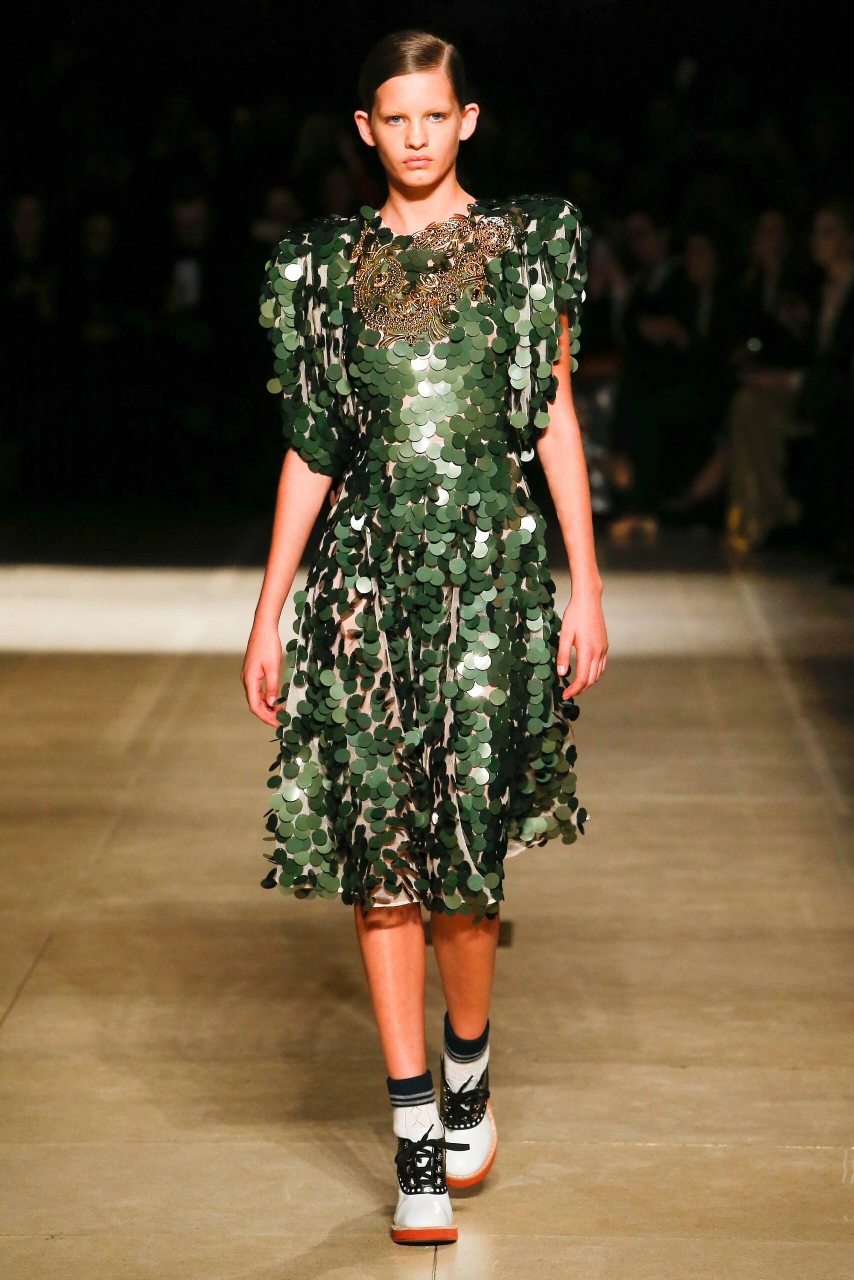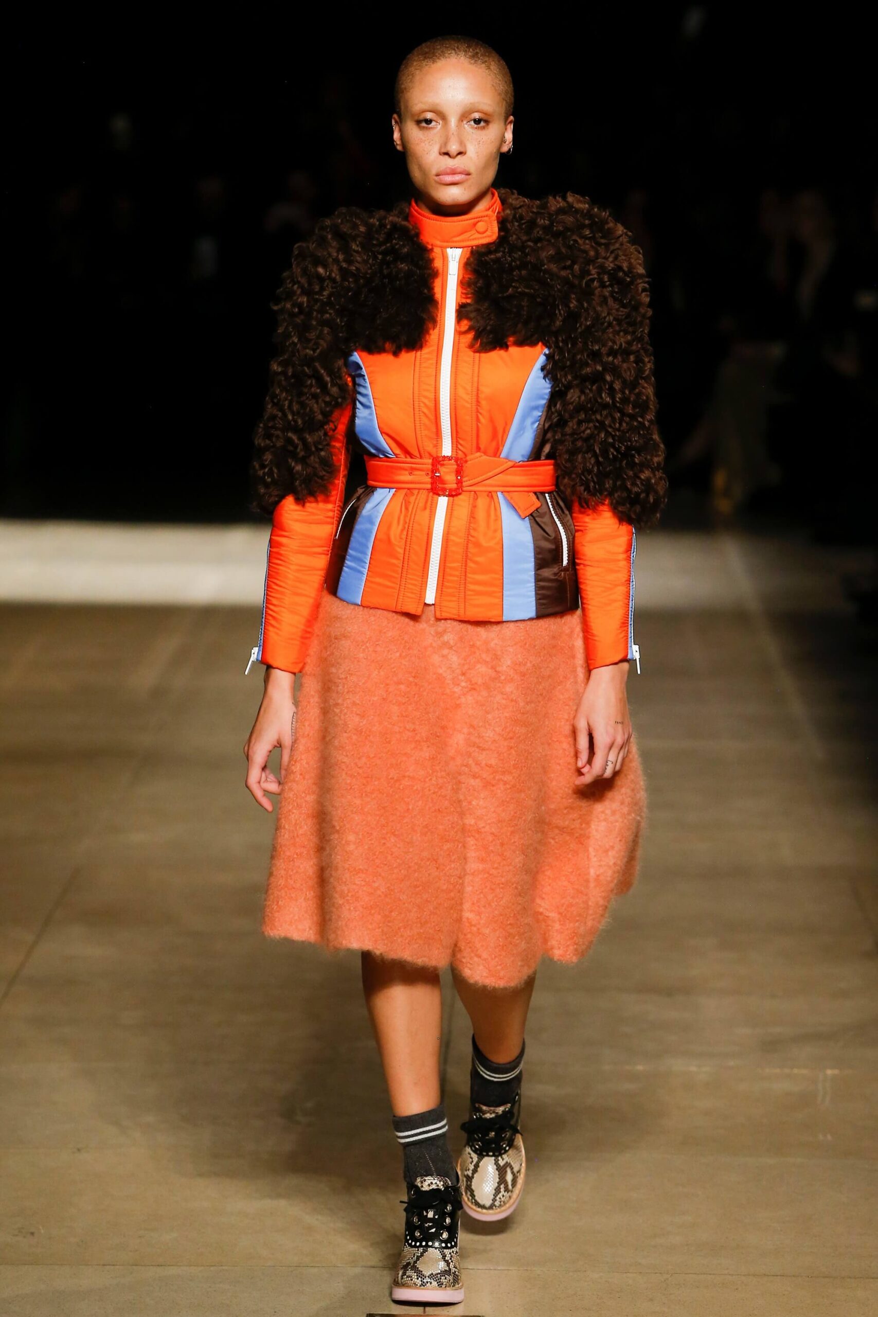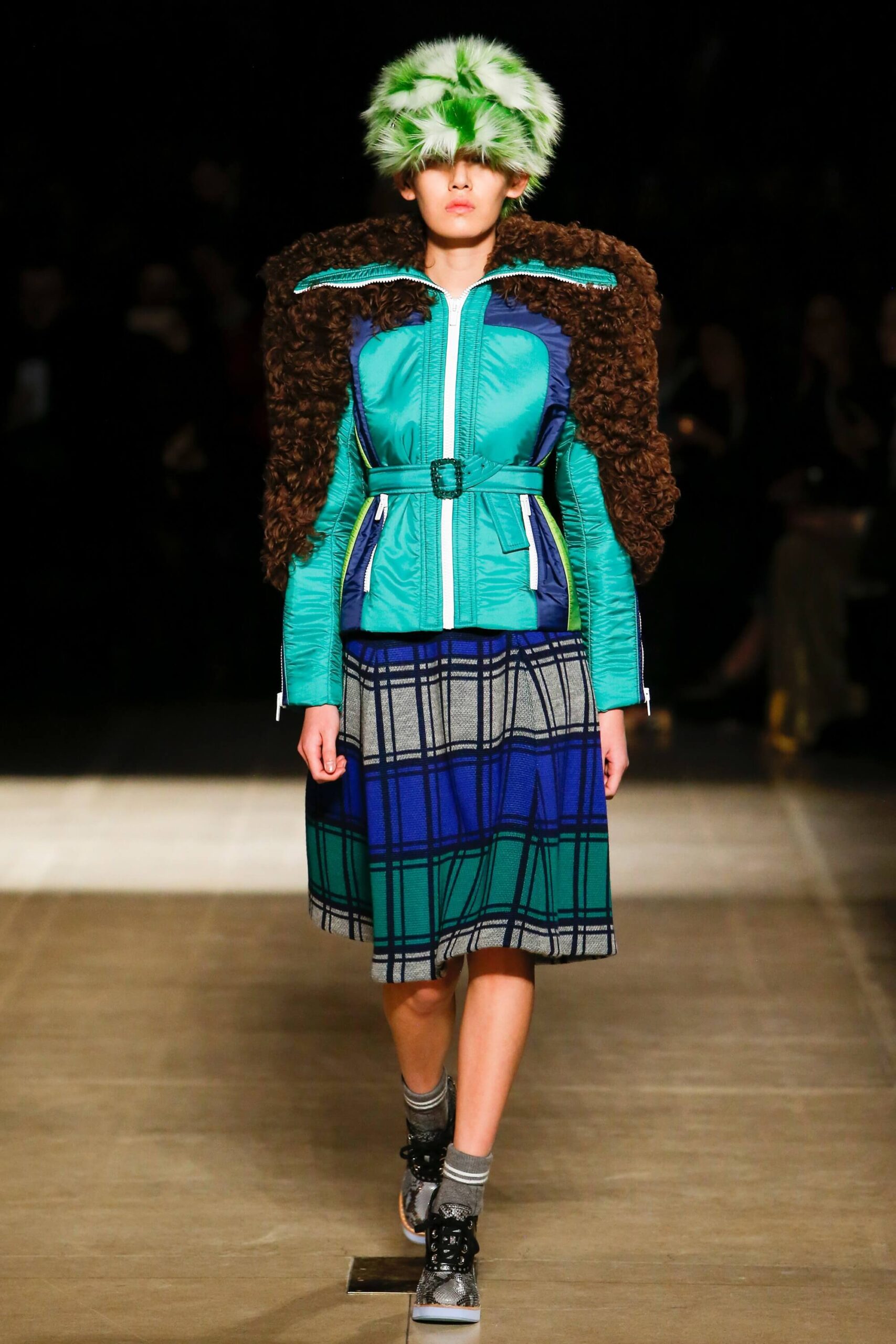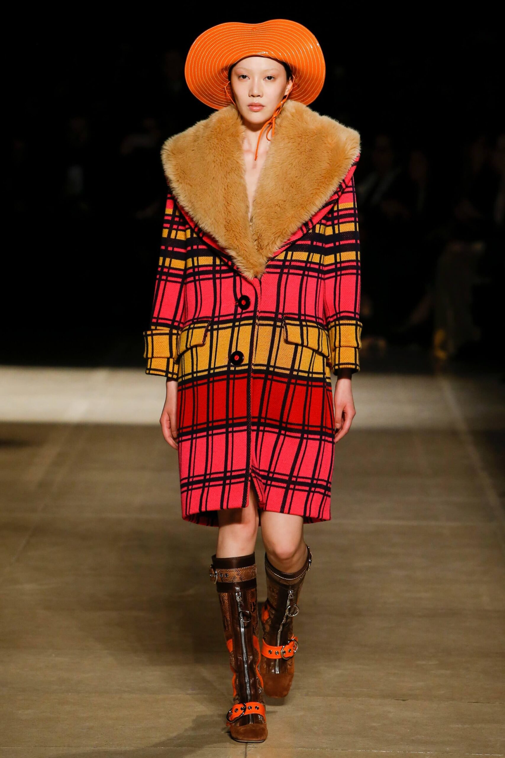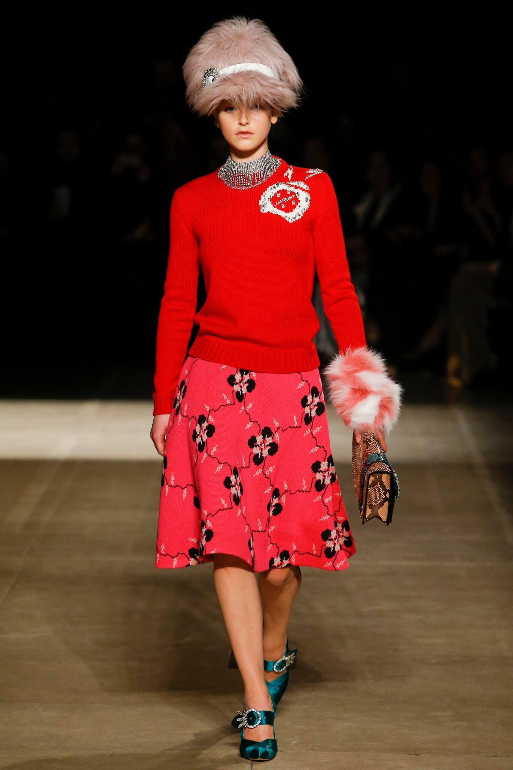 We will begin with the staircase for the very fact that when a staircase is entirely upholstered in purple faux fur, it probably bears mentioning. A bit like a purple muppet, though a quick post-show Google actually revealed there are very few purple muppets, apart from an obscure Japanese Sesame Street character called Teena. Either way, we will be, on return to the homeland, journeying to the nearest Hobbycraft, purchasing several yards of faux fur and a staple gun. Well, if Miuccia says so. There were clothes too, of course – very lovely clothes that continued fur-based theme – glorious shawl collared coats, some entirely furry, other becoming transparent macs beneath the collar, puffy stoles, huge furry gloves – all in this rainbow, Care Bear colour palette of soft pastels or sharper greens, reds and purples. Soundtrack was De la Soul and there was certainly what we’ll call a hip-hop “tinge” to this – these hefty varsity jackets, here in soft pastels, furry baker boy hats or these crystal numbers that sat on the chests of tops, a bit like those you might find on a basketball jersey. You know that bright yellow De La Soul album cover with the hand-drawn flowers on it? Well, the collection kind of riffed on that 90s-meets-60s psychedelia – mostly through the prints – cats, telephones, a sort of surfer-y reworking of the Miu Miu logo. Collection finished, like all good things should, with sequins – specifically, ultra-glam mini-dresses trimmed at the edges with crystals. Miuccia, you know us too well.