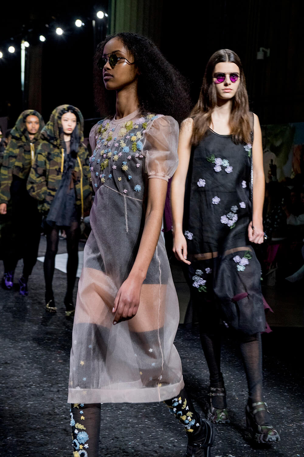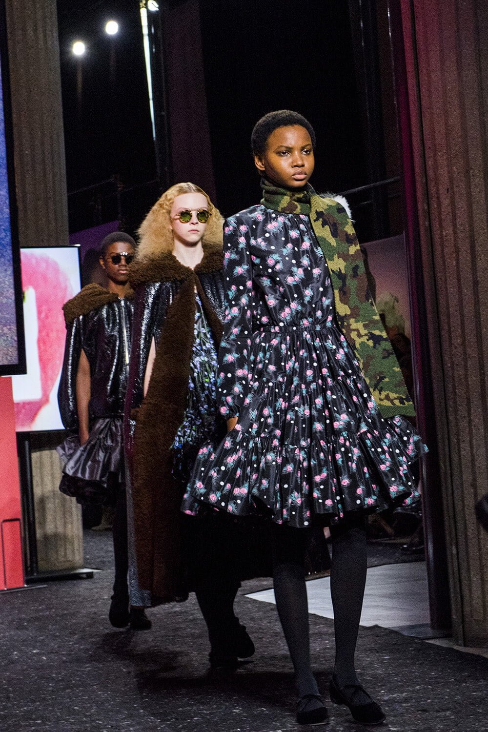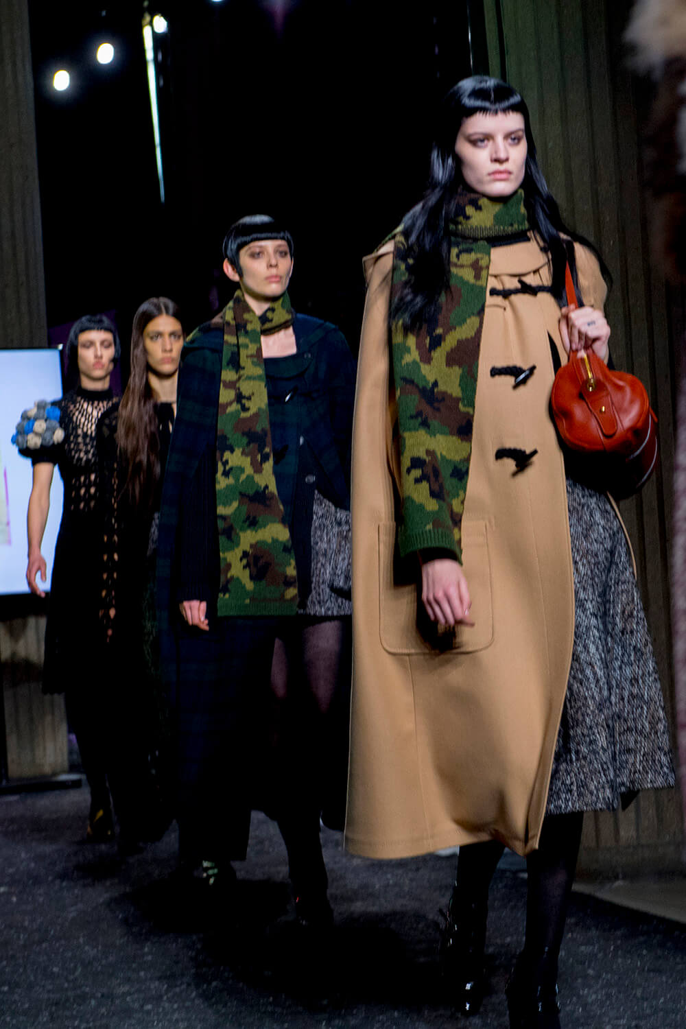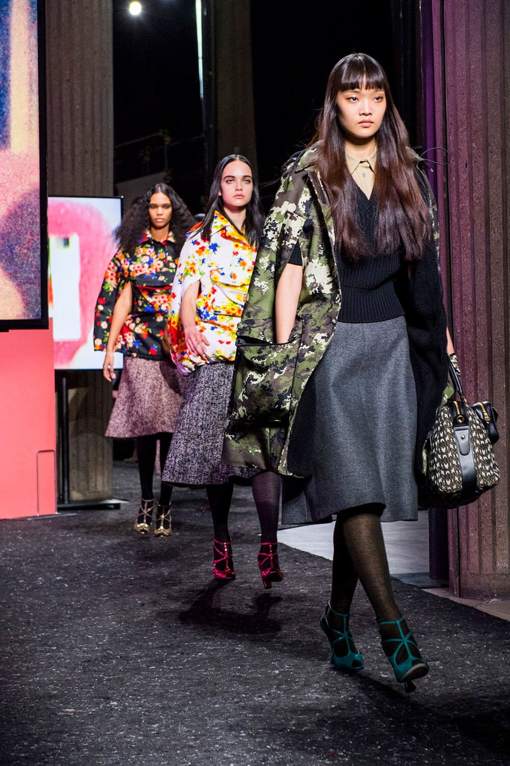 The work of the London-based artist and filmmaker Sharna Osborne filled TV and LED screens dotted around the Miu Miu show space in Paris, yesterday afternoon. Osborne’s work shifts between the moving image and the still: she creates freeze-frames and operates at the bleeding edge. Baby-dolls and black voile cap-sleeved dresses, your dad’s cardi and a camo-print fleece; just a handful of some serious heirloom sparkles and your gran’s bag. These were just a few of the normally disparate wardrobes of various women at various points in their lives brought together at Mrs Prada’s knockout Miu Miu show.
